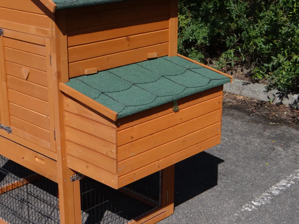 - Das Dach dieses Kaninchenstalls ist mit Dachpappe versehen.