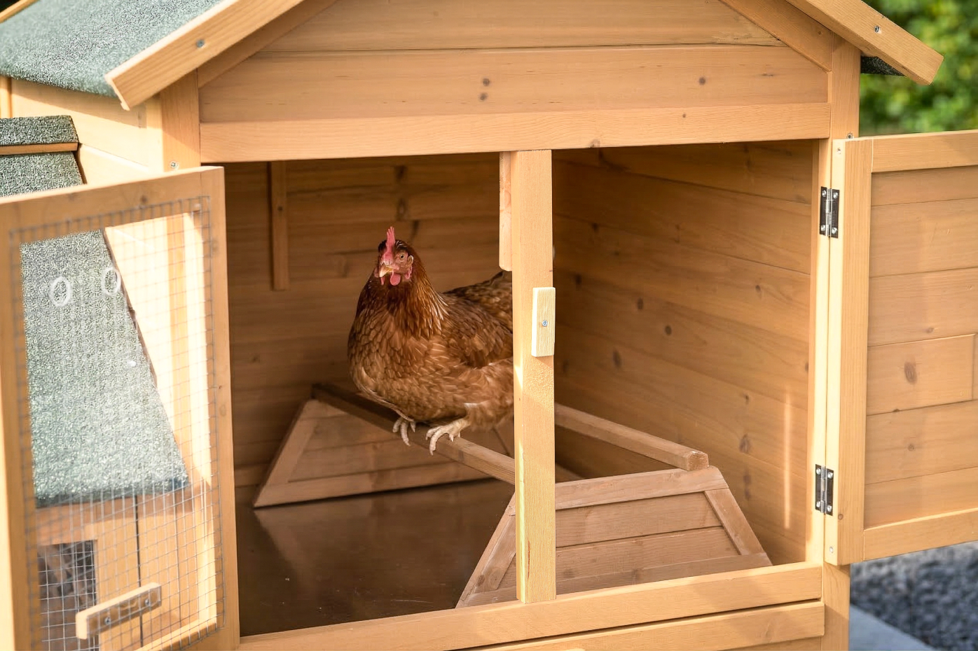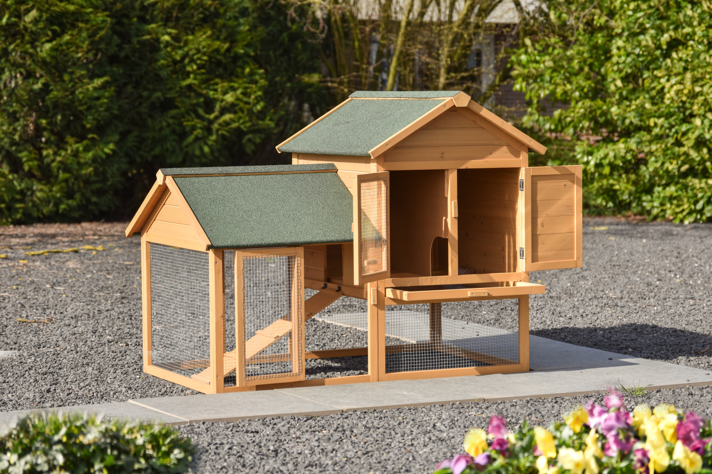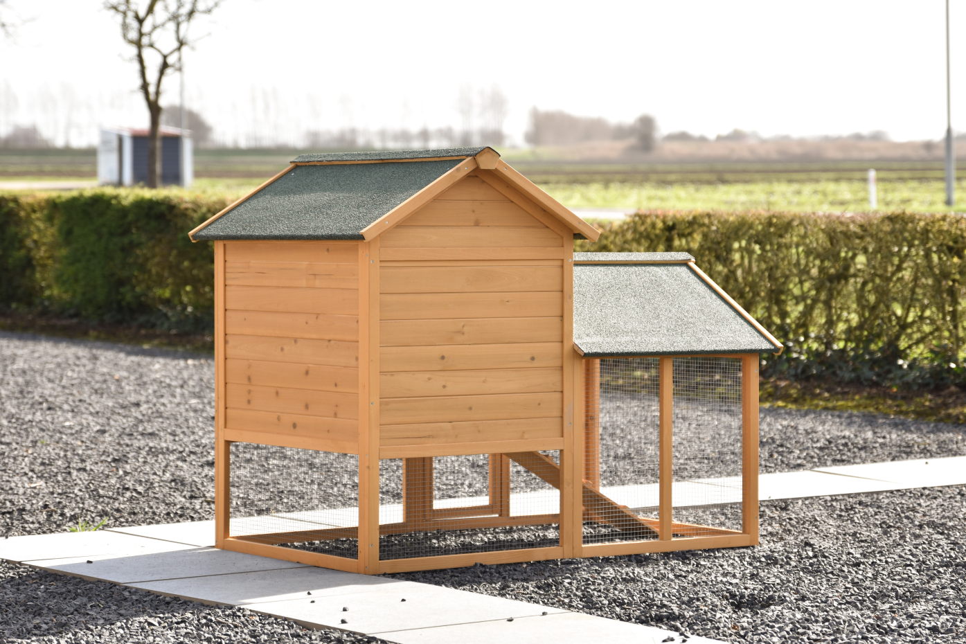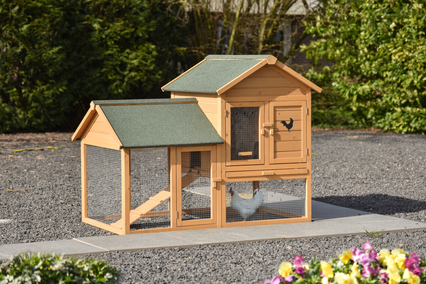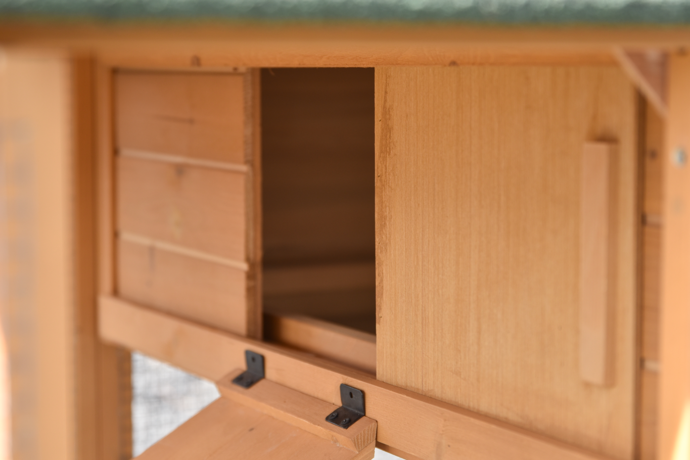 Das Dach ist mit Dachpappe versehen und bietet zusätzlichen Schutz vor Regen. Die Gittertür ist mit einer Plexiglasscheibe ausgestattet, die zusätzlichen Schutz bietet. Die Holztür mit einer schwarzen Henne als Dekoration verleiht dem Hühnerstall außerdem ein verspieltes und gut erkennbares Detail