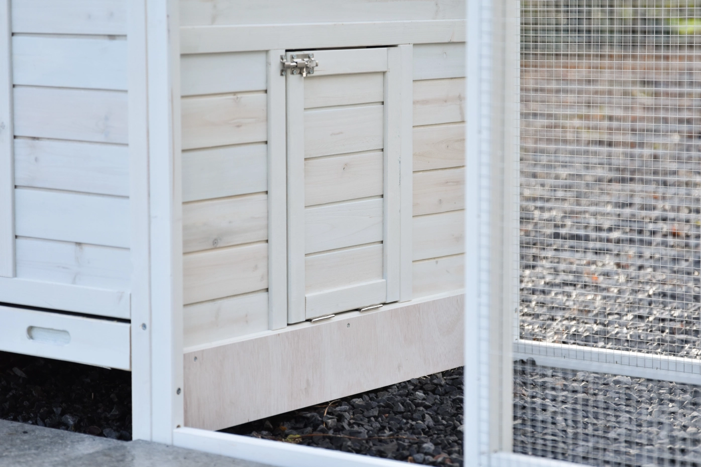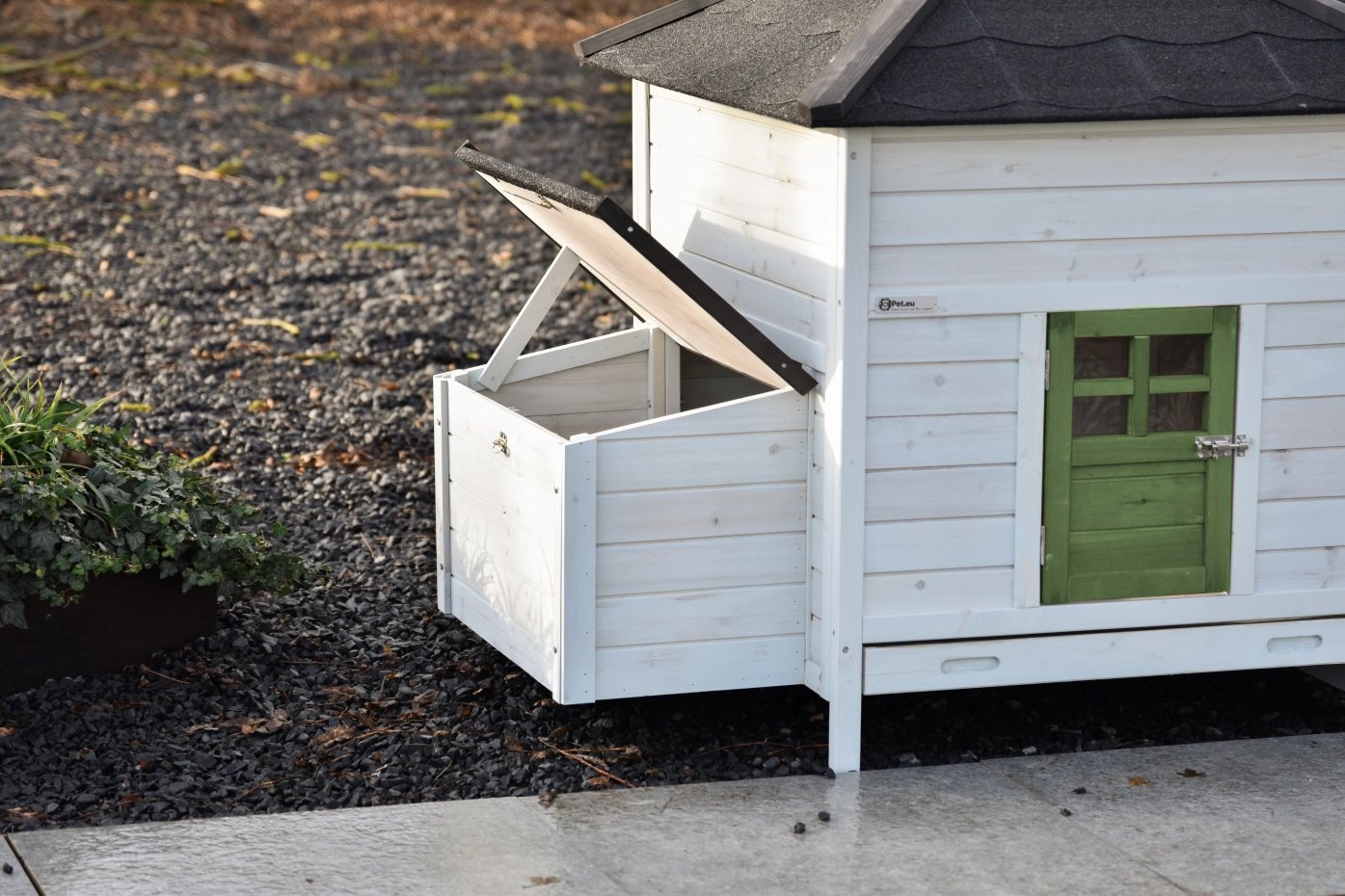 - Dieser Hühnerstall ist mit einem Legenest ausgestattet.