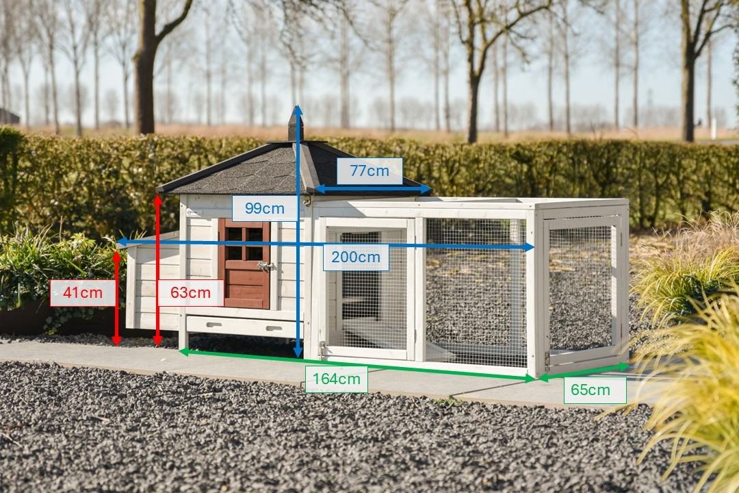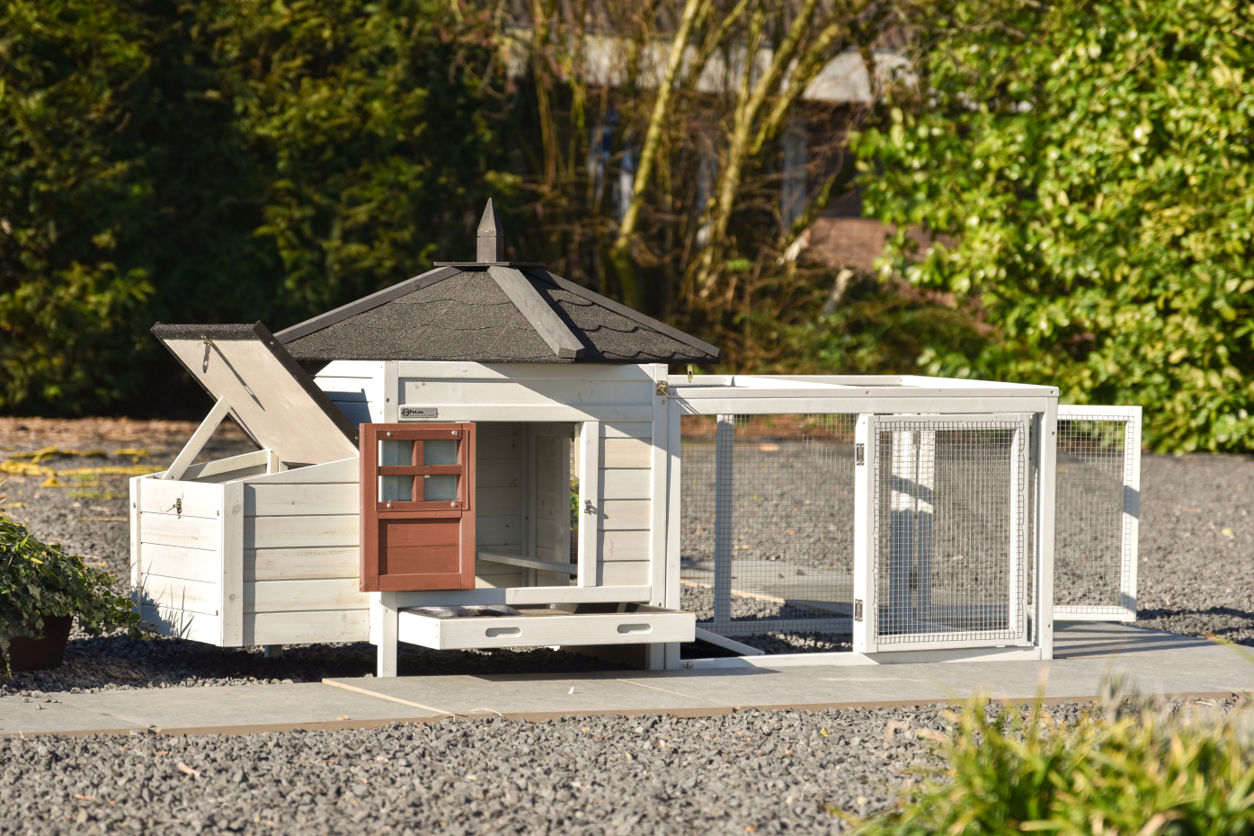 Der Hühnerstall Ambiance Small mit Anbau-auslauf ist praktisch und ansprechend. Er verfügt über eine herausziehbare Schublade und ein abnehmbares Dach für einfache Wartung. Der Auslauf kann mit zusätzlichen Gehegen erweitert werden. Dieser Hühnerstall passt in die meisten Gärten und bietet Platz für 4-6 Hühner, abhängig von ihrer Größe.