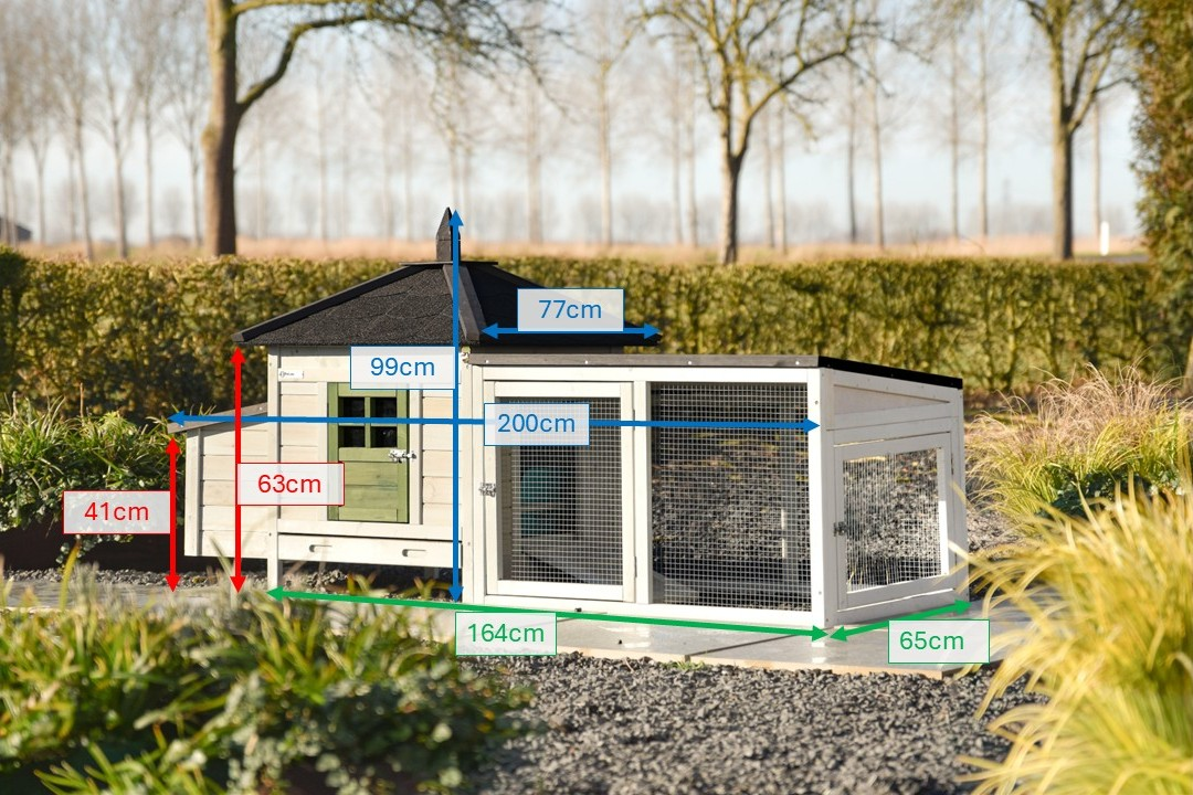 Die maximalen Außenmaße des Ambiance Small Hühnerhauses mit Gehege betragen 200 × 77 × 99 cm (B × T × H).