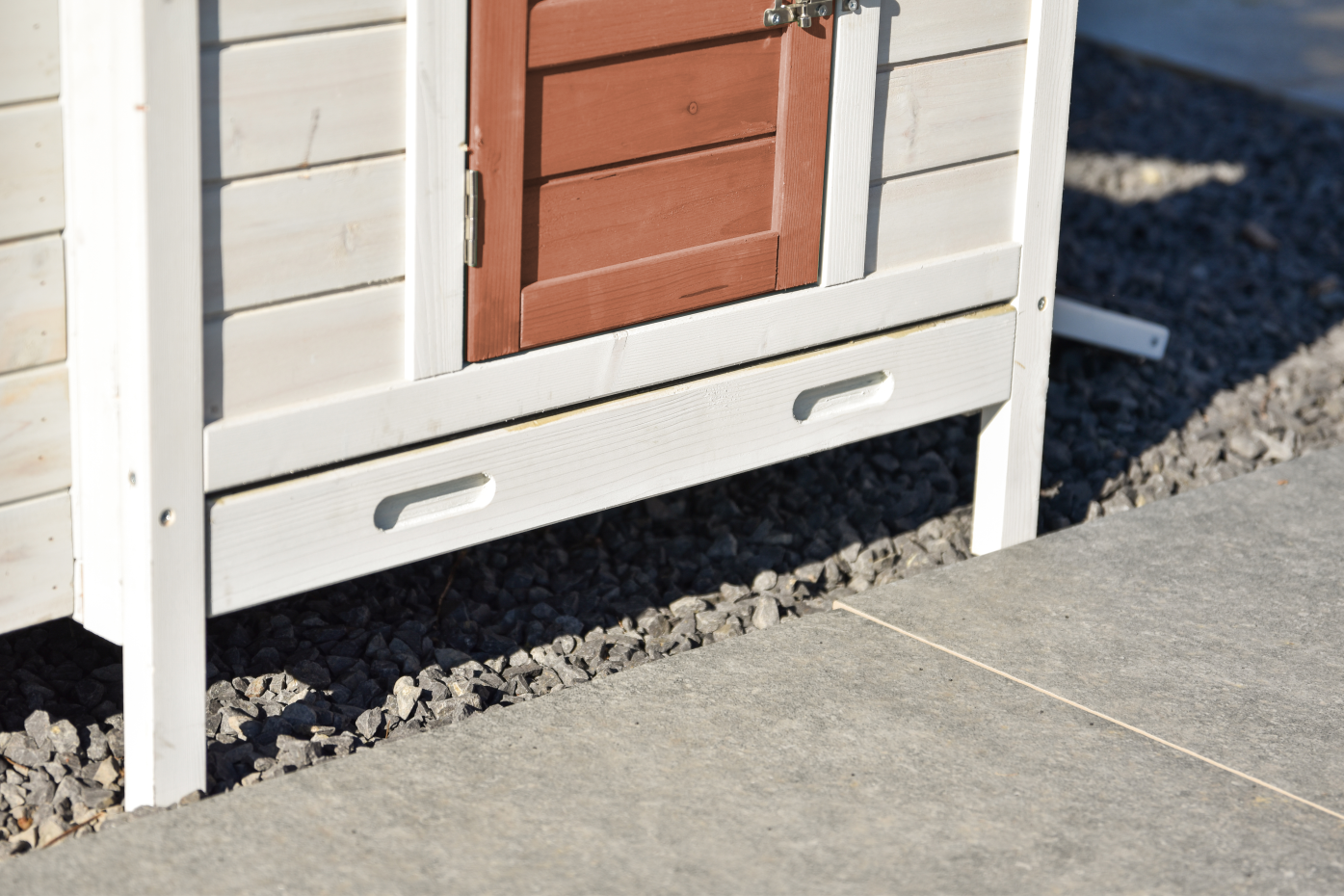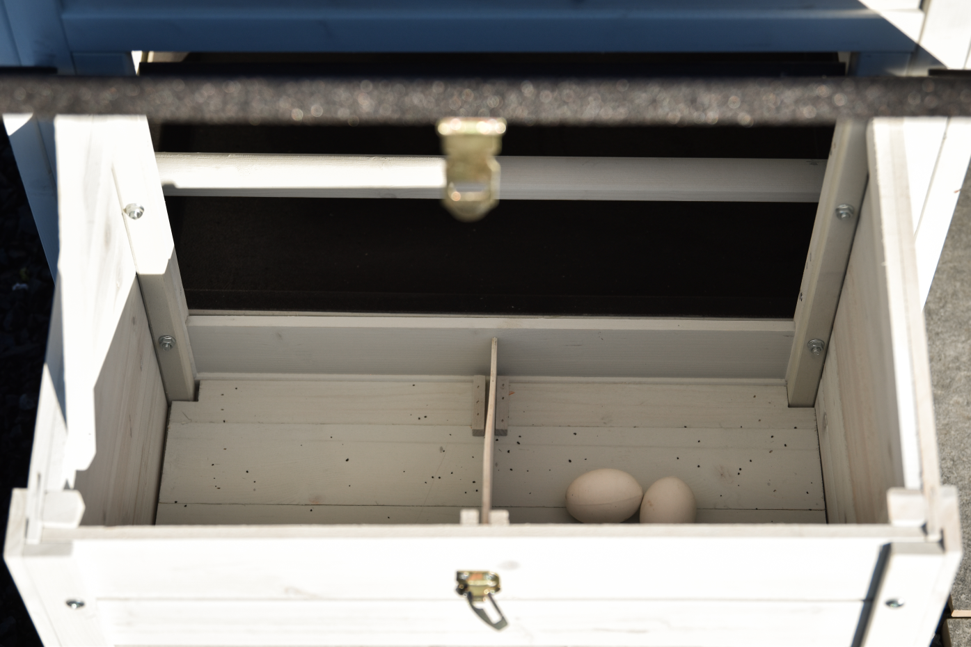 - Dieser Hühnerstall ist mit einem Legenest ausgestattet.