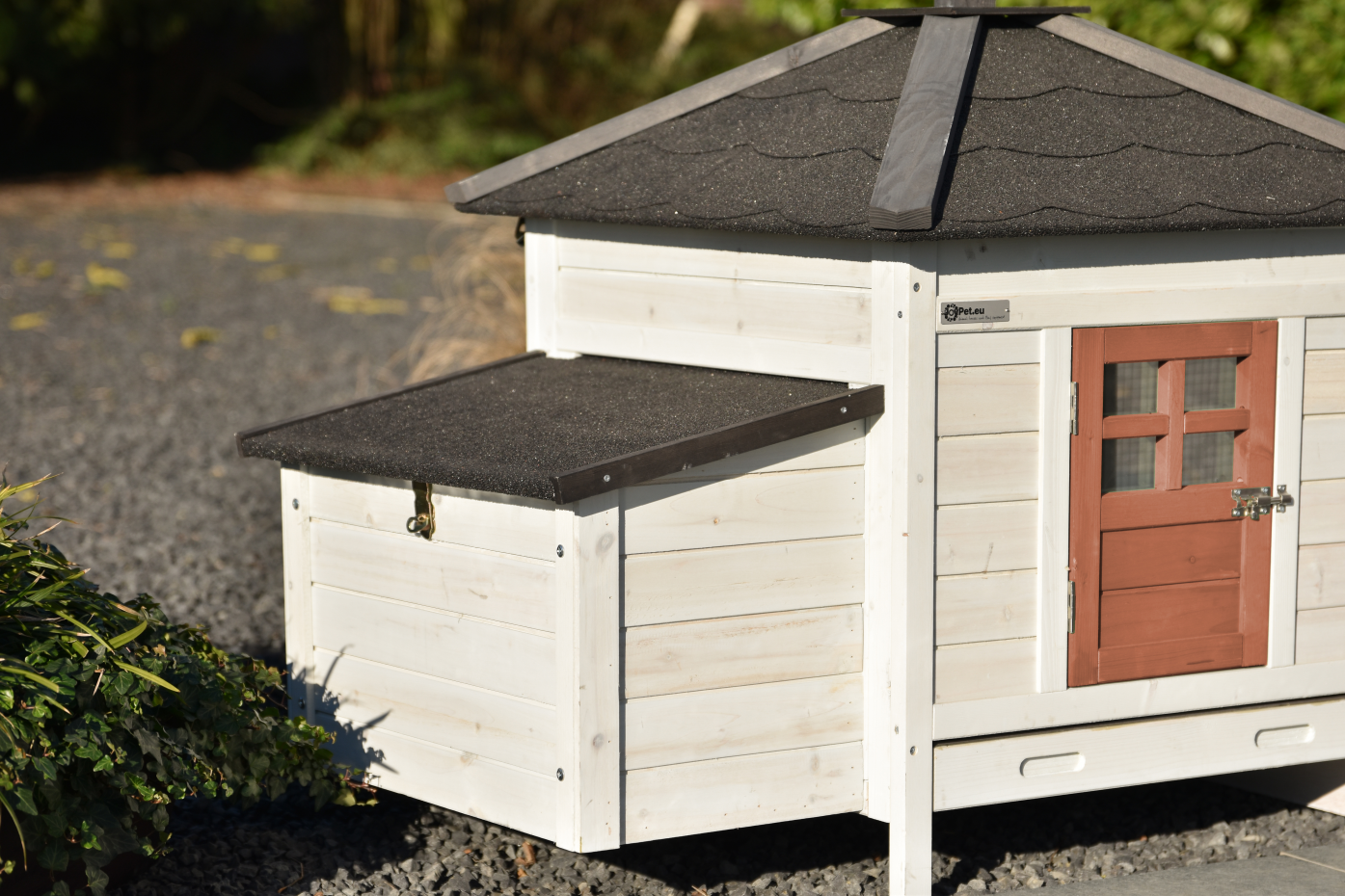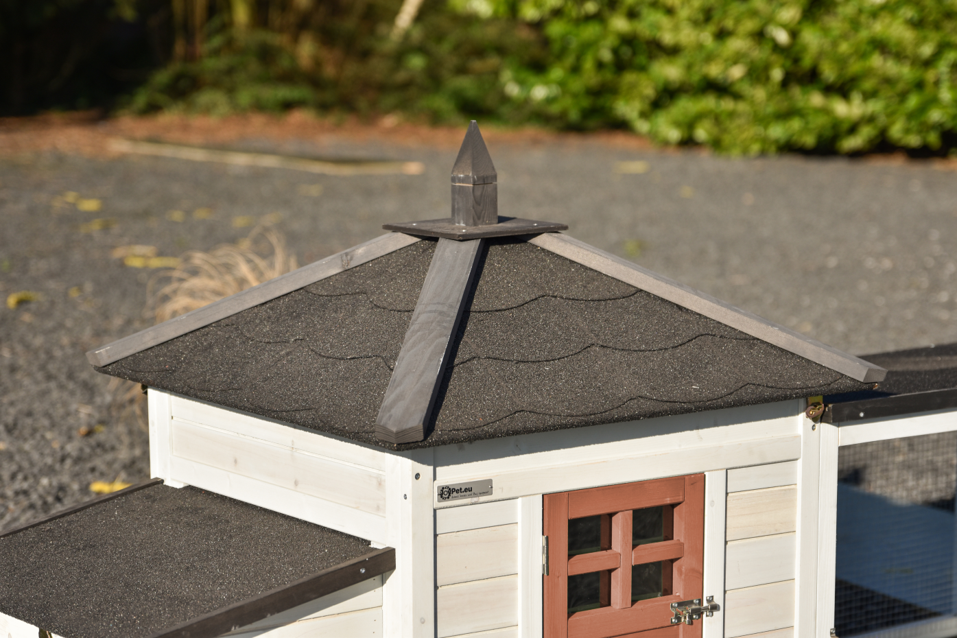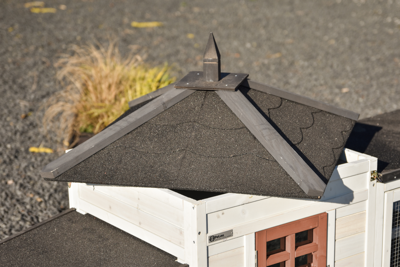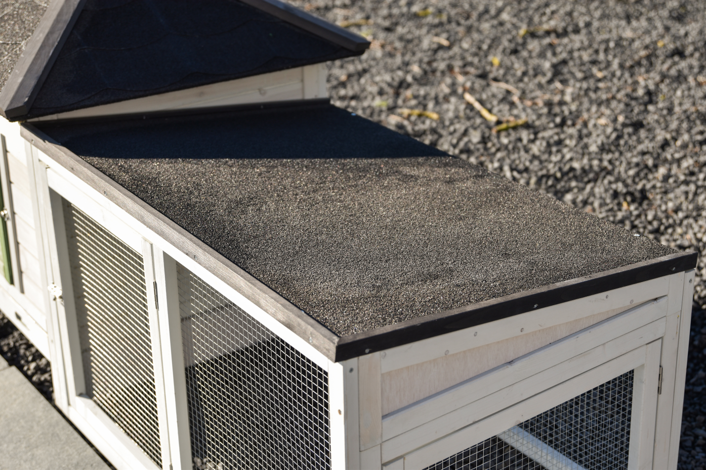 - Das Dach dieses Kaninchenstalls ist mit Dachpappe versehen.