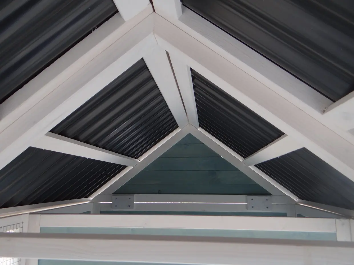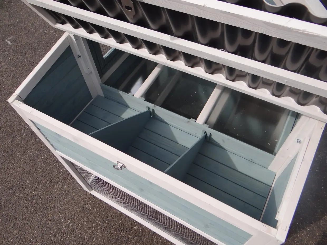 • Das Dach dieses Kaninchenstalls ist von Kunststof.