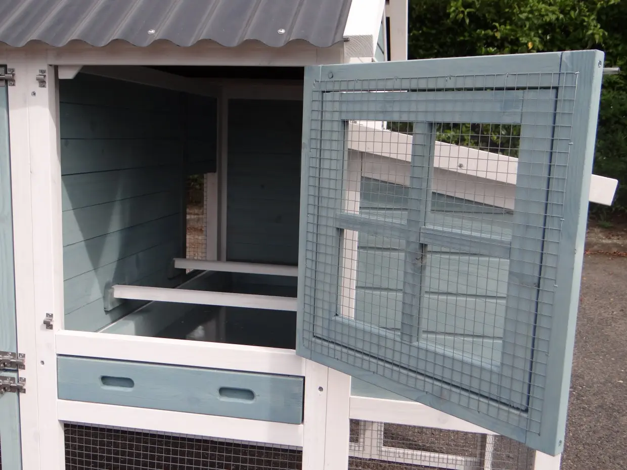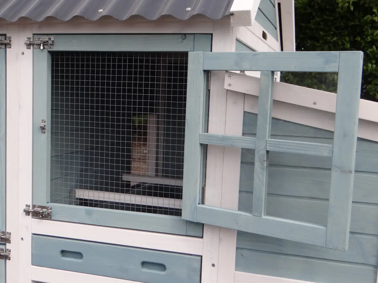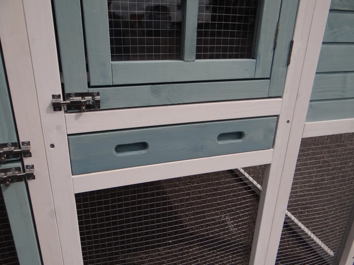 • Die Türen dieses Kaninchenstalls sind mit doppelten Schieberiegeln ausgestattet