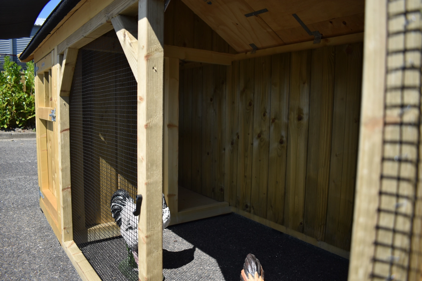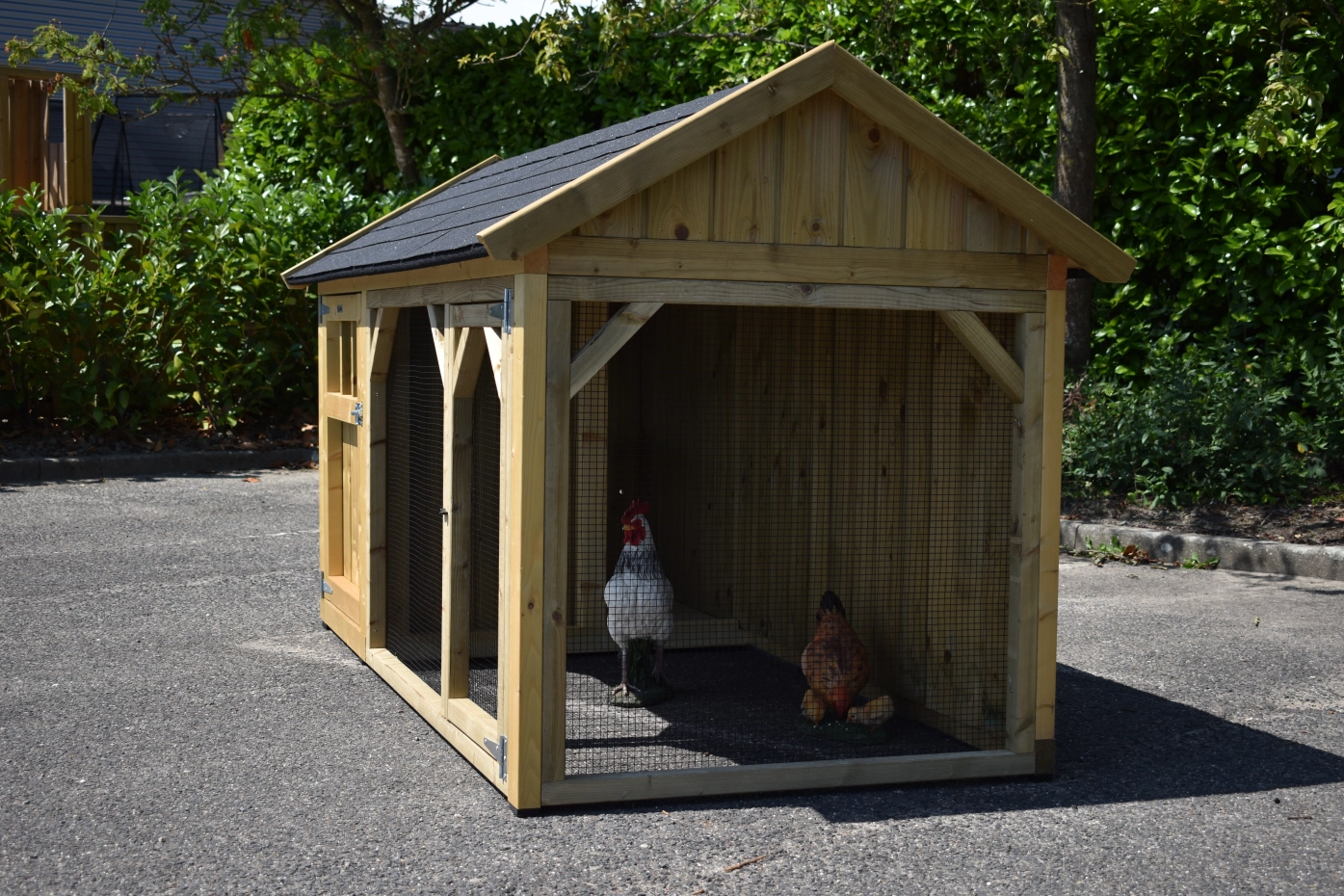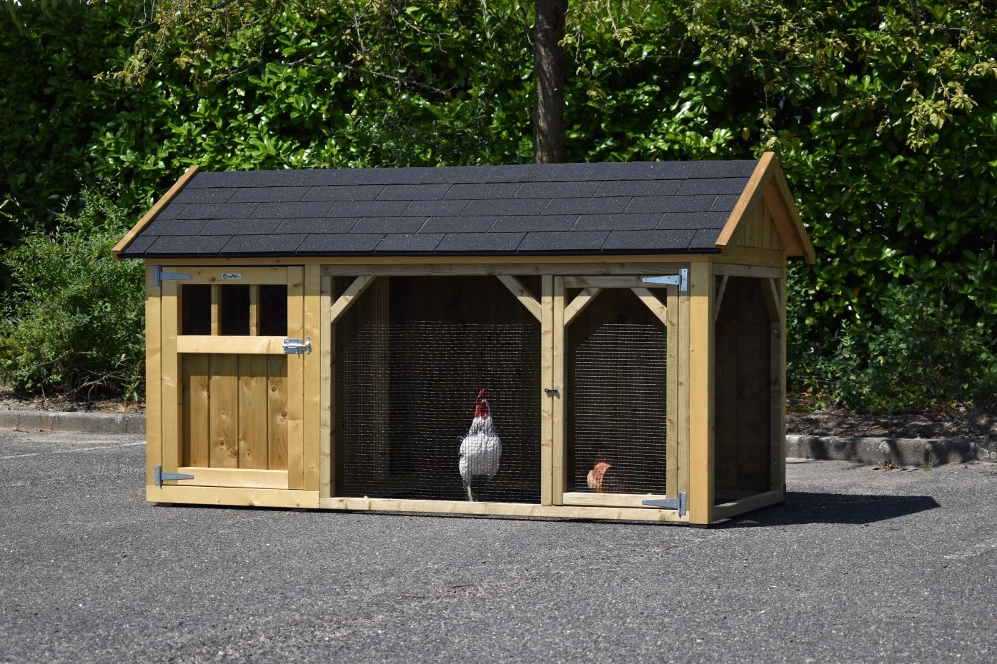 Hühnerstall Belle 2 mit ein Spitzdach ist ein schöne Hühnerstall mit ein überdachte Auslauf. Diese Stall hat 2 Gitterpaneele. Der Schlafraum ist ausgestattet mit ein Legekiste, Sitzstangen und ein Boden aus imprägniertes Holz. Wir herstellen diese Stall selbst! Durch die Verwendung von hochwertiger Materialien ist sie sehr wartungsfrei.