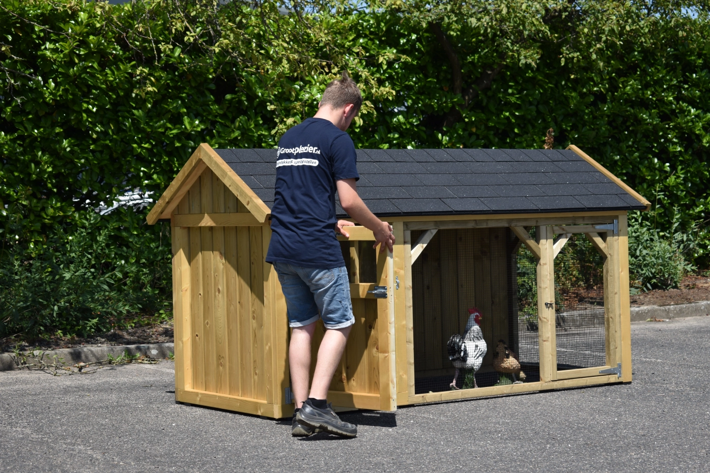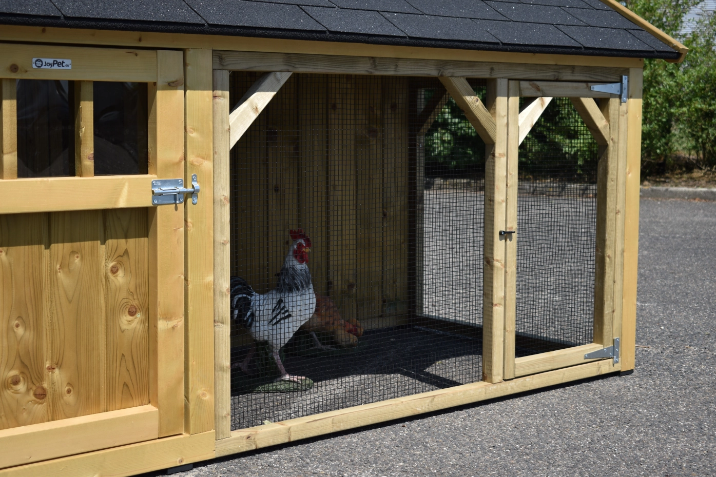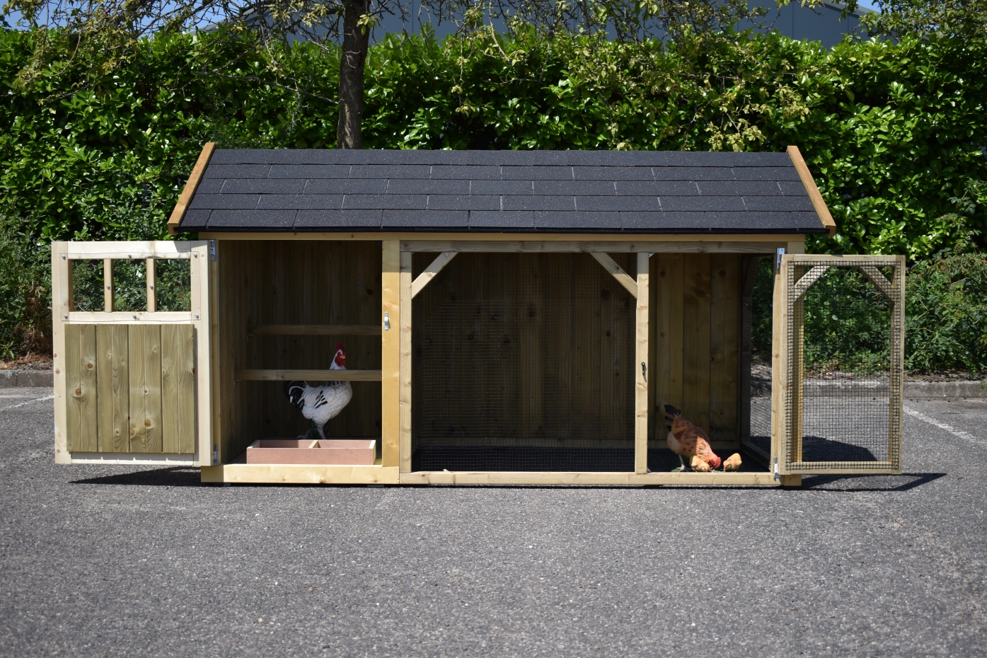 Hühnerstall Belle 2 mit ein Spitzdach ist ein schöne Hühnerstall mit ein überdachte Auslauf. Diese Stall hat 2 Gitterpaneele. Der Schlafraum ist ausgestattet mit ein Legekiste, Sitzstangen und ein Boden aus imprägniertes Holz. Wir herstellen diese Stall selbst! Durch die Verwendung von hochwertiger Materialien ist sie sehr wartungsfrei.