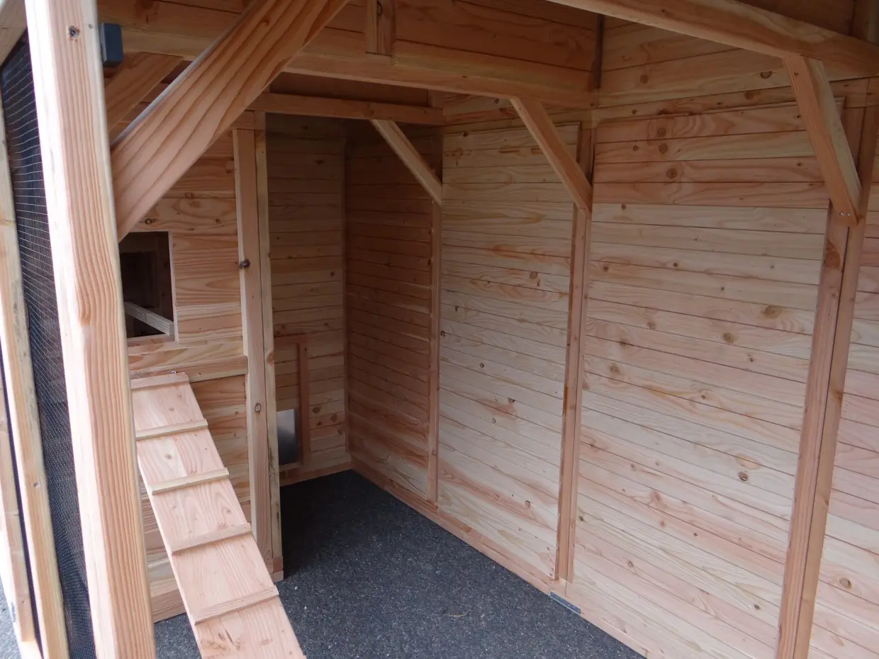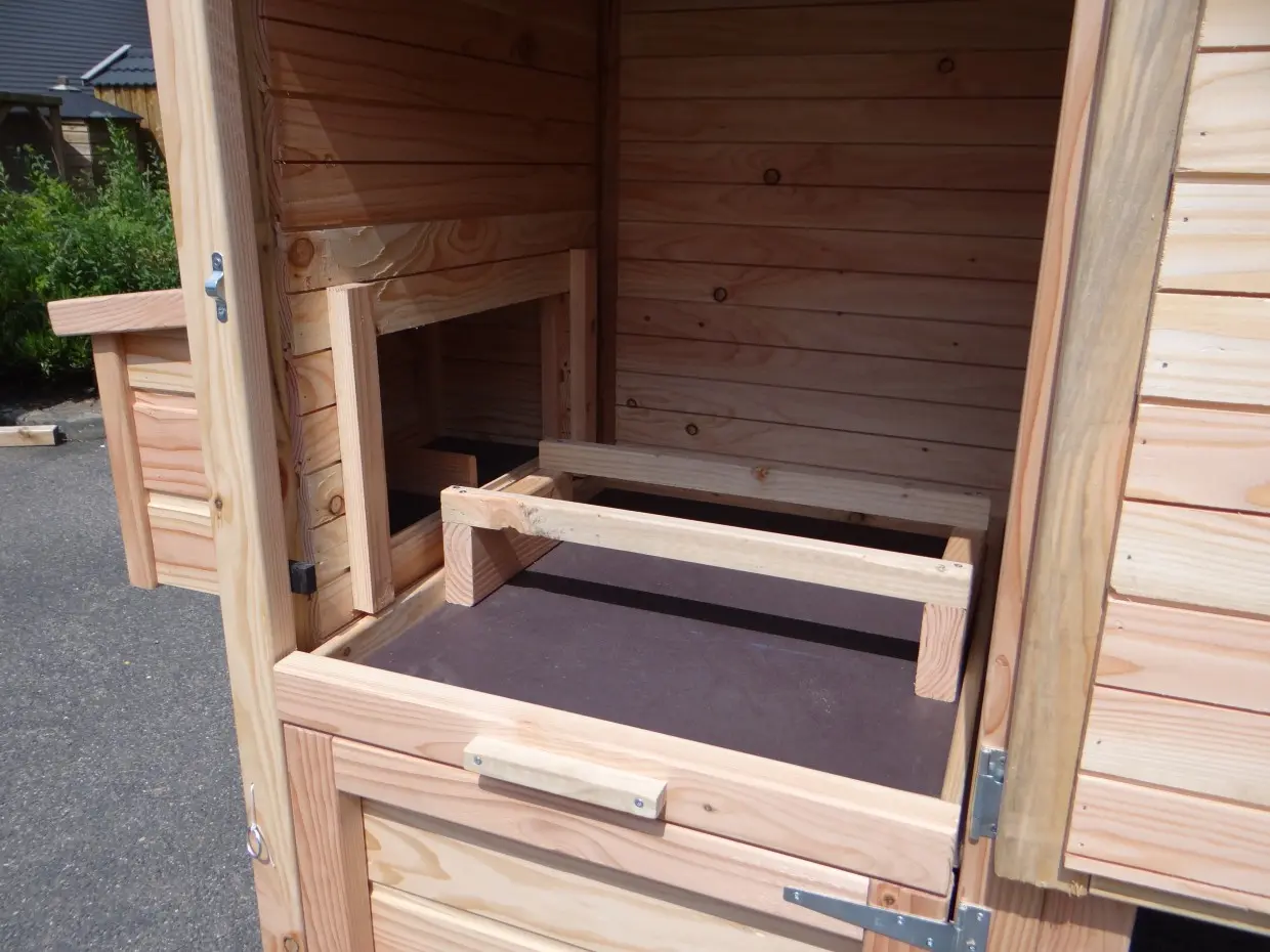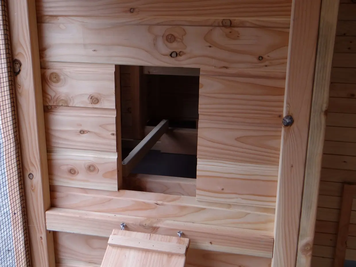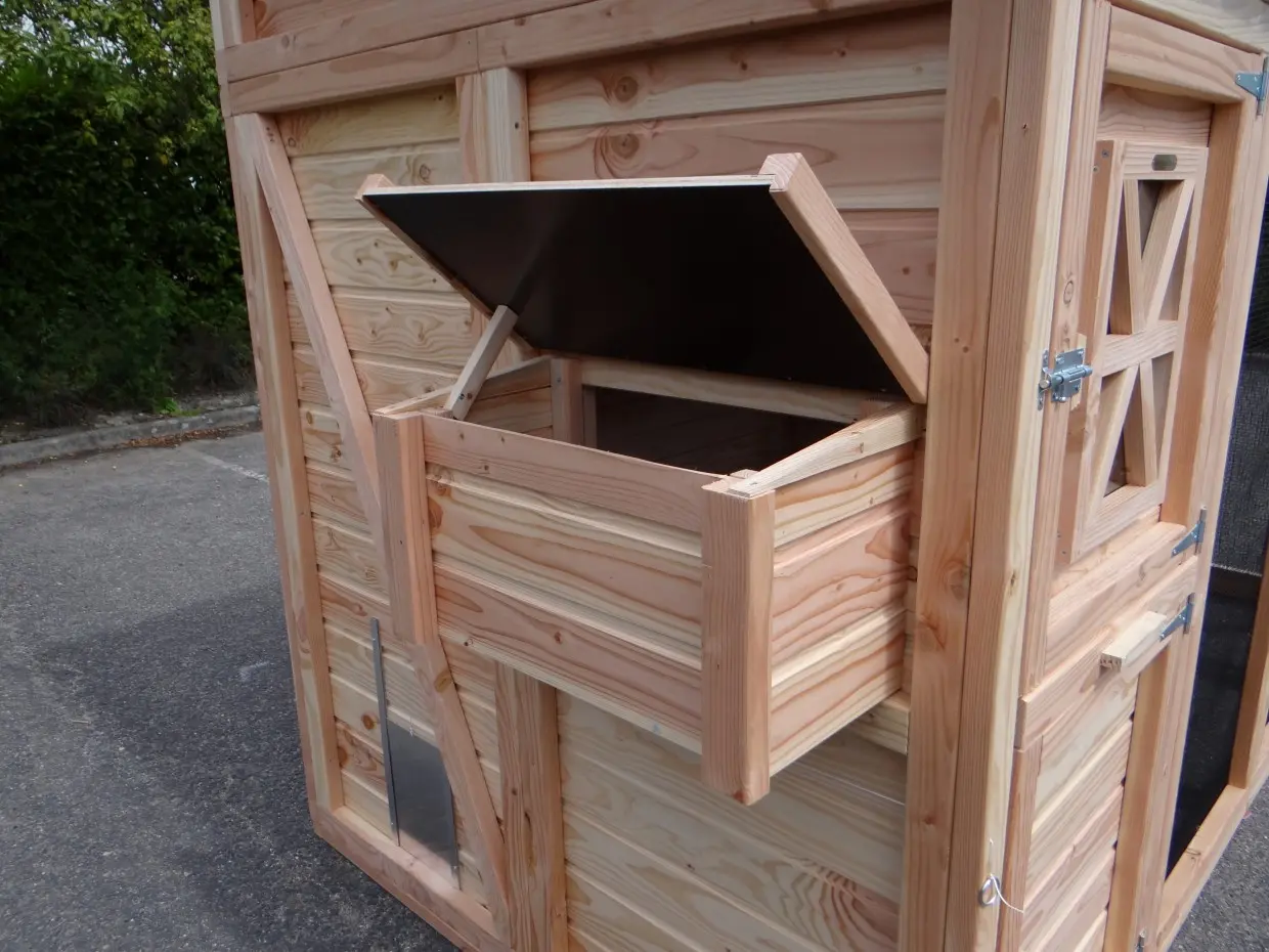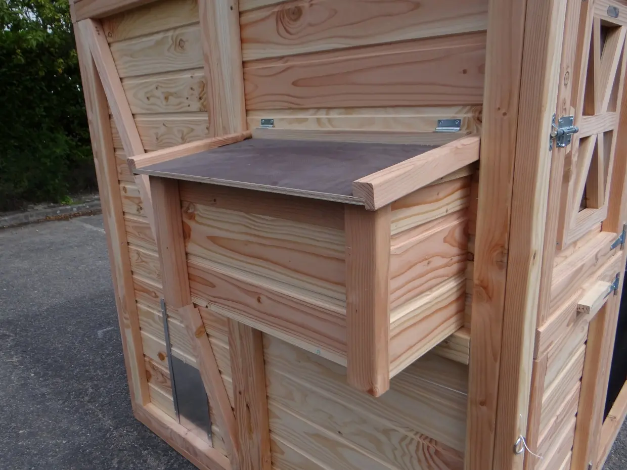 - Dieser Hühnerstall ist mit einem Legenest ausgestattet.