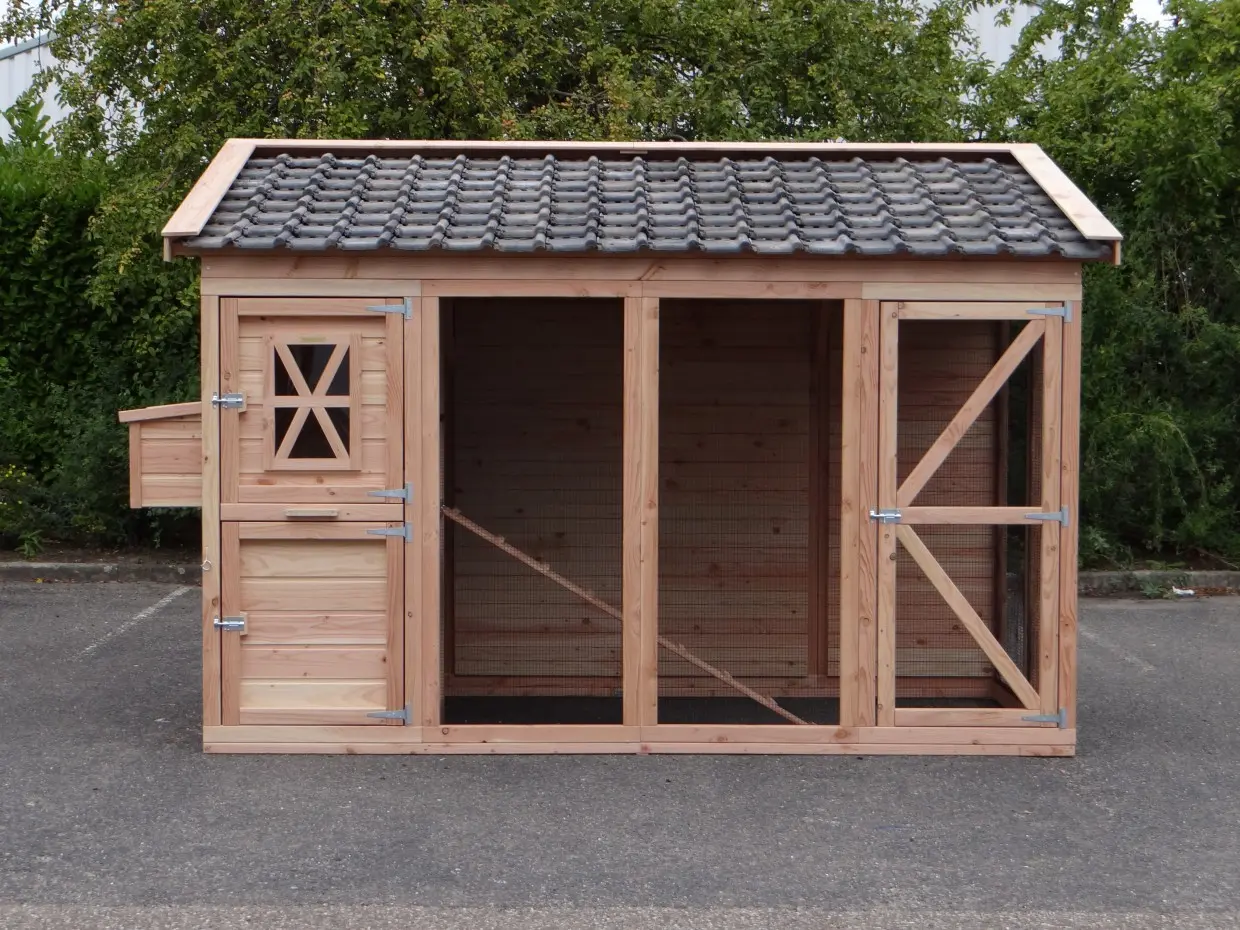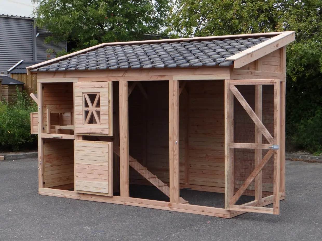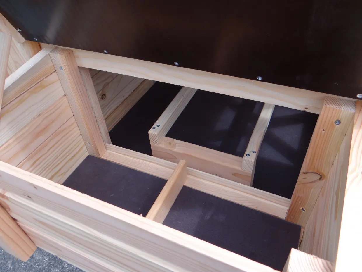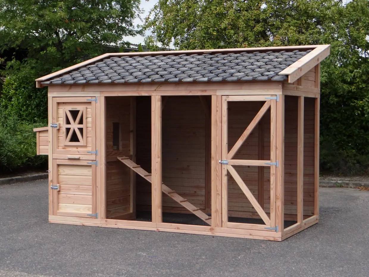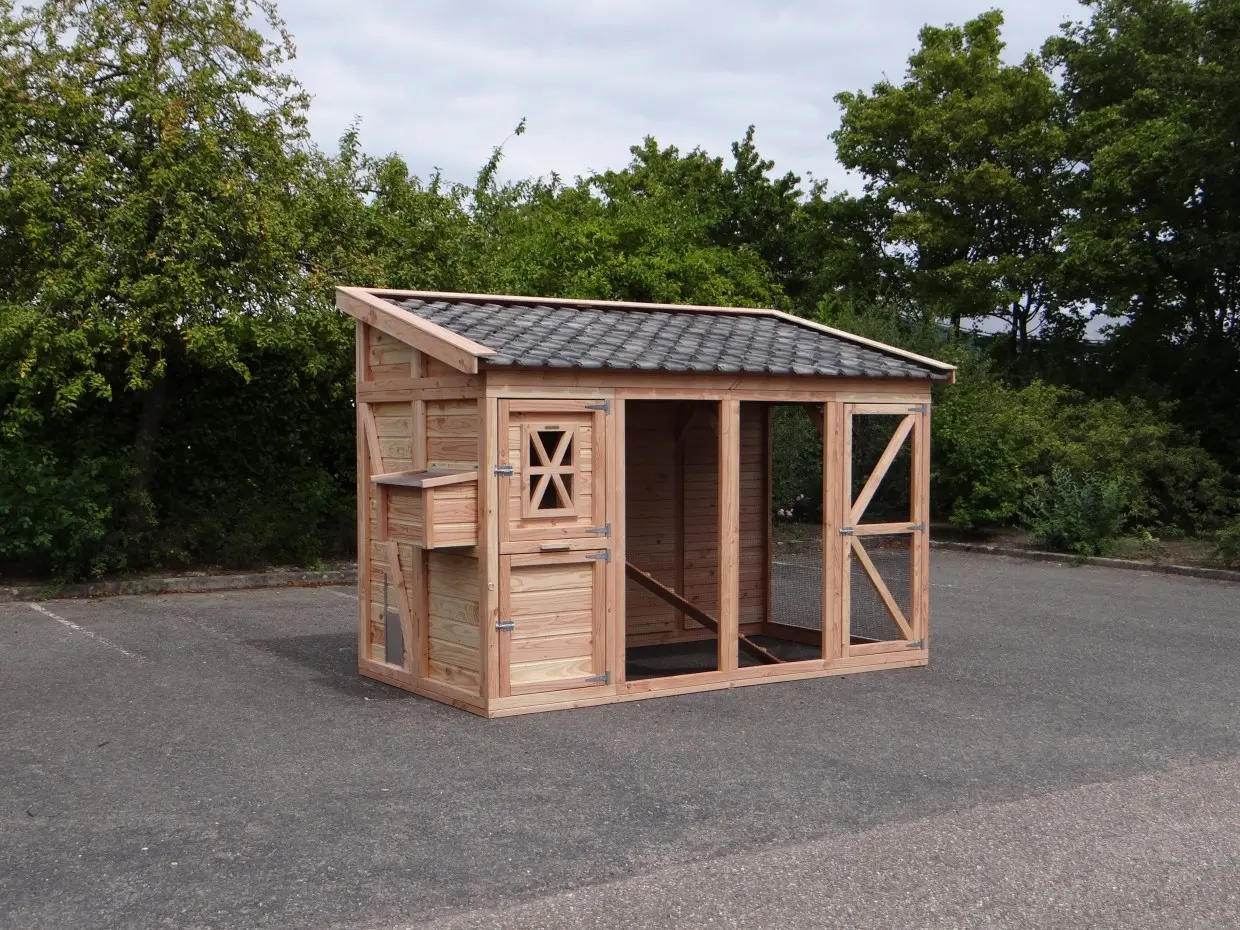 - Dieser Hühnerstall ist mit einem Legenest ausgestattet.