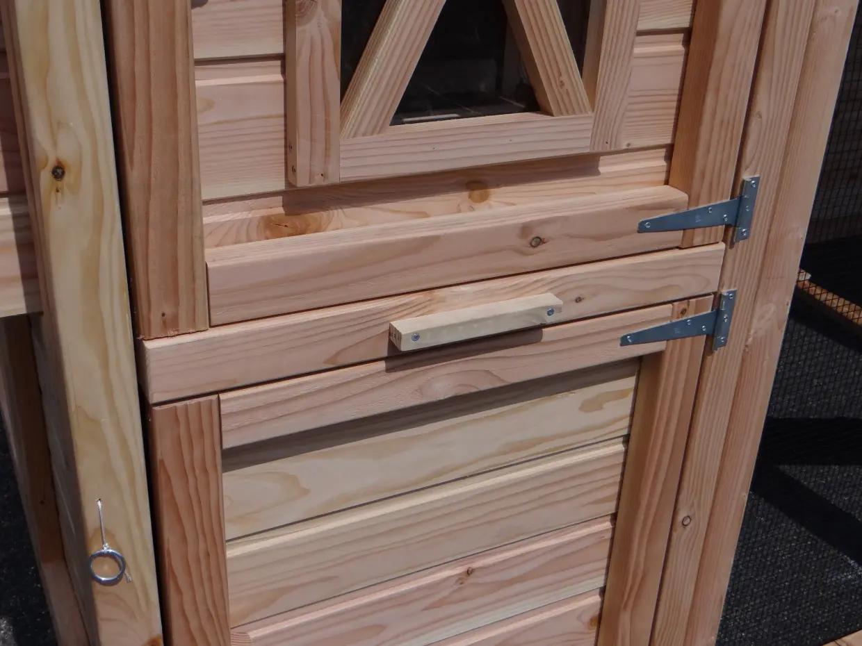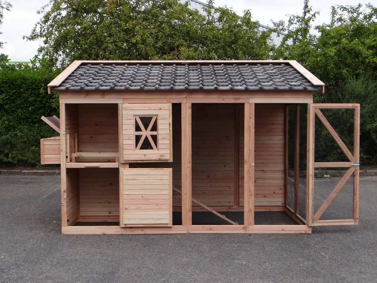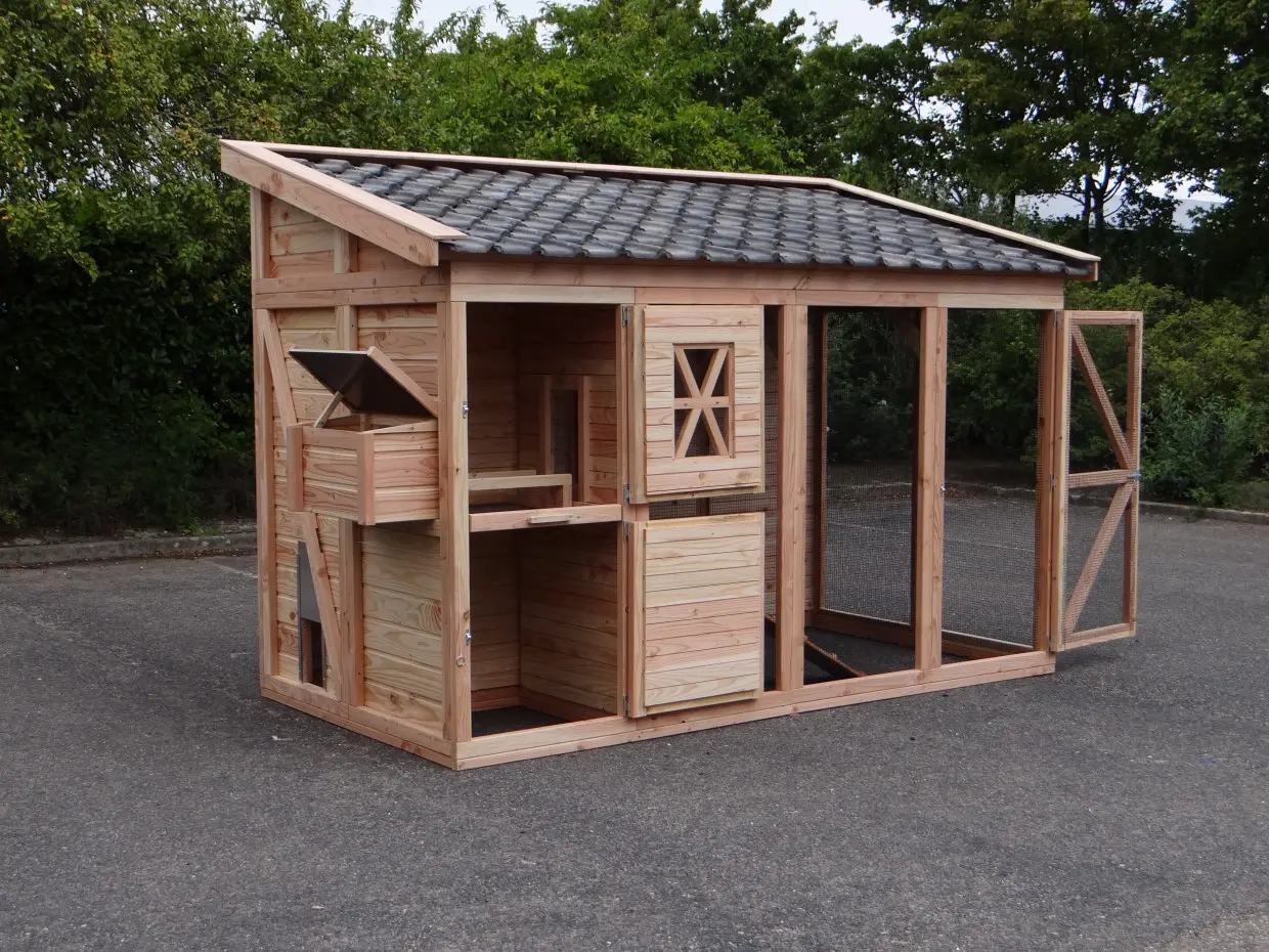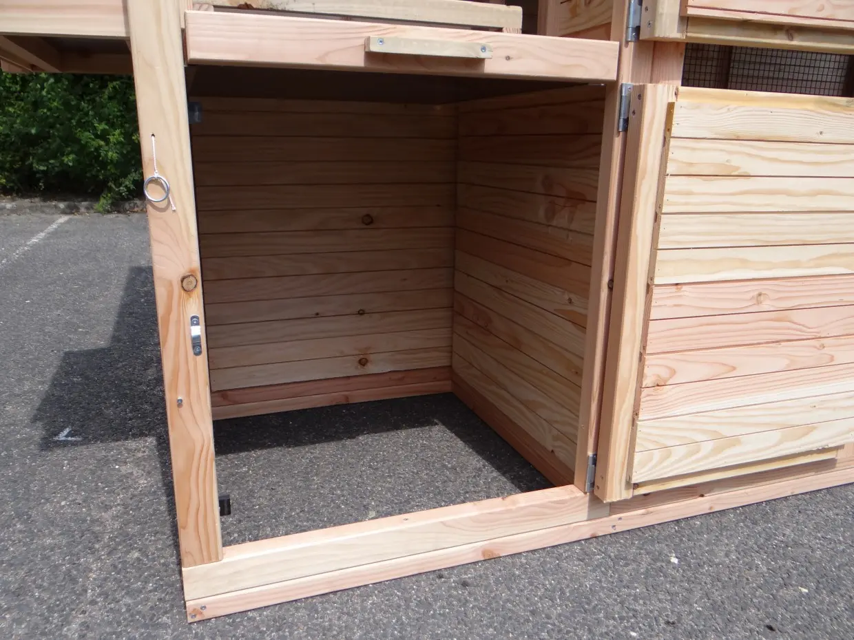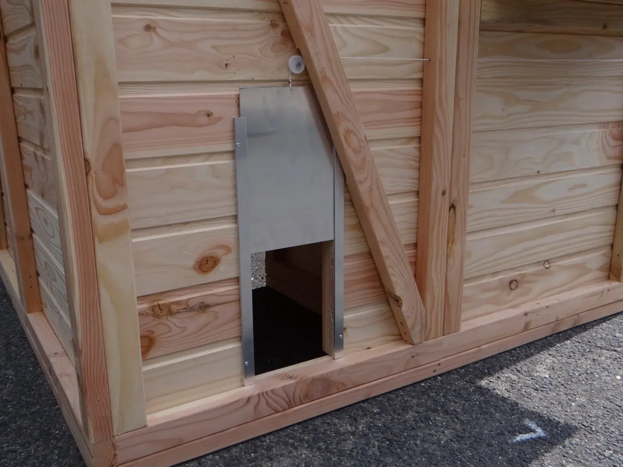 - Dieser Hühnerstall ist mit einem Legenest ausgestattet.