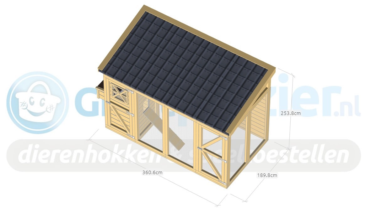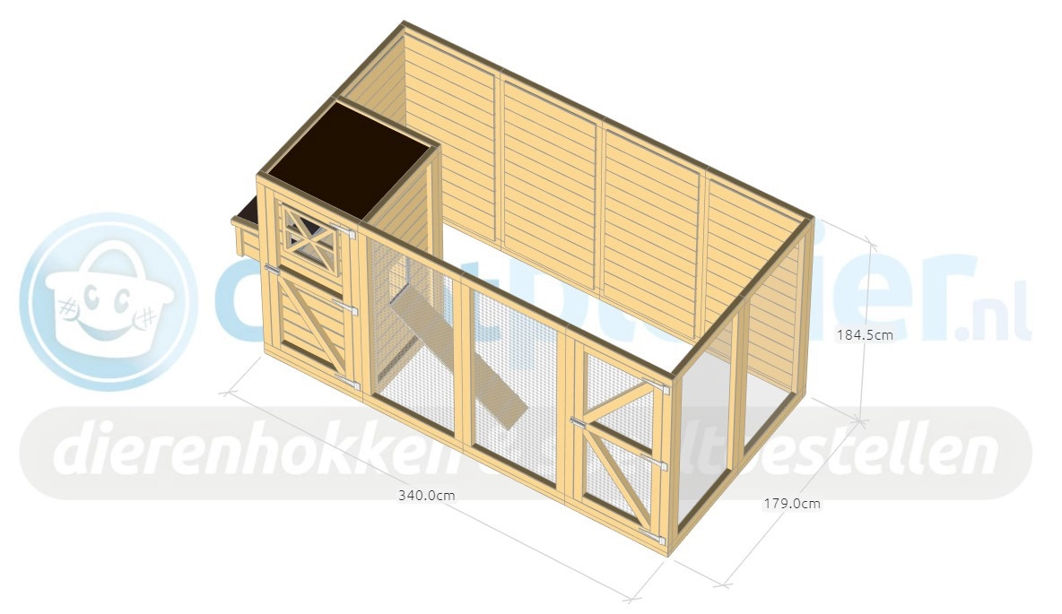 - Der Stall besteht aus Paneelen von 180x85cm und 180x120cm. Die Paneele werden mit Schrauben miteinander verbunden. Bohrer, Schrauben und Bits sind im Lieferumfang enthalten.