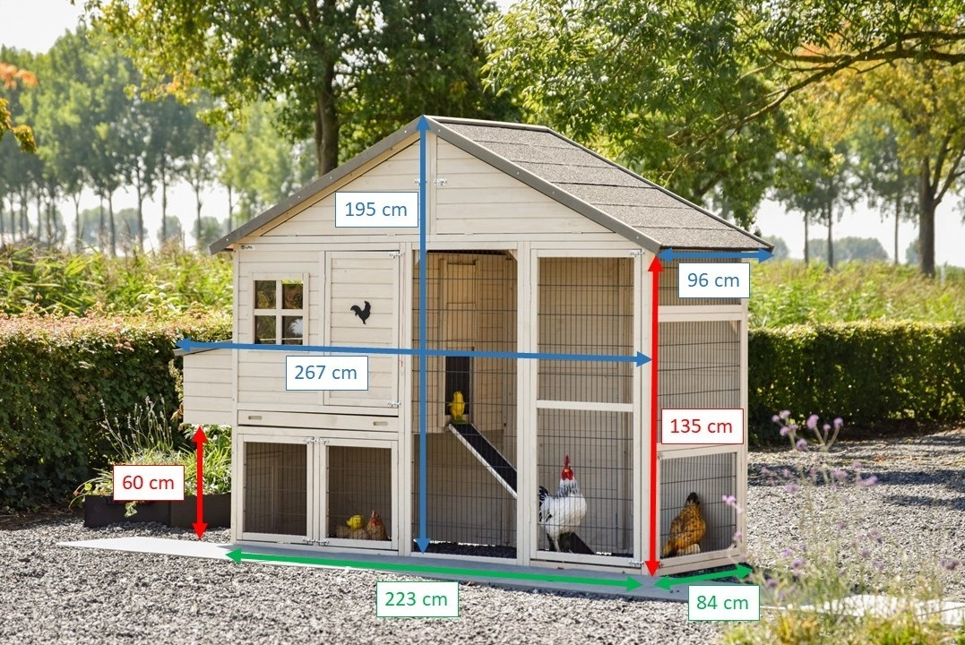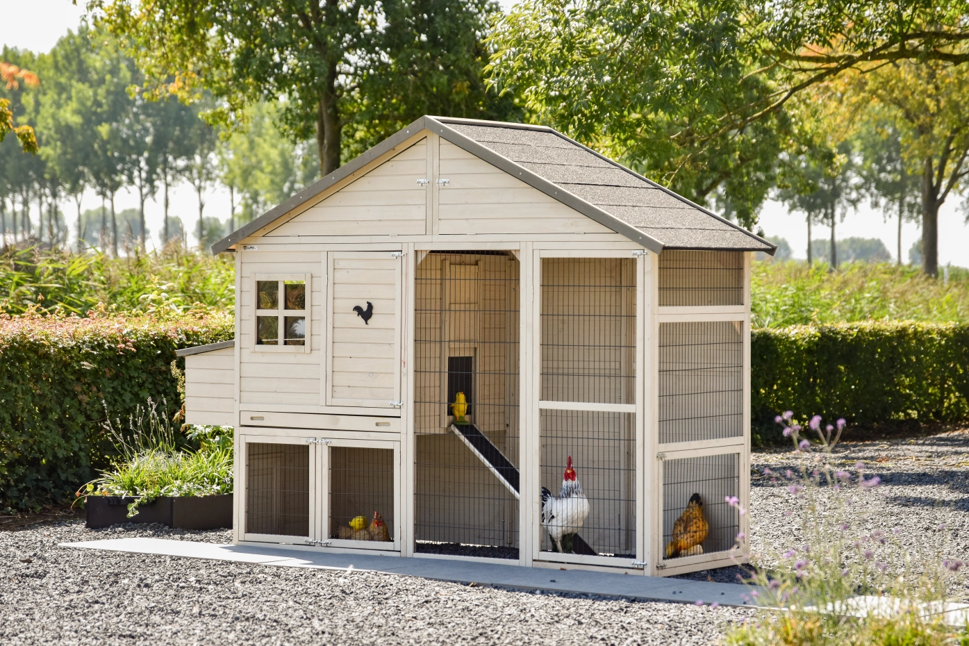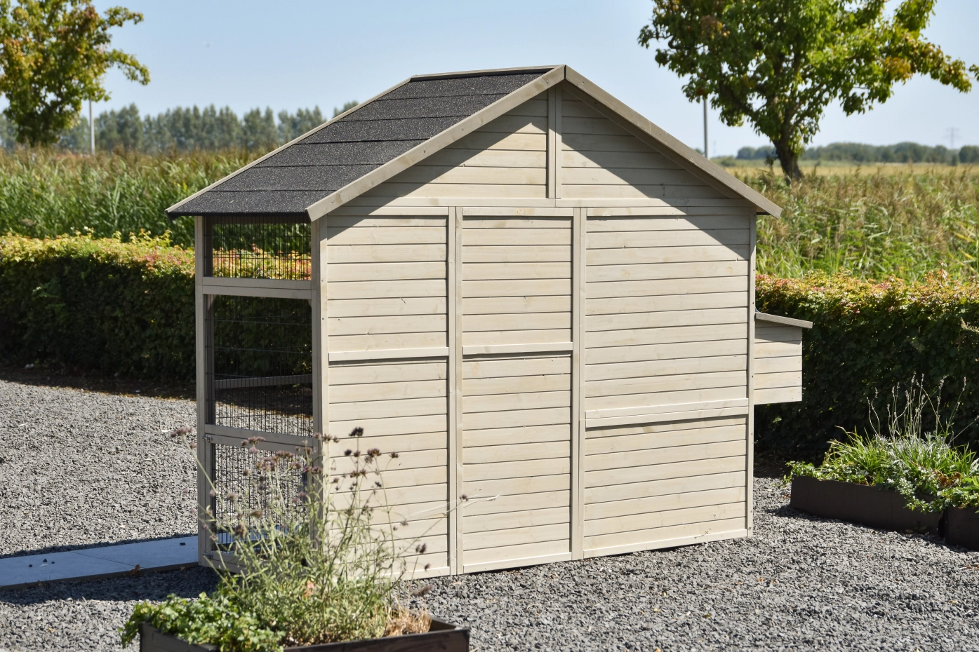 Ein großes Hühnerhaus kaufen? Das Holiday Large mit Legenest ist ein geräumiges Hühnerhaus, geeignet für etwa 6 bis 10 Hühner. Es ist ein besonders schönes und praktisches Modell, bestehend aus einem Schlafhaus, Dachboden, Legenest und Auslaufgehege.