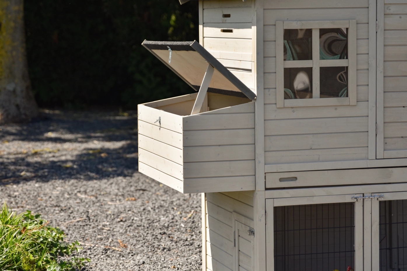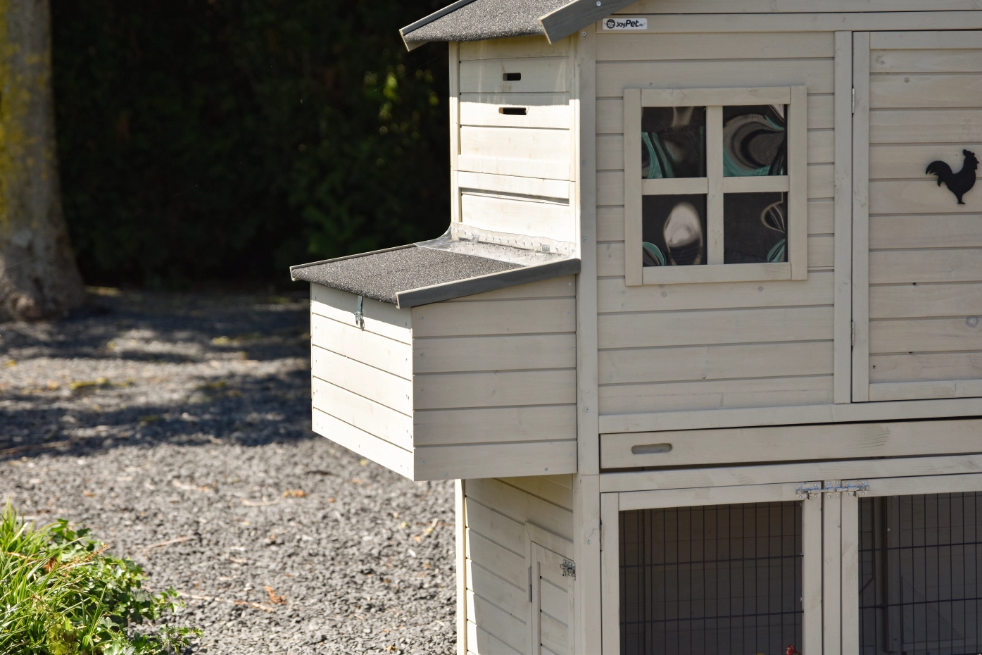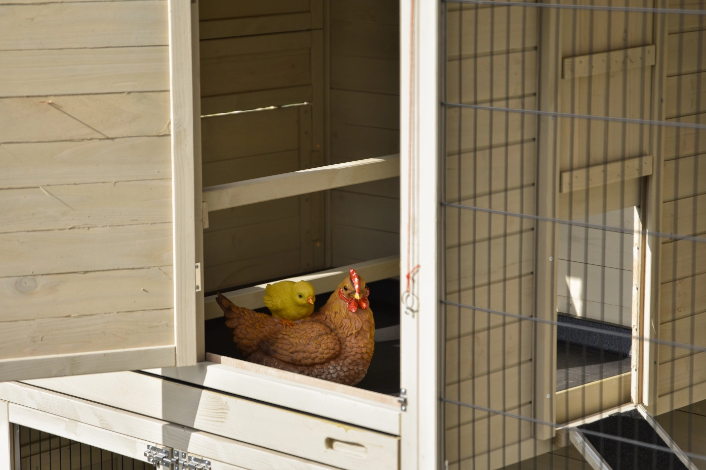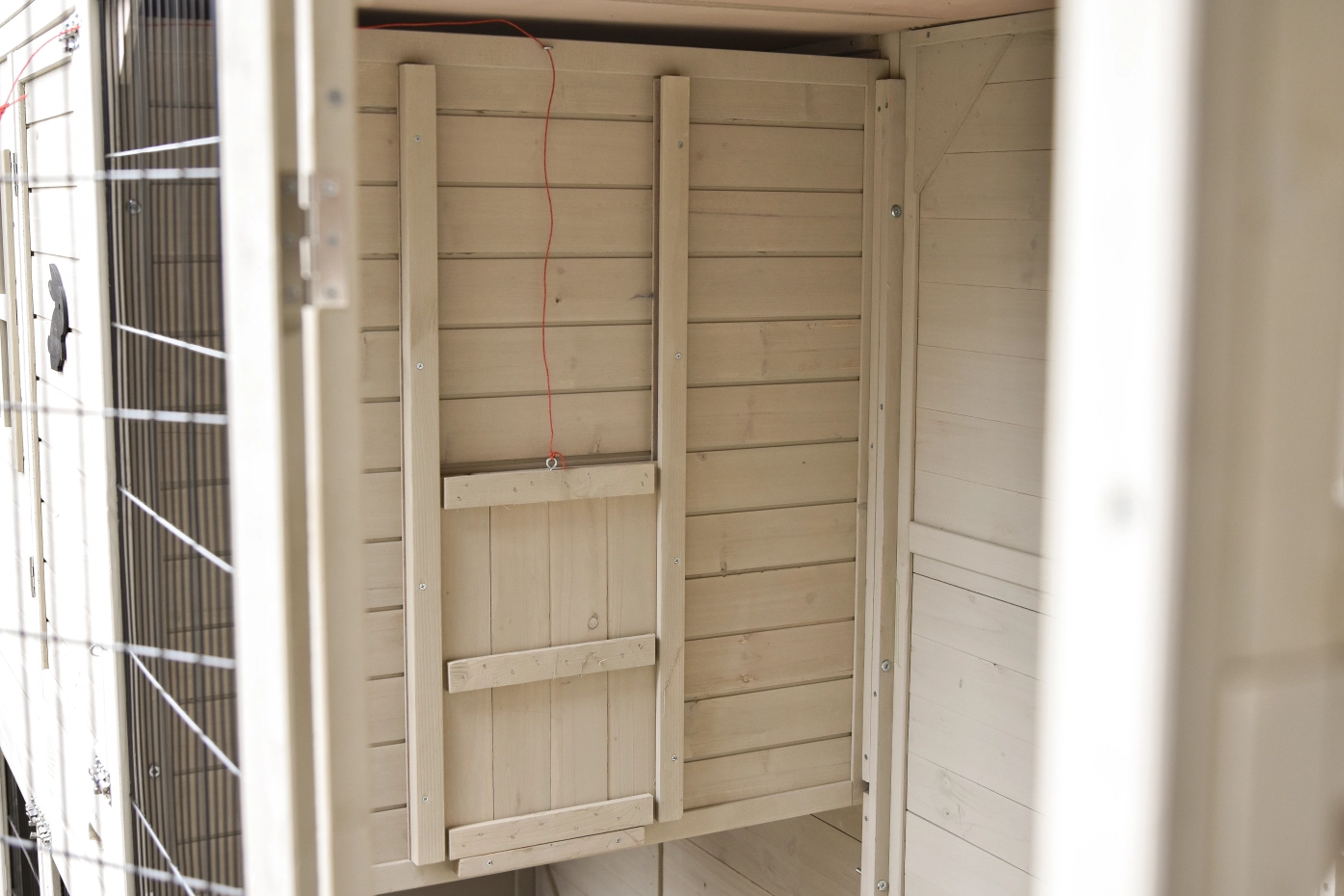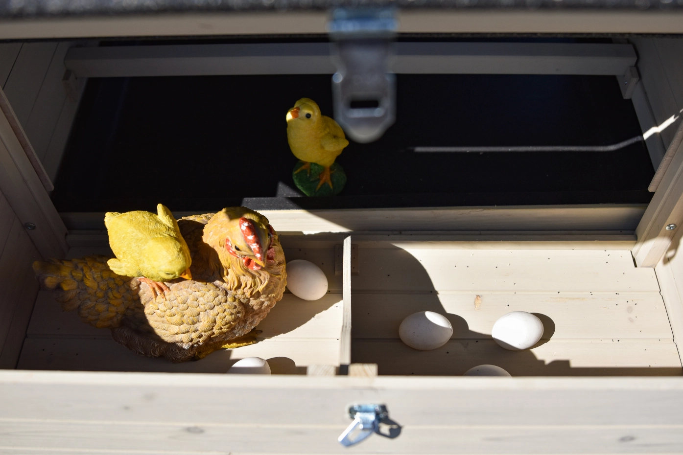 - Dieser Hühnerstall ist mit einem Legenest ausgestattet.