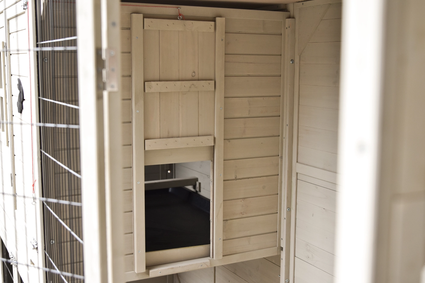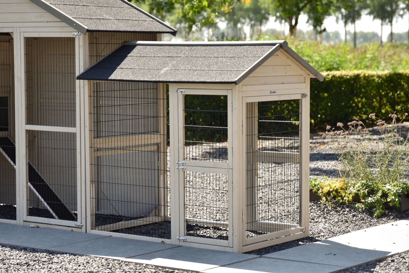 - Um diesen Stall mit einem Auslauf zu kombinieren, muss eine Tür oder ein Gitterteil entfernt werden.