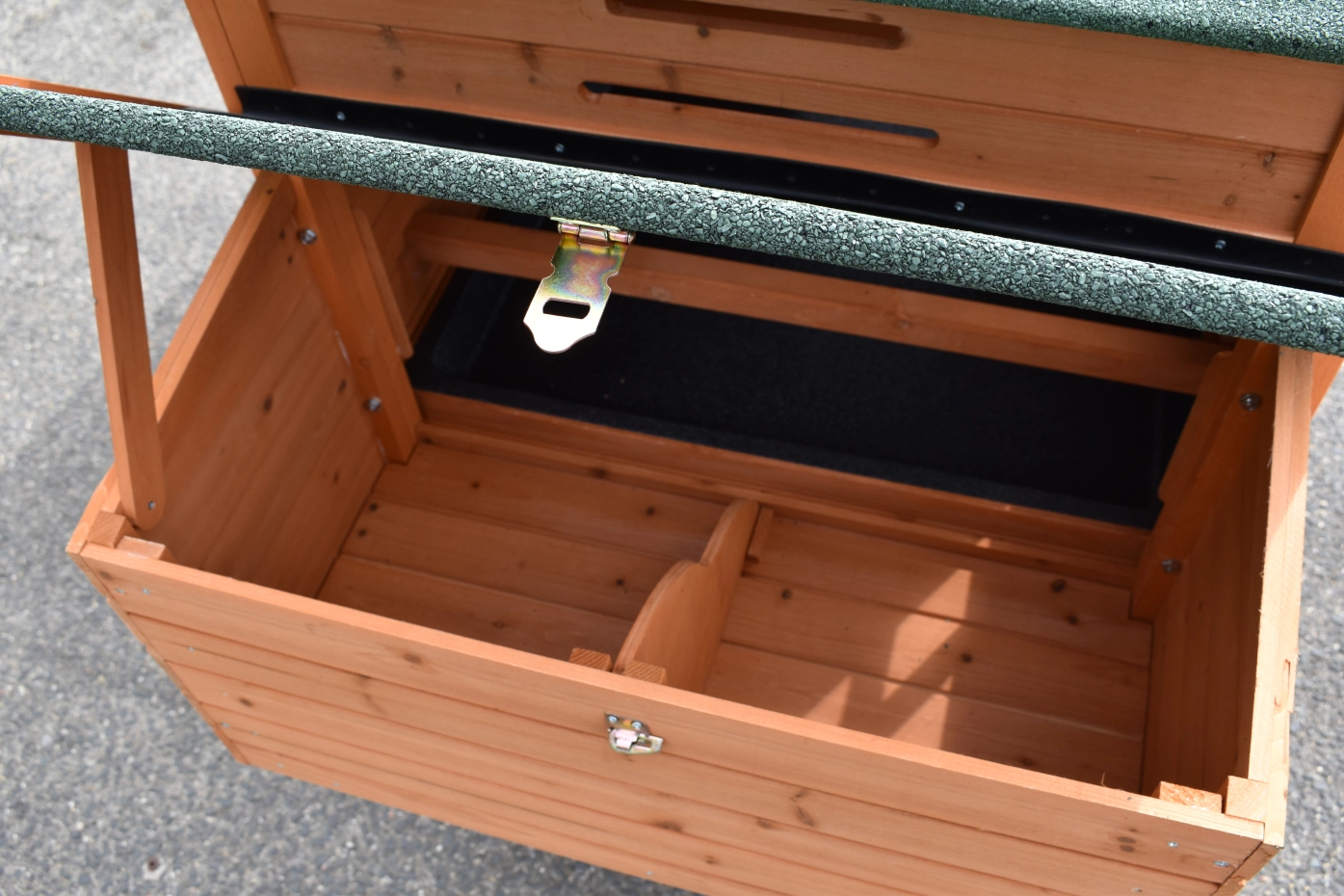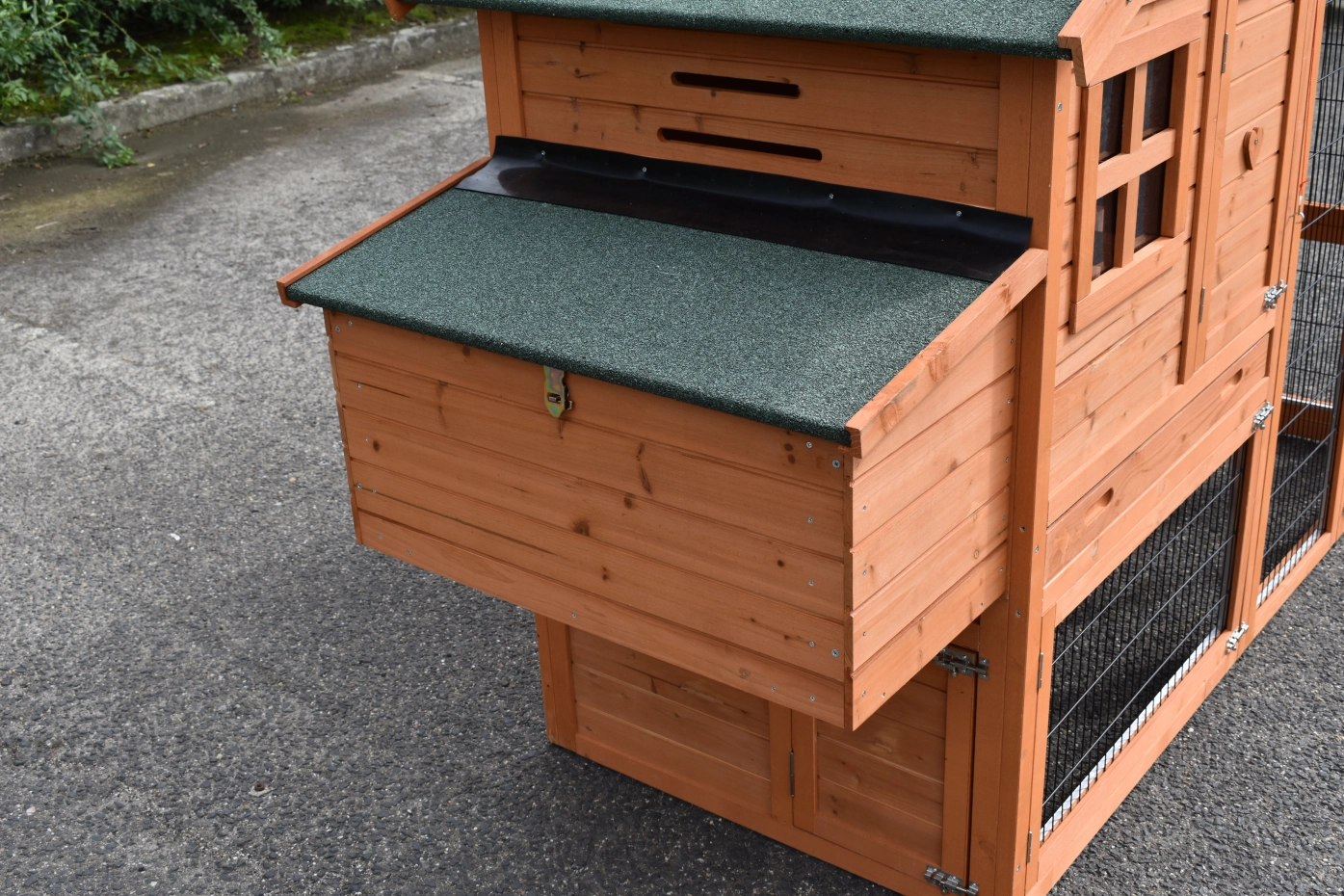 • Das Dach dieses Kaninchenstalls ist mit Dachpappe versehen.
