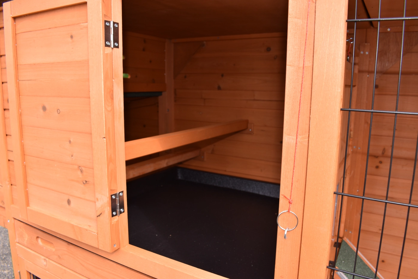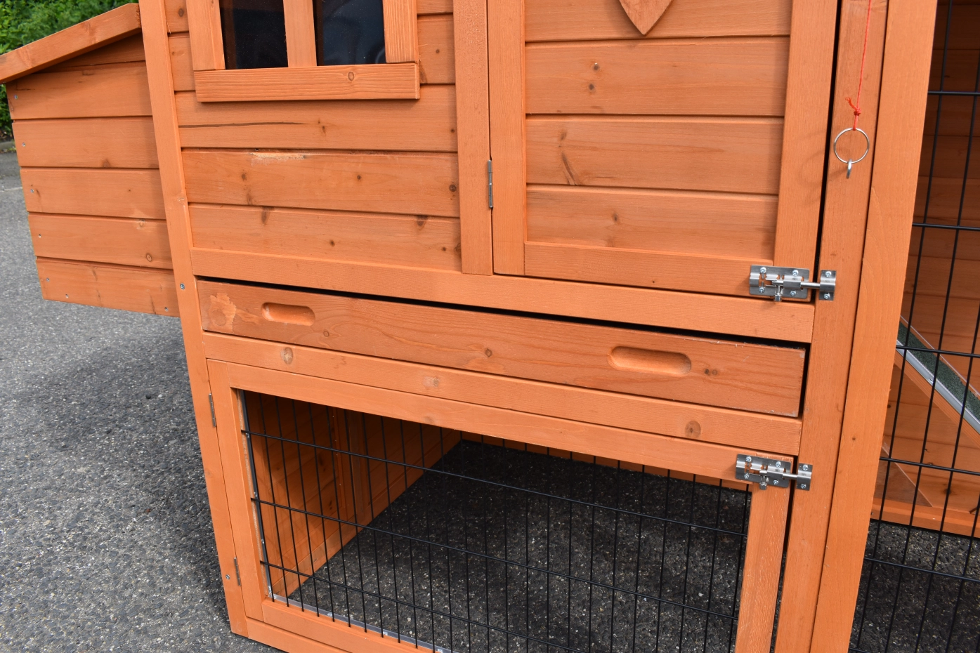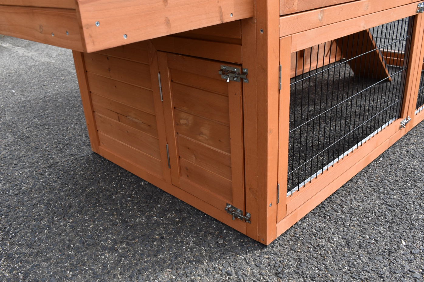 • Die Türen dieses Kaninchenstalls sind mit doppelten Schieberiegeln ausgestattet