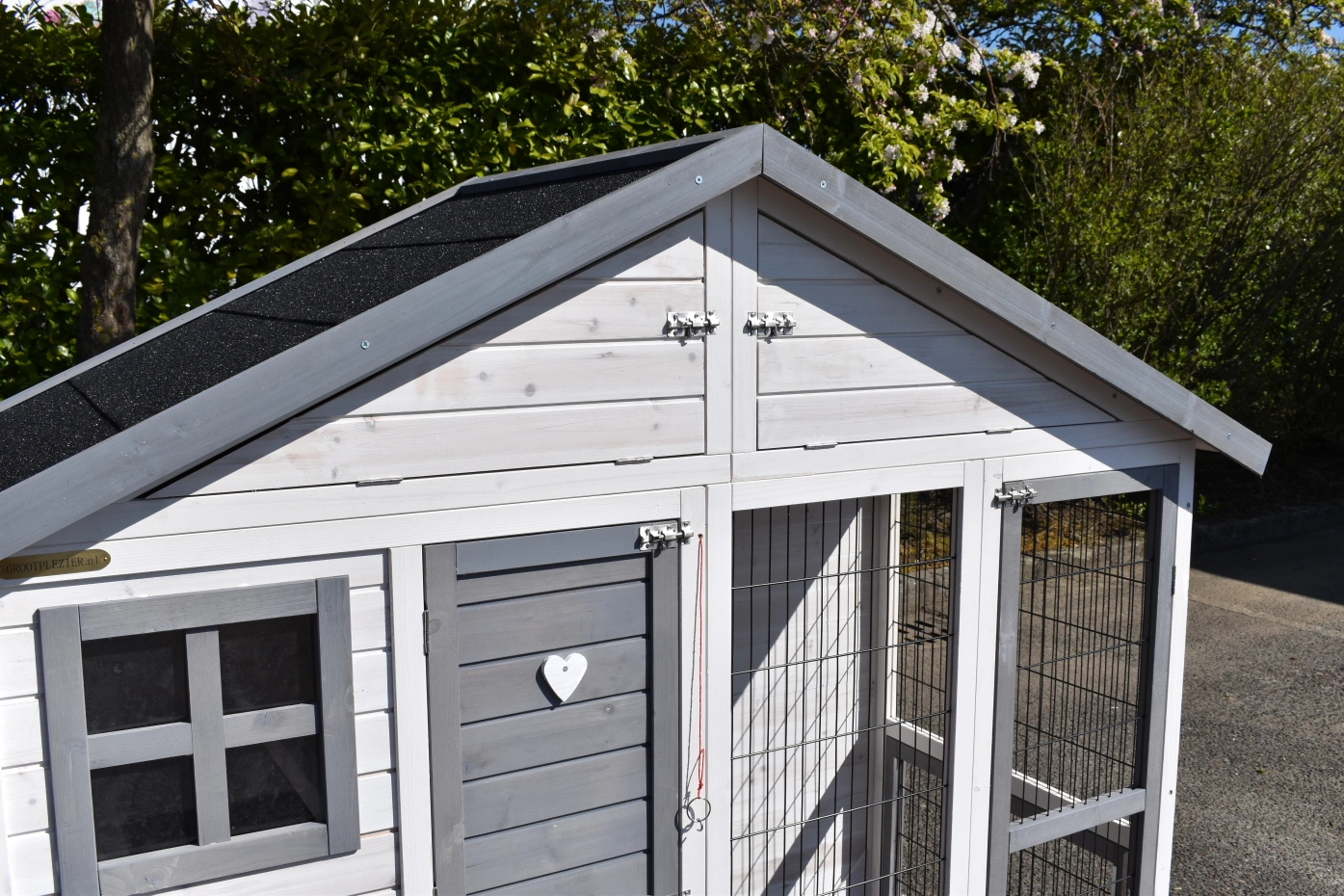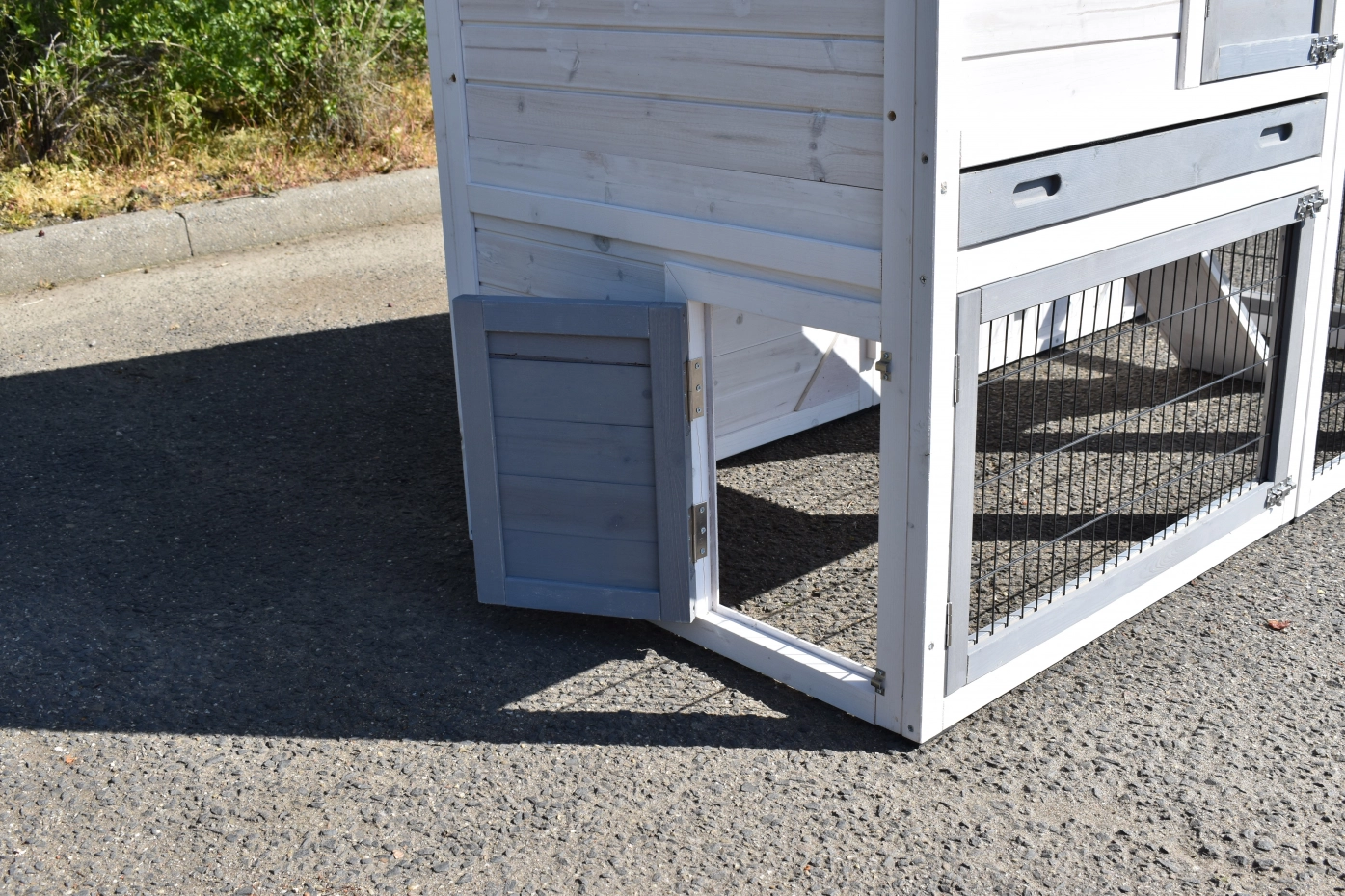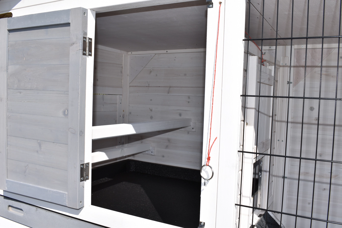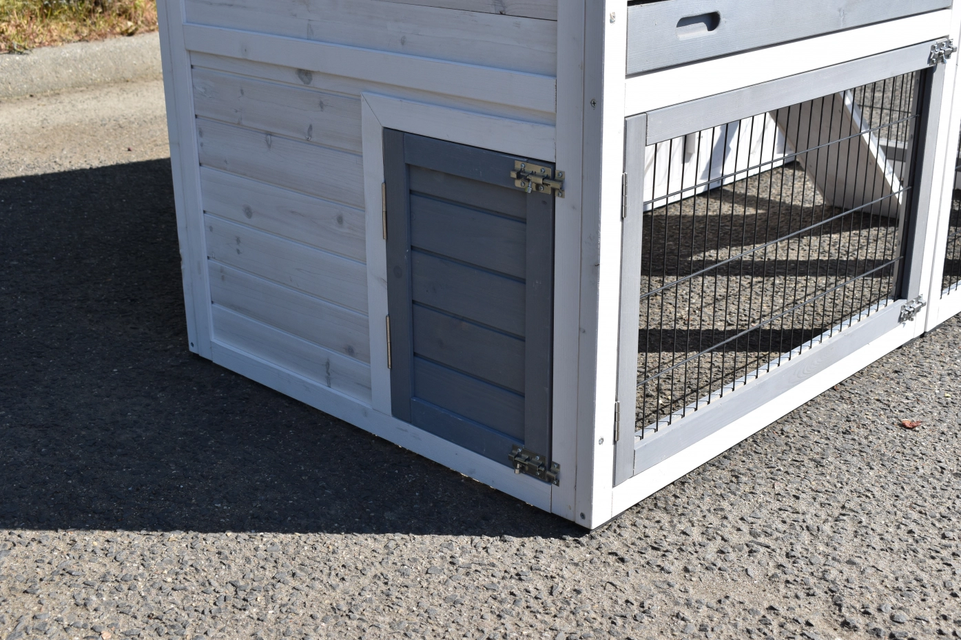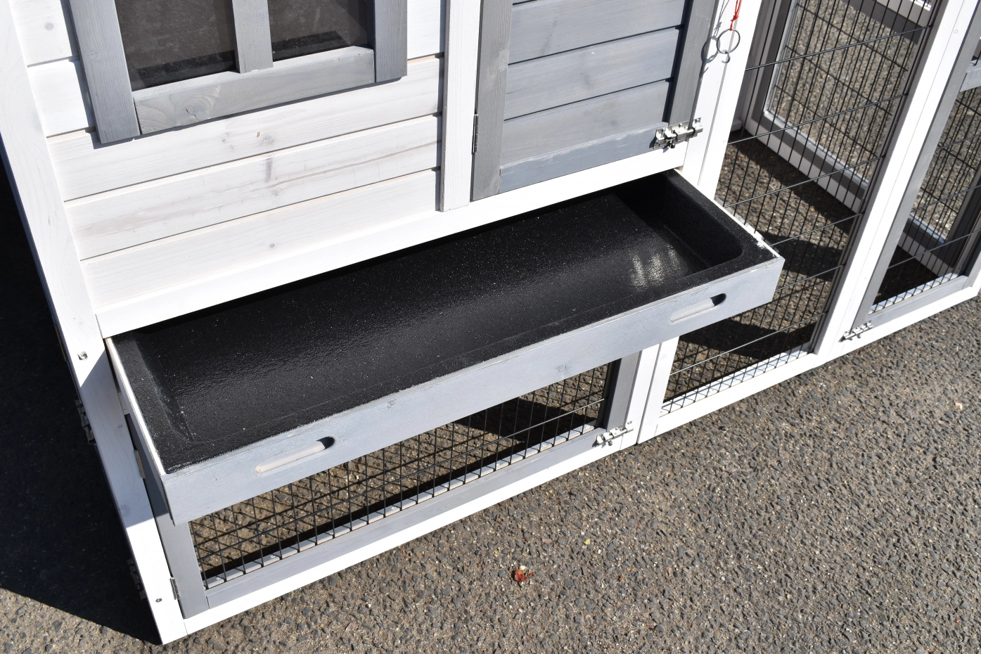 - Die Türen dieses Kaninchenstalls sind mit doppelten Schieberiegeln ausgestattet