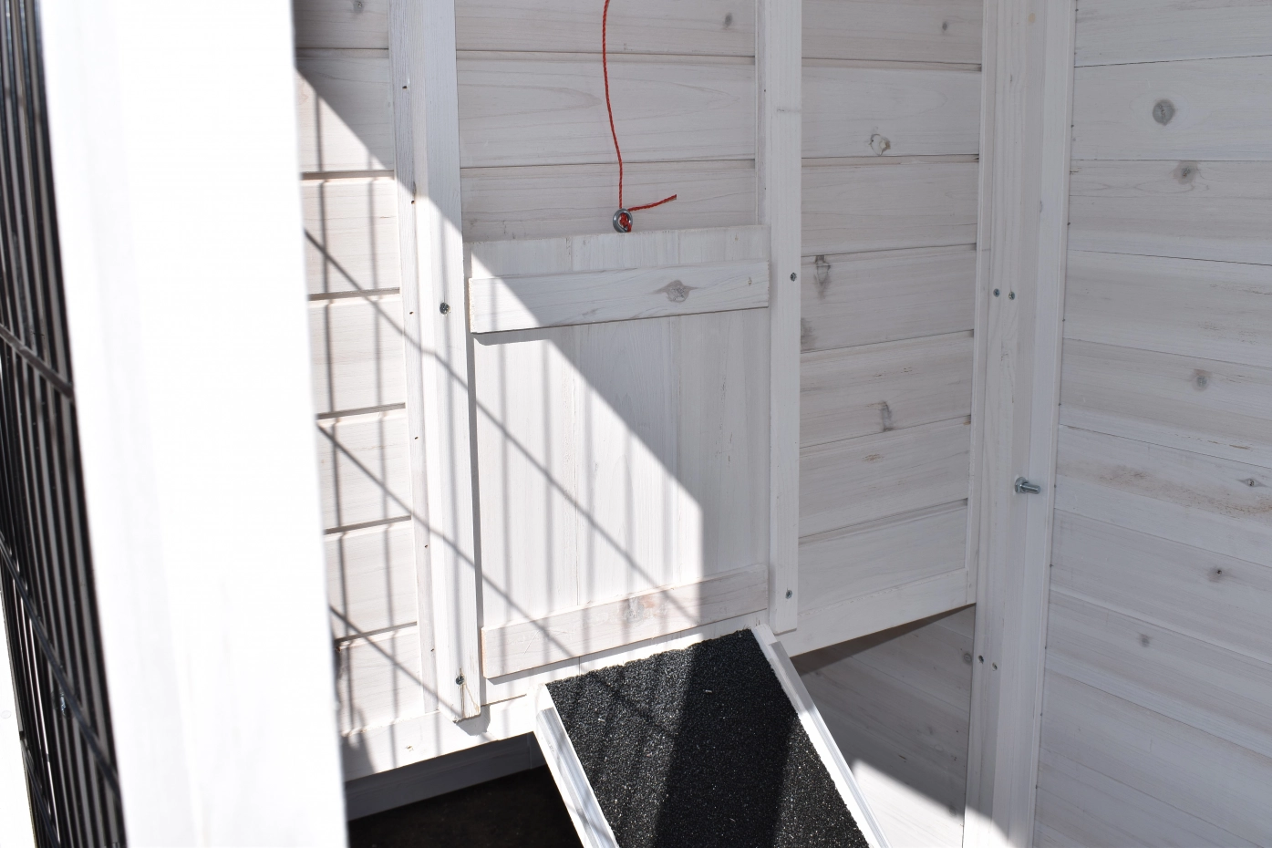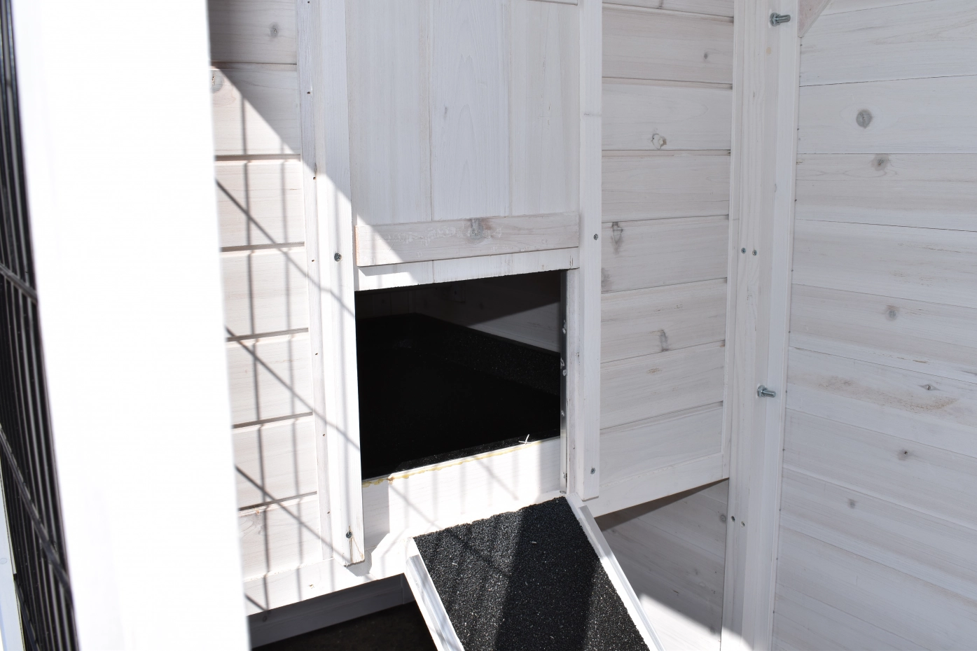 Das Hühnerhaus steht auf Gummifüßen, um optimal vor Feuchtigkeit geschützt zu sein. Das Dach mit der darunterliegenden Aufbewahrungsebene ist mit Dachpappe gedeckt. Zwischen den beiden Ebenen befindet sich eine praktische Rampe.