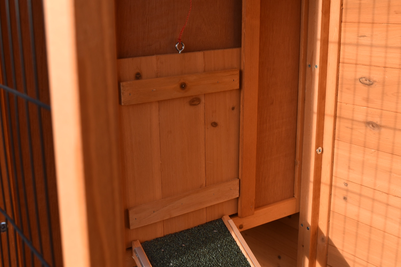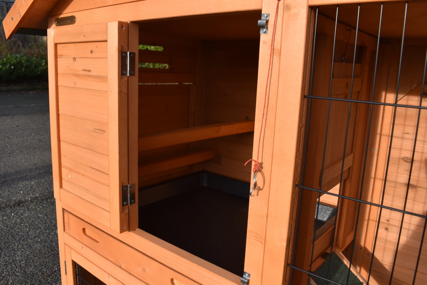 - Die Türen dieses Kaninchenstalls sind mit doppelten Schieberiegeln ausgestattet