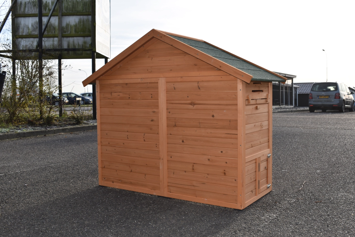 Wunderschöne Hühnerstall Holiday Small aus Kiefernholz. Dieser Stall ist versehen mit einer praktischen Schublade und ein höheres Schlafraum für Ihre Tiere, deren sie über die Rampe einfach erreichen können. Der Hühnerstall hat gummi Füße und hat ein praktisch Stauraum. Das Dach von der Stall ist ausgestattet mit grüne Dachpappe.