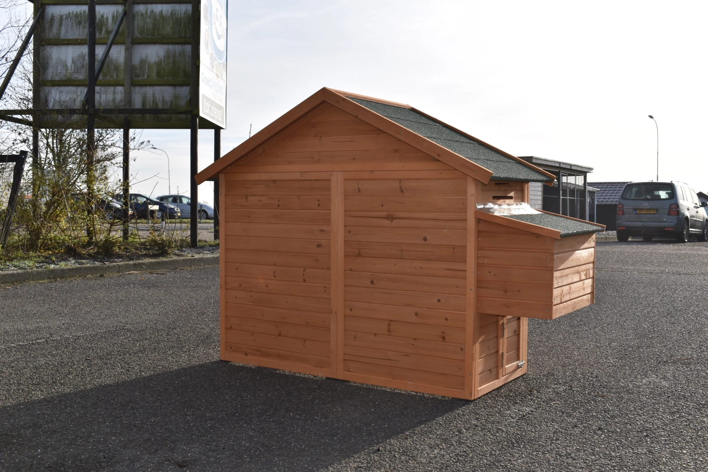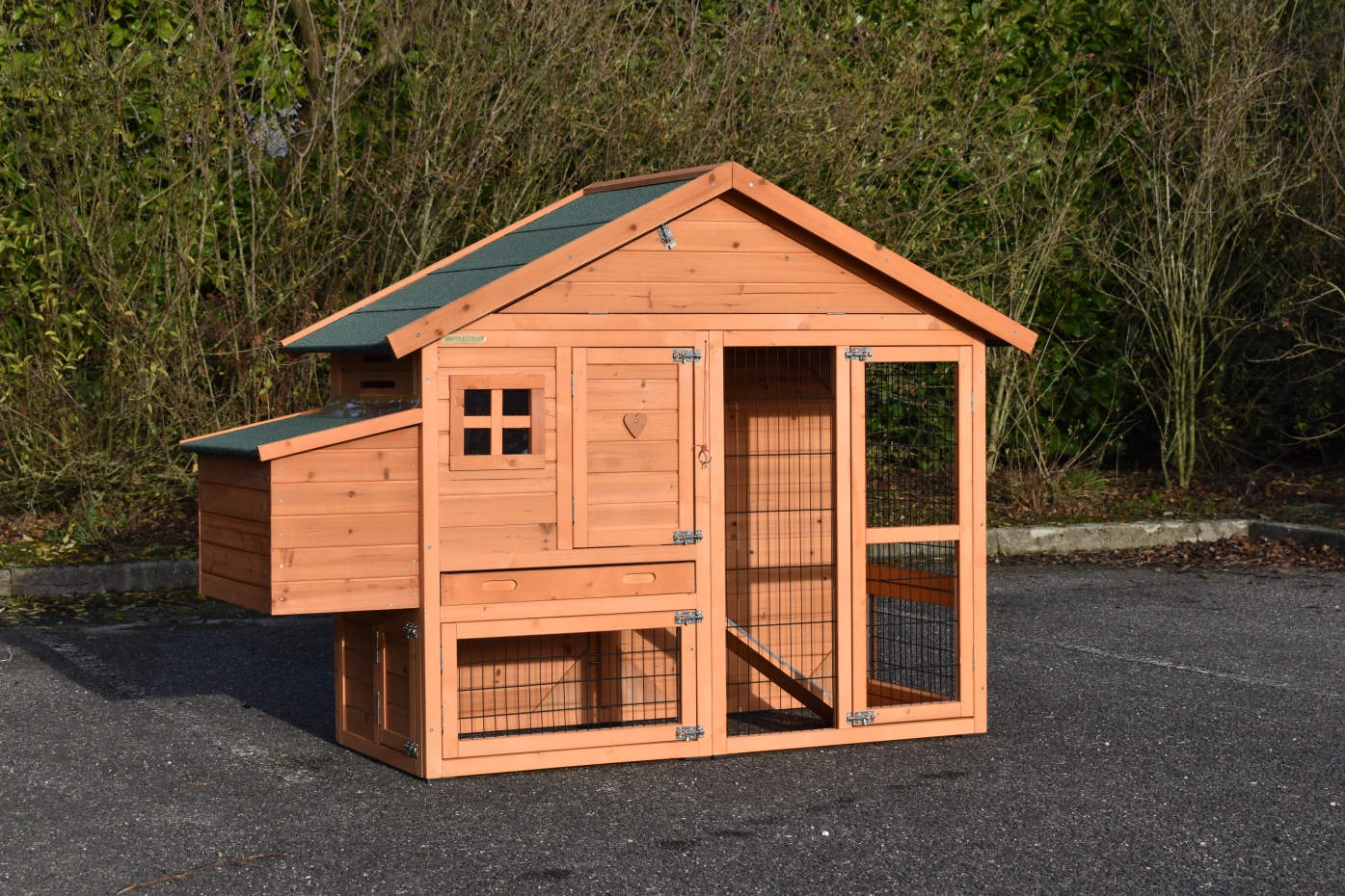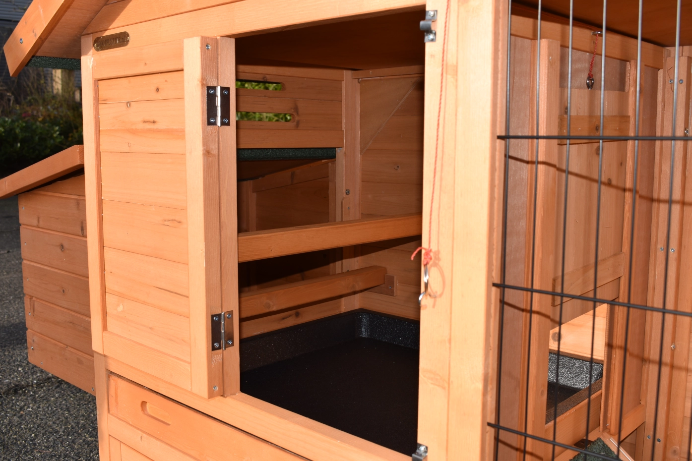 - Dieser Hühnerstall ist mit einem Legenest ausgestattet.