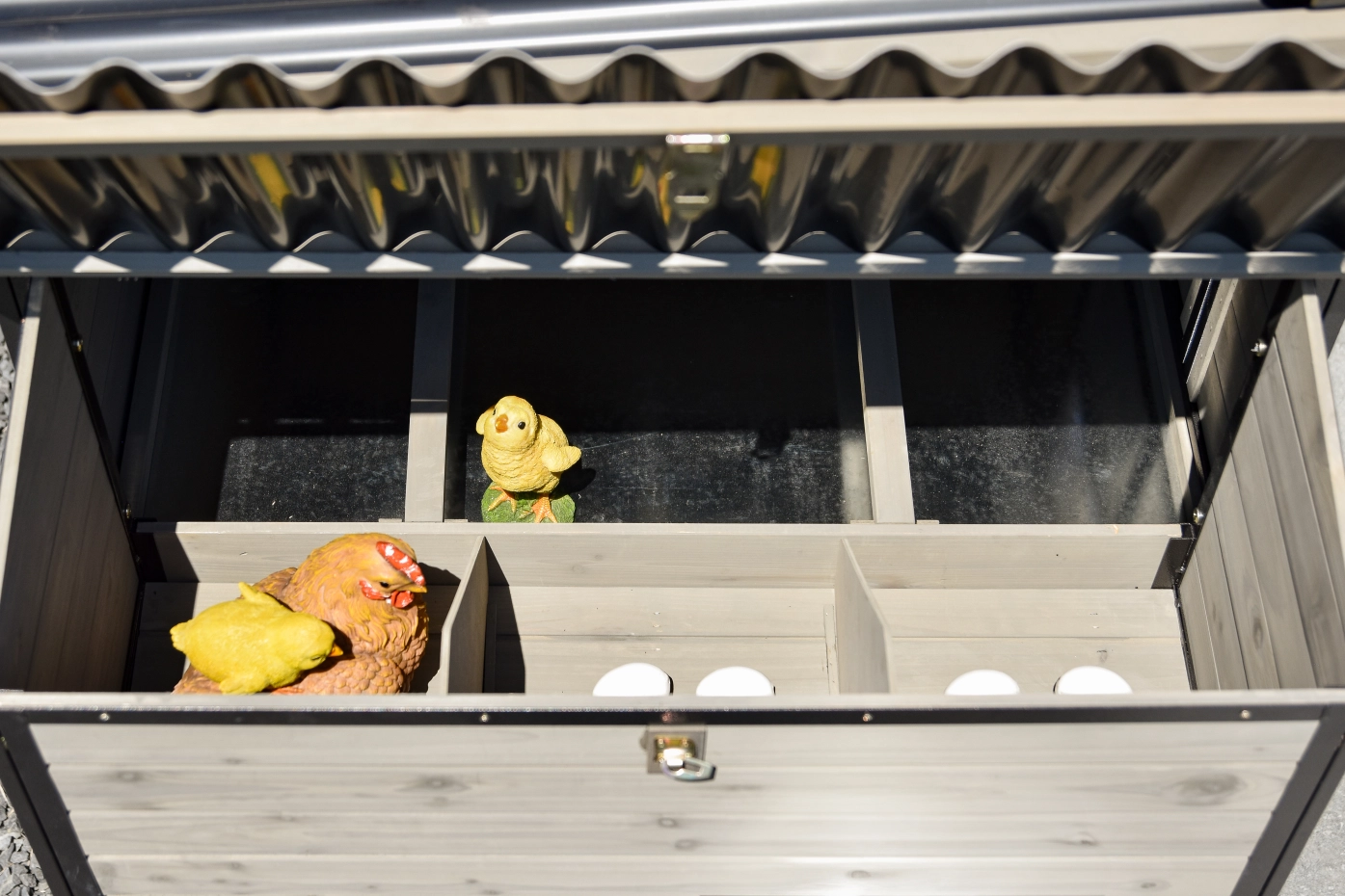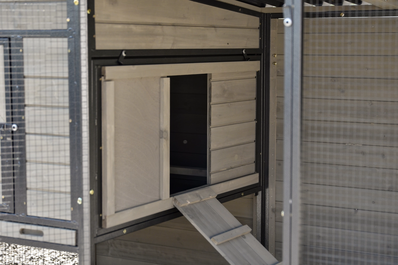 - Dieser Hühnerstall ist mit einem Legenest ausgestattet.