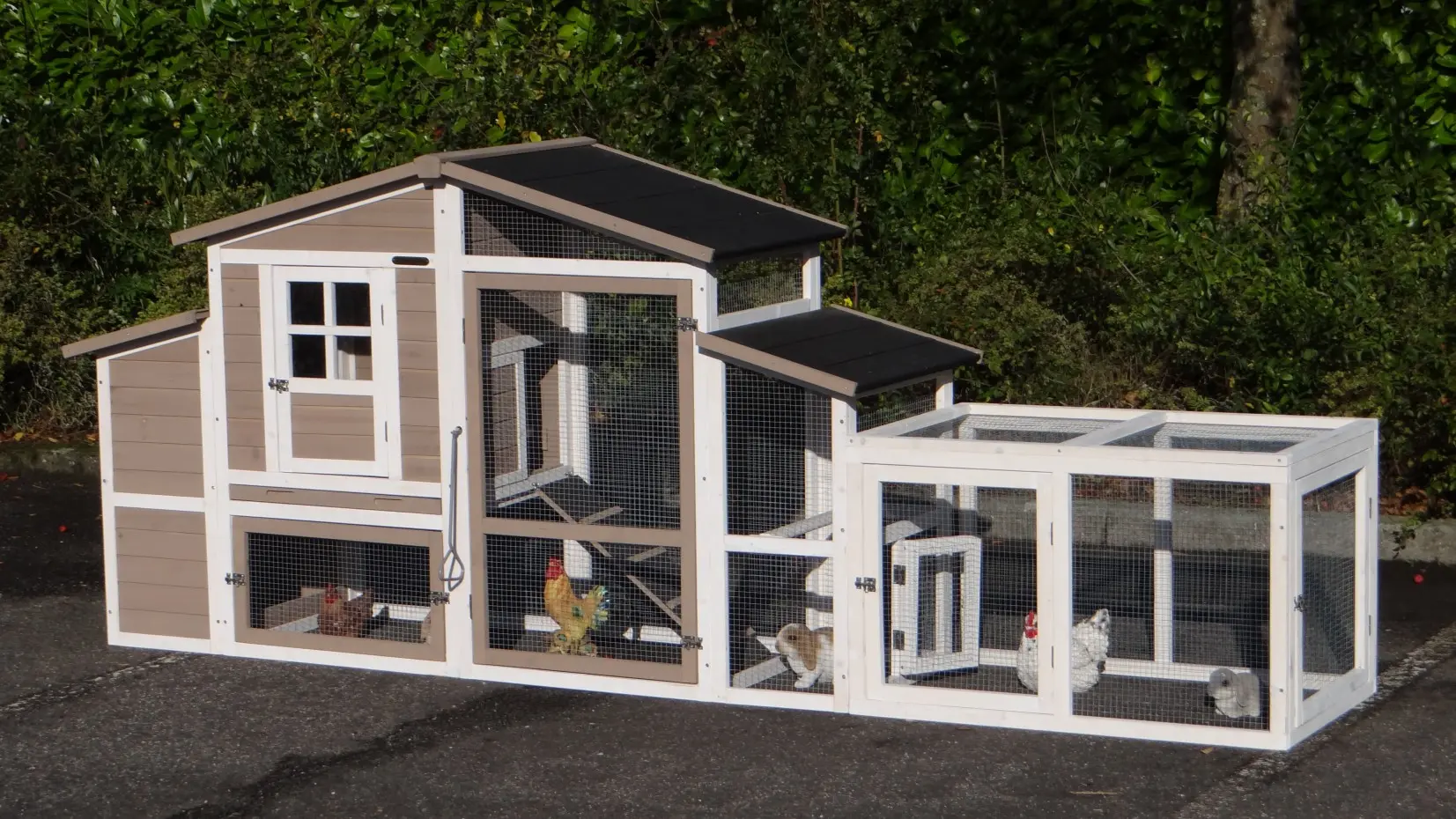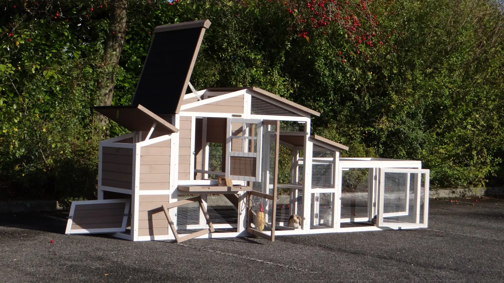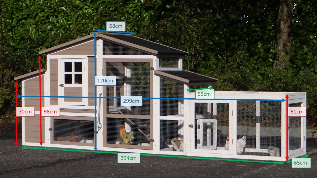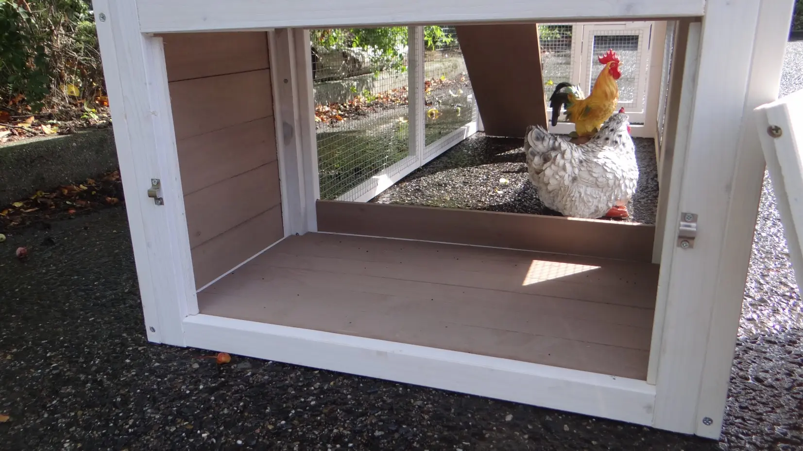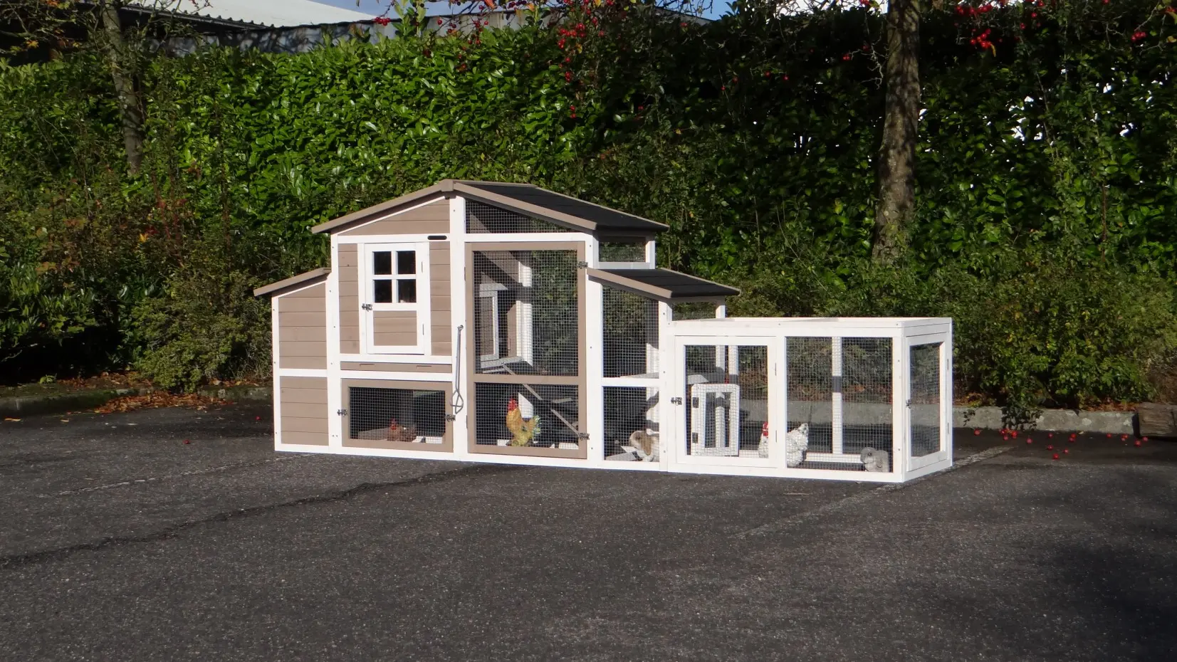 Der schöne Hühnerstall Leah mit extra Hühnerauslauf ist ein schöner, vielseitiger Stall für 2 bis 4 Hühner. Dieser Hühnerstall verfügt über einen abschließbaren Schlafbereich mit 2 Sitzstangen von 56 cm Länge. Im überdachten Hühnerauslauf gibt es eine dritte Sitzstange. Links vom Schlafbereich befindet sich ein Legenest. Der Hühnerstall Leah ist außerdem mit einer praktischen, ausziehbaren Reinigungsschublade und einem überdachten Auslauf mit einer großen Tür ausgestattet. Der zusätzliche Anbau Auslauf Ambiance Small hat ein Drahtdach. Der Auslauf ist etwas tiefer als der Stall. Bei kleinen Hühnern sollte diese Lücke also verschlossen werden.