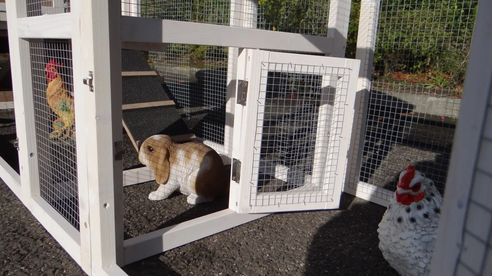 - Um diesen Stall mit einem Auslauf zu kombinieren, muss eine Tür oder ein Gitterteil entfernt werden.