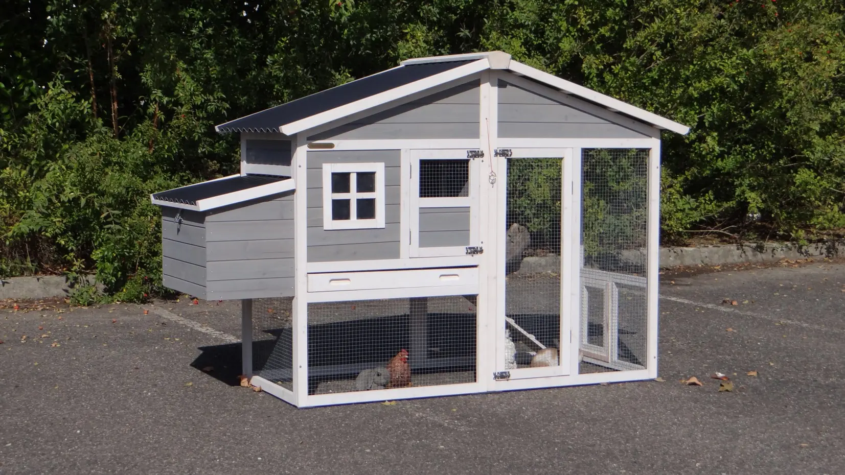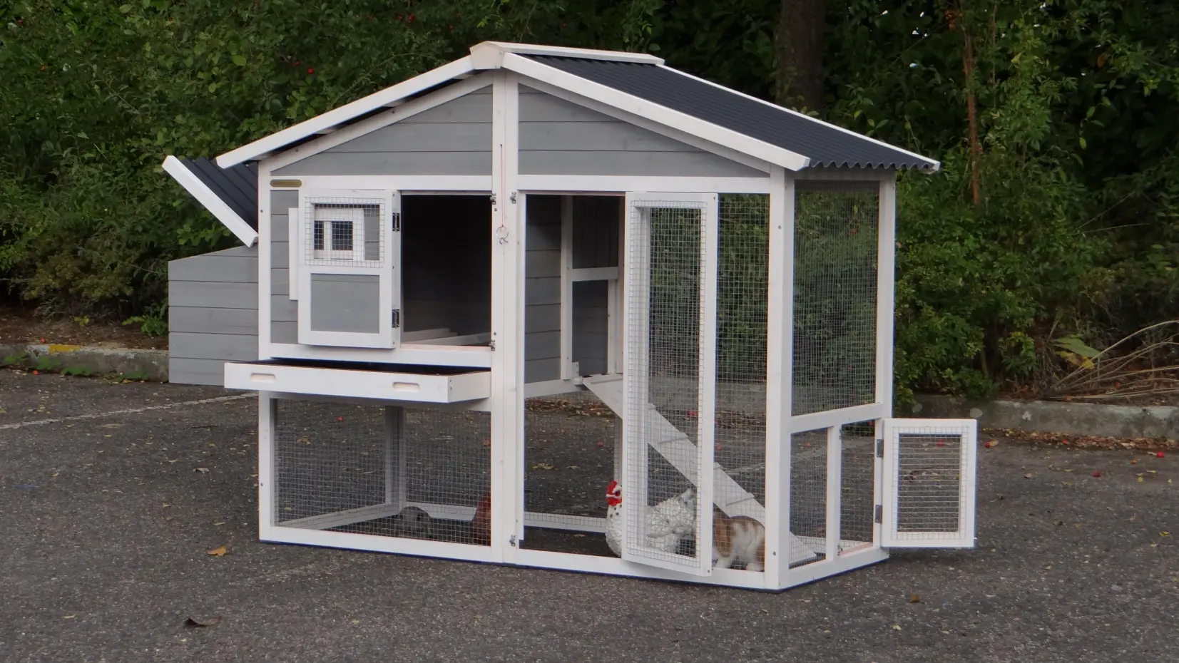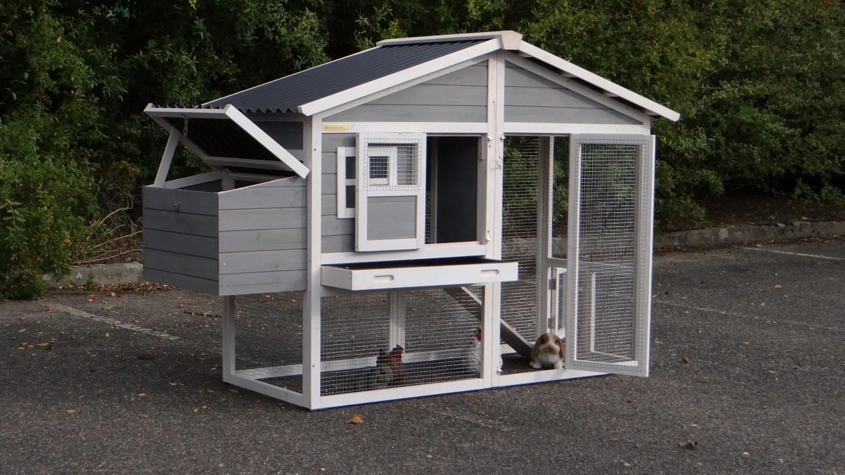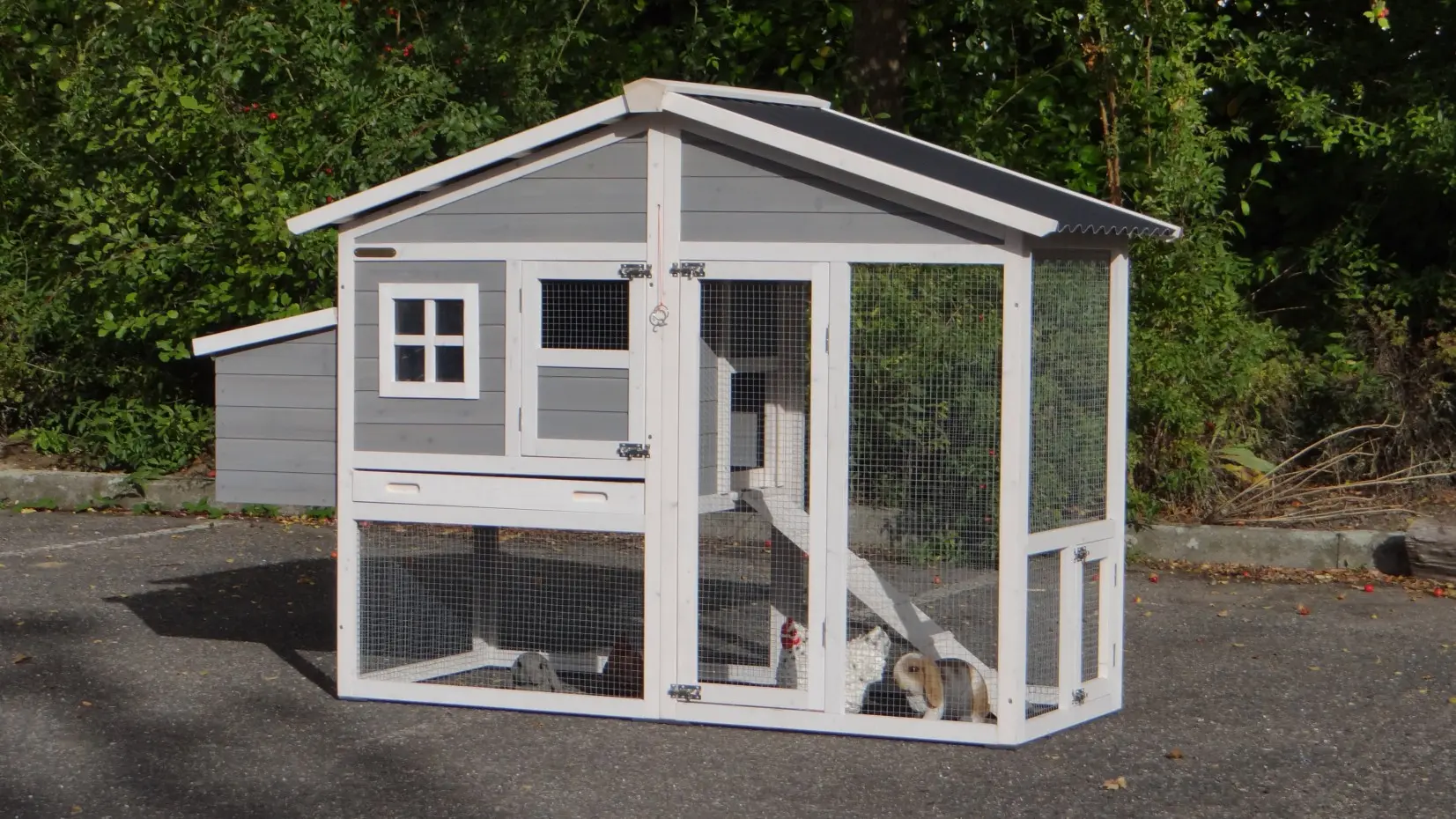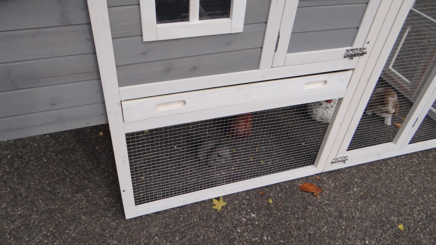 • Die Türen dieses Kaninchenstalls sind mit doppelten Schieberiegeln ausgestattet