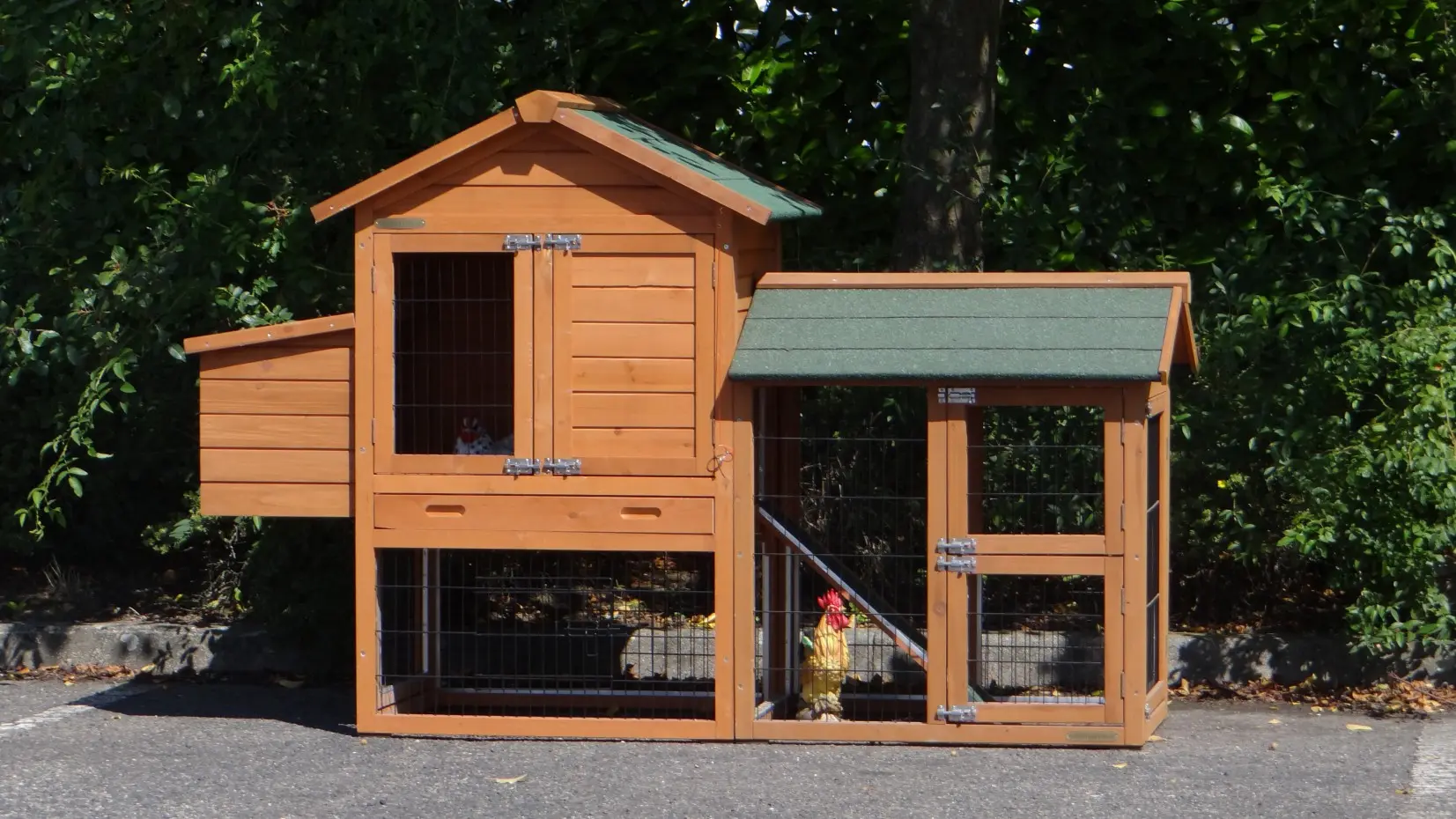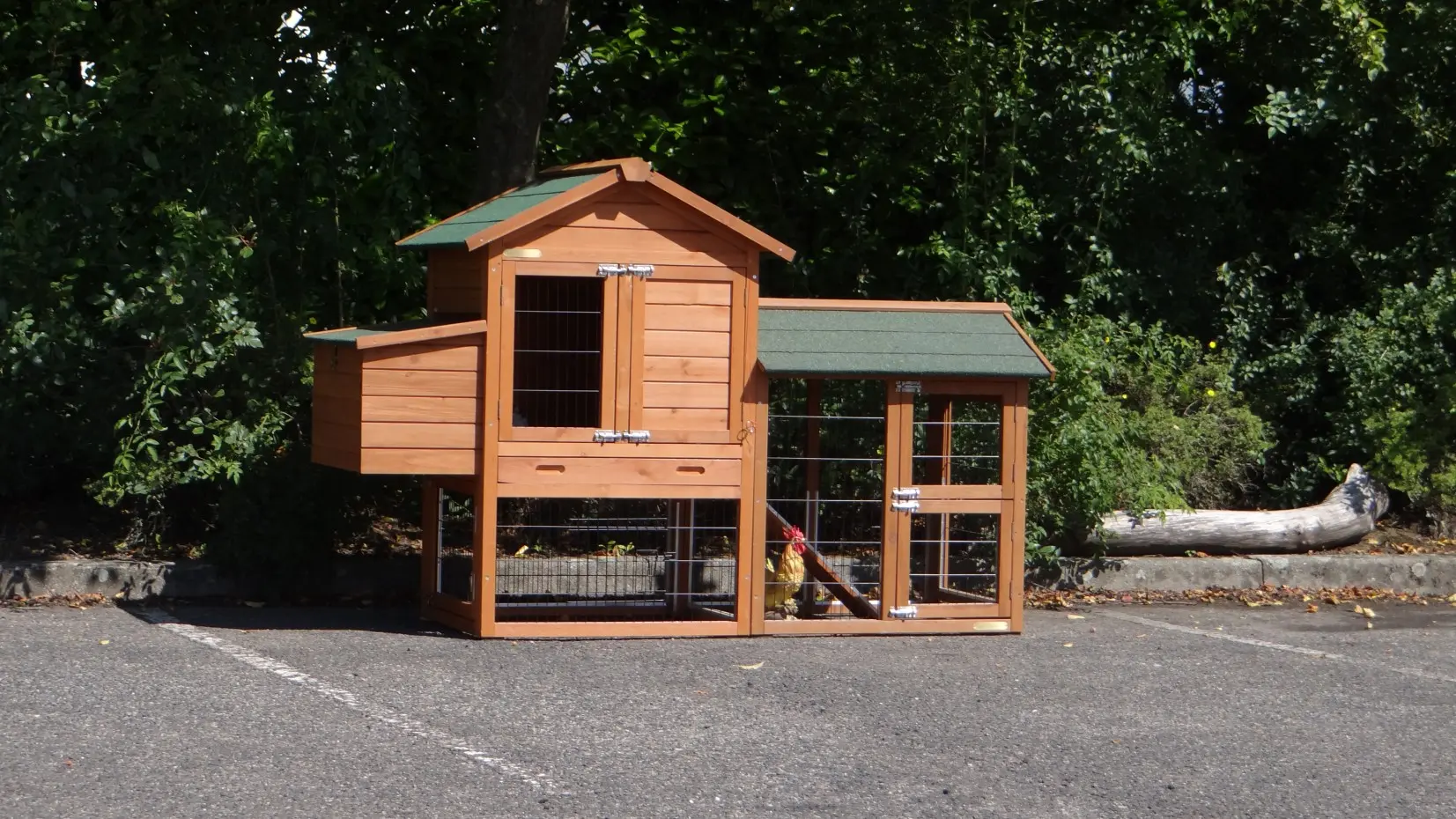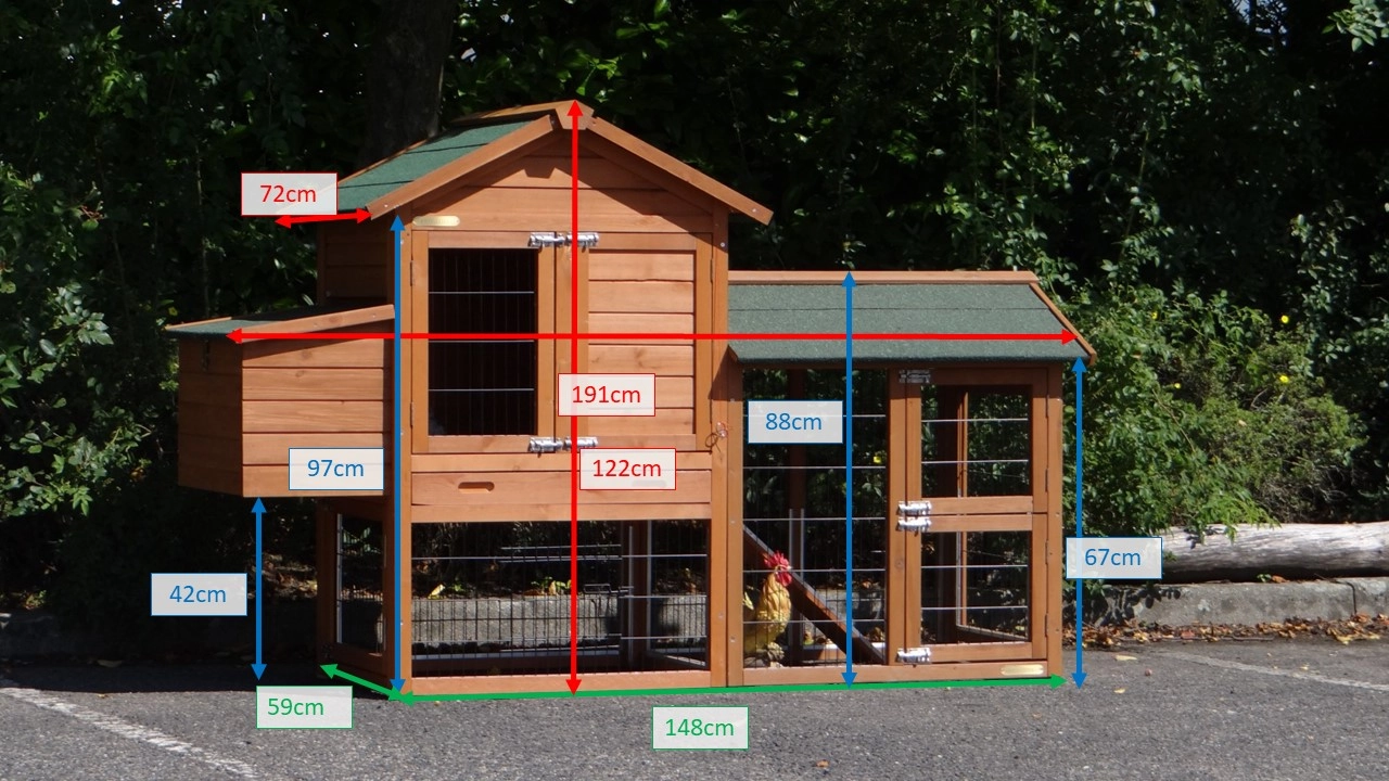 - Dieser Hühnerstall ist mit einem Legenest ausgestattet.