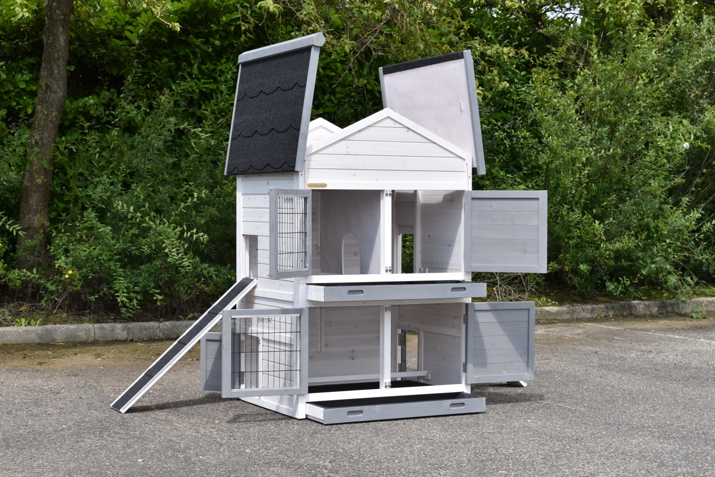 - Das Dach dieses Kaninchenstalls ist mit Dachpappe versehen.