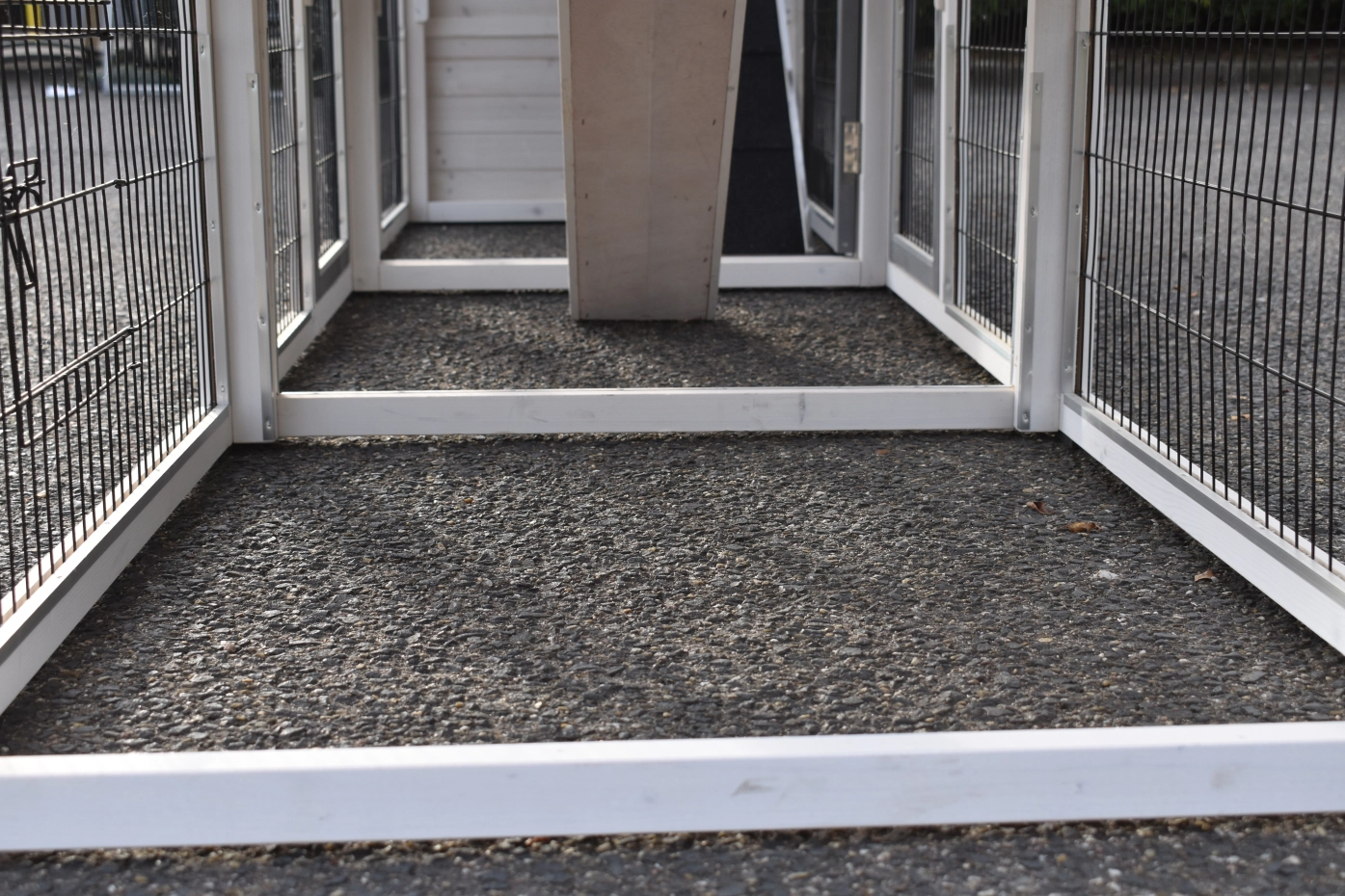 - Um diesen Stall mit einem Auslauf zu kombinieren, muss eine Tür oder ein Gitterteil entfernt werden.