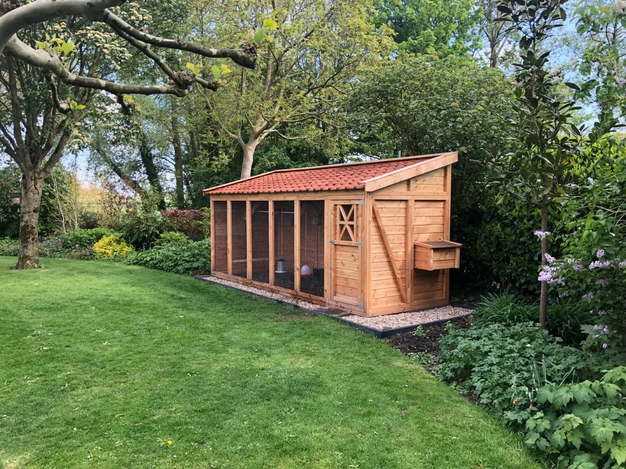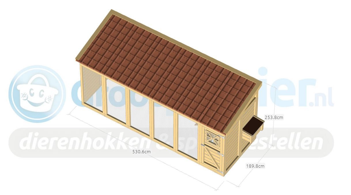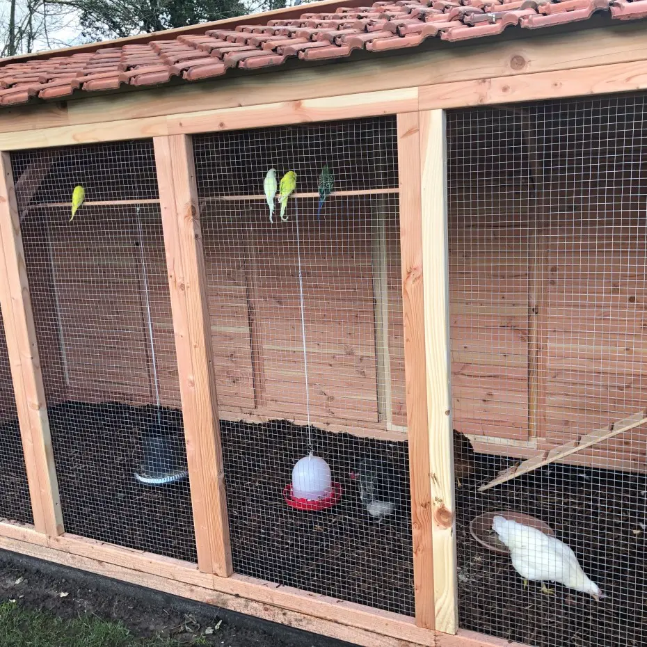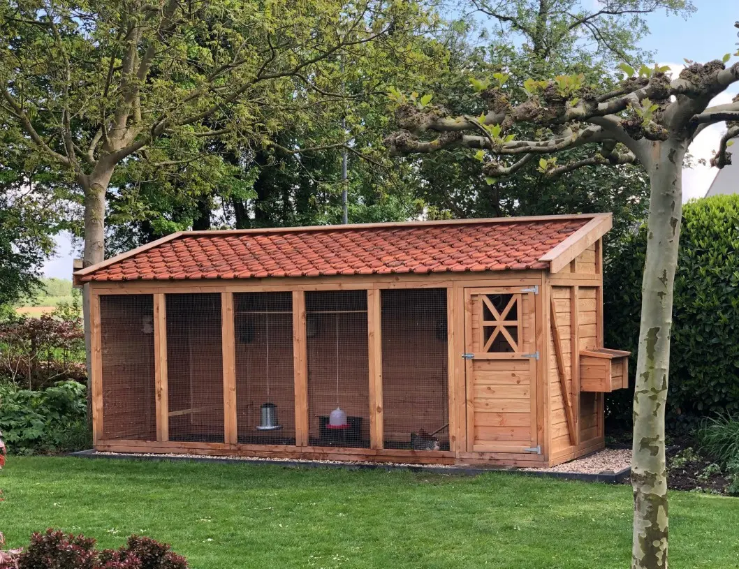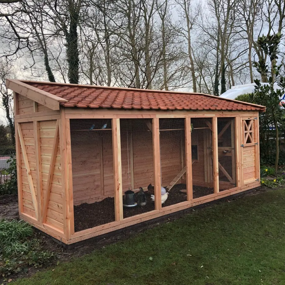 Dieses große und luxuriöse Hühnerhaus bzw. diese Voliere ist besonders schön gestaltet und mit einem Dach aus Dachziegeln versehen. Dadurch erhält sie einen ländlichen Charme und ist zudem völlig wartungsfrei. Dank der großzügigen Abmessungen bietet sie reichlich Platz zum Fliegen und Scharren.