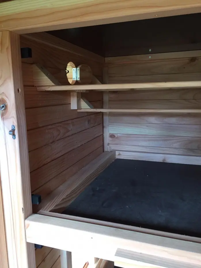 - Wenn draußen eine hohe Luftfeuchtigkeit herrscht, ist es auch im Inneren eines Stalls feucht. Die Innenseite von der Käfig können Sie lasieren um Schimmelbildung zu verhindern.