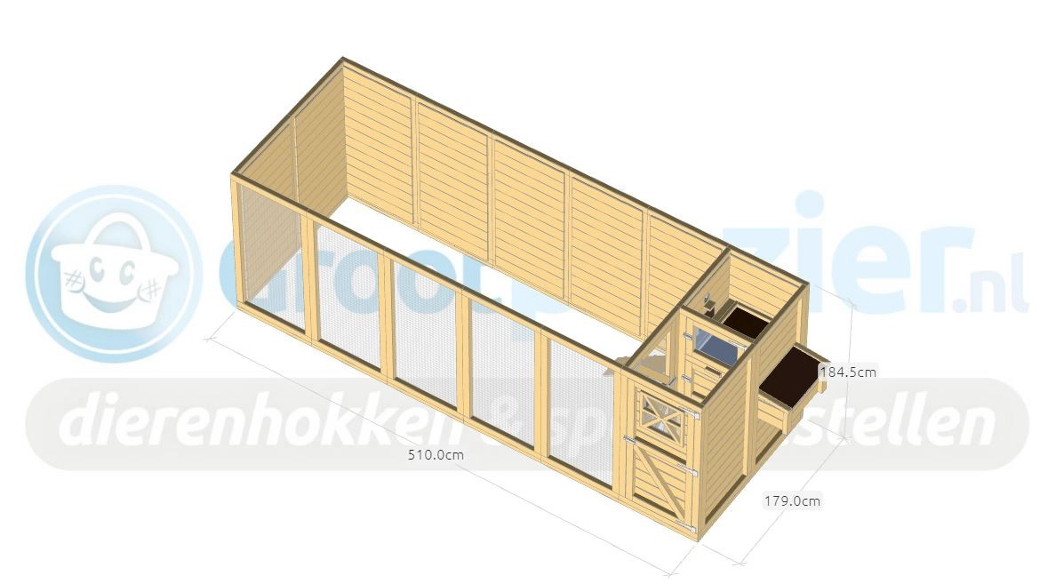 - Der Stall besteht aus Paneelen von 180x85cm und 180x120cm. Die Paneele werden mit Schrauben miteinander verbunden. Bohrer, Schrauben und Bits sind im Lieferumfang enthalten.