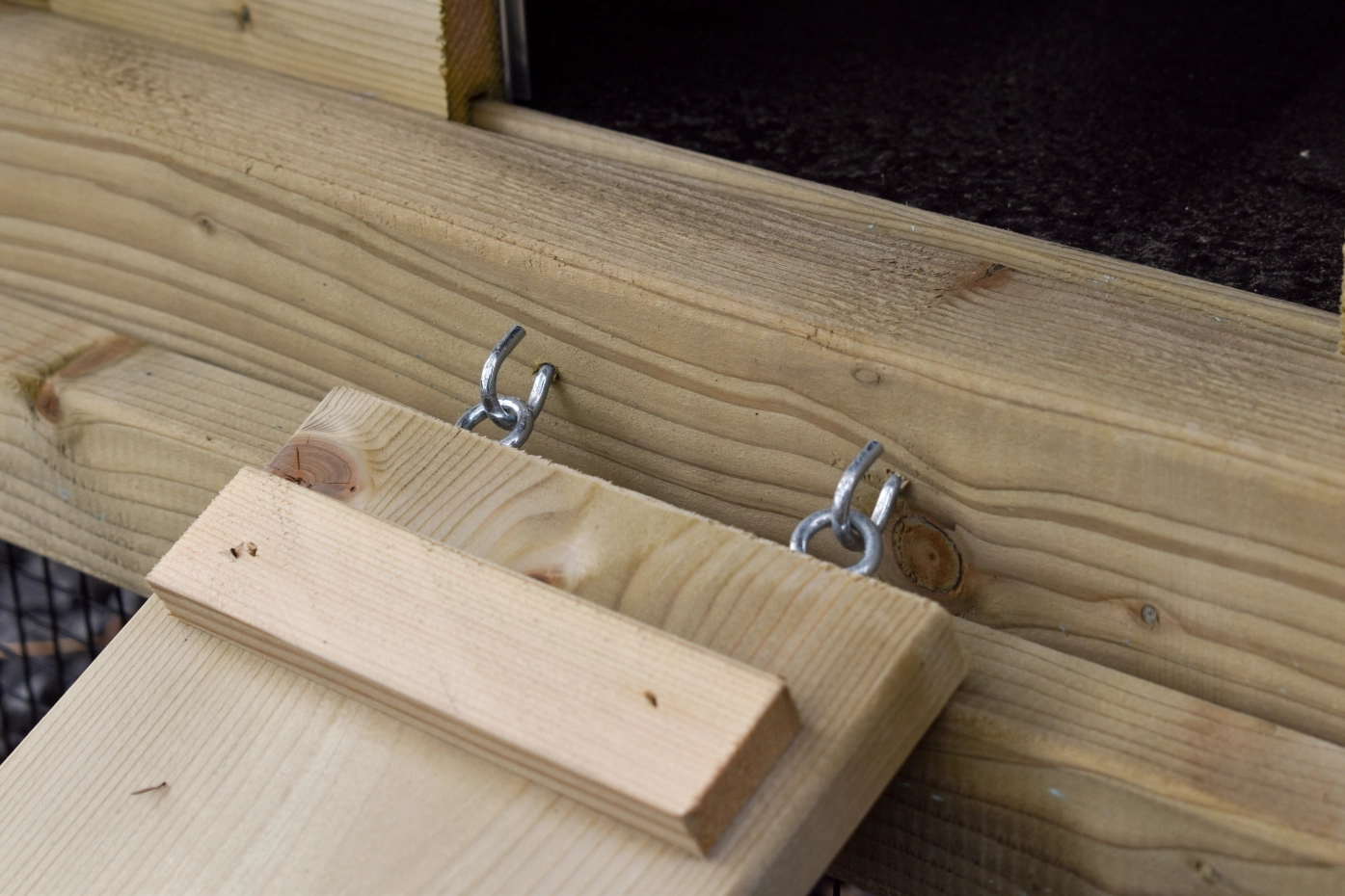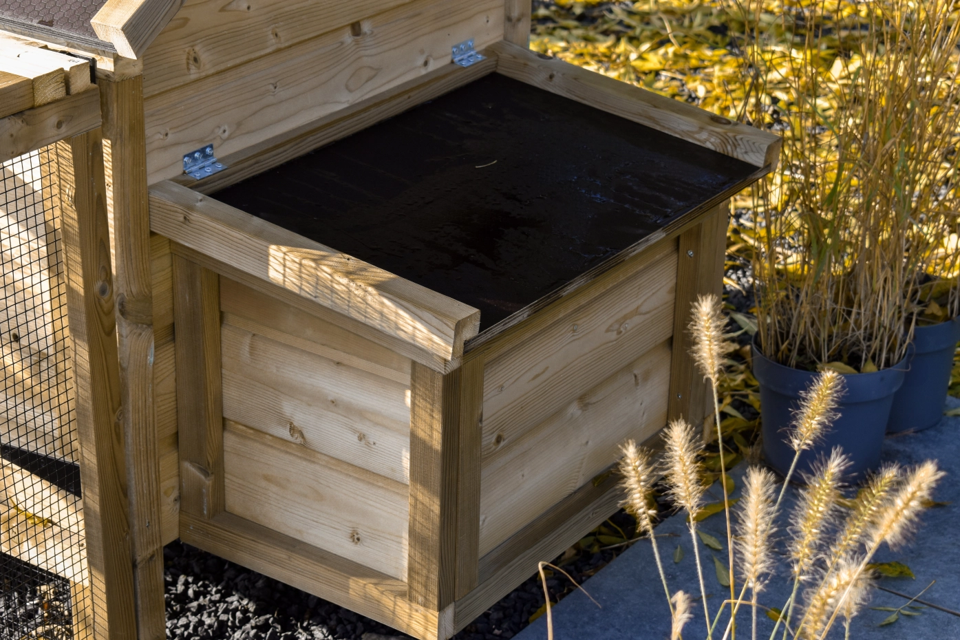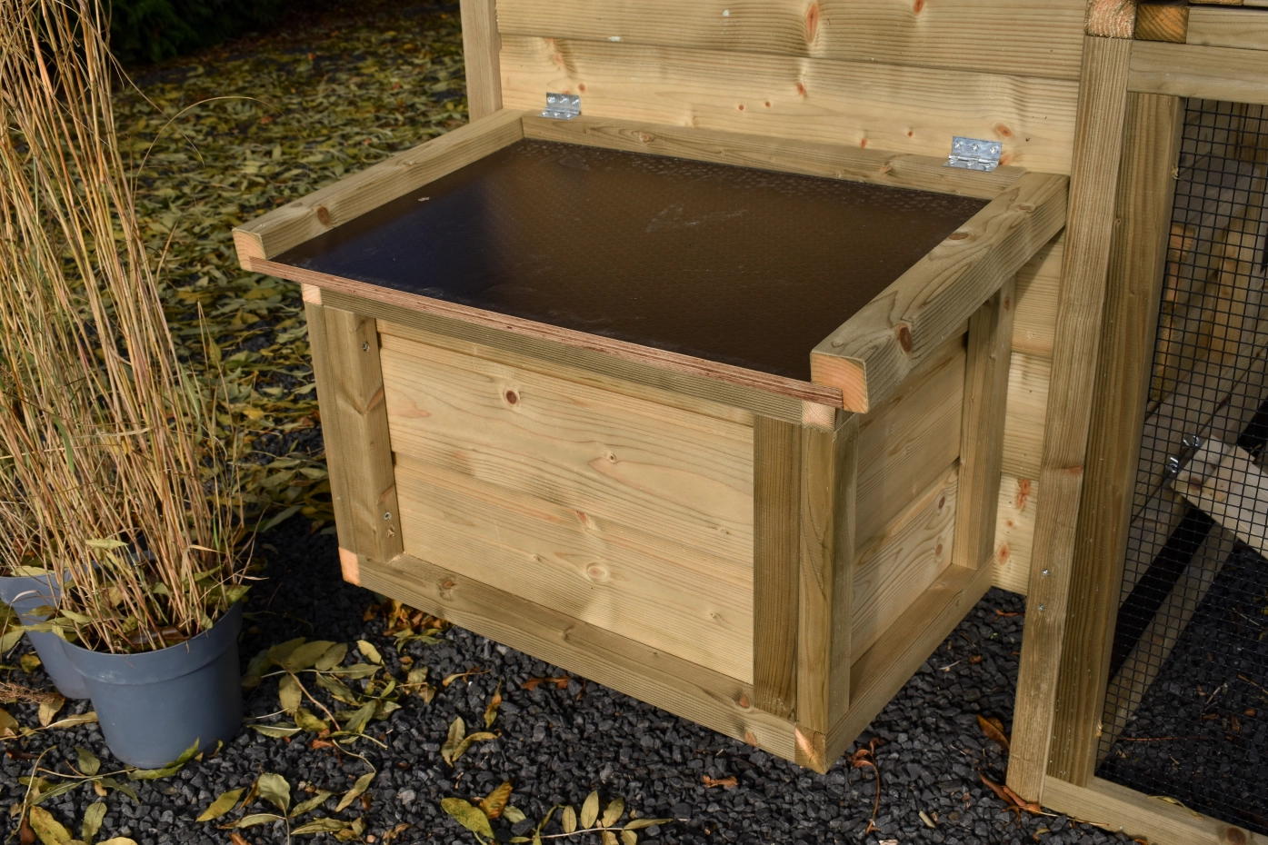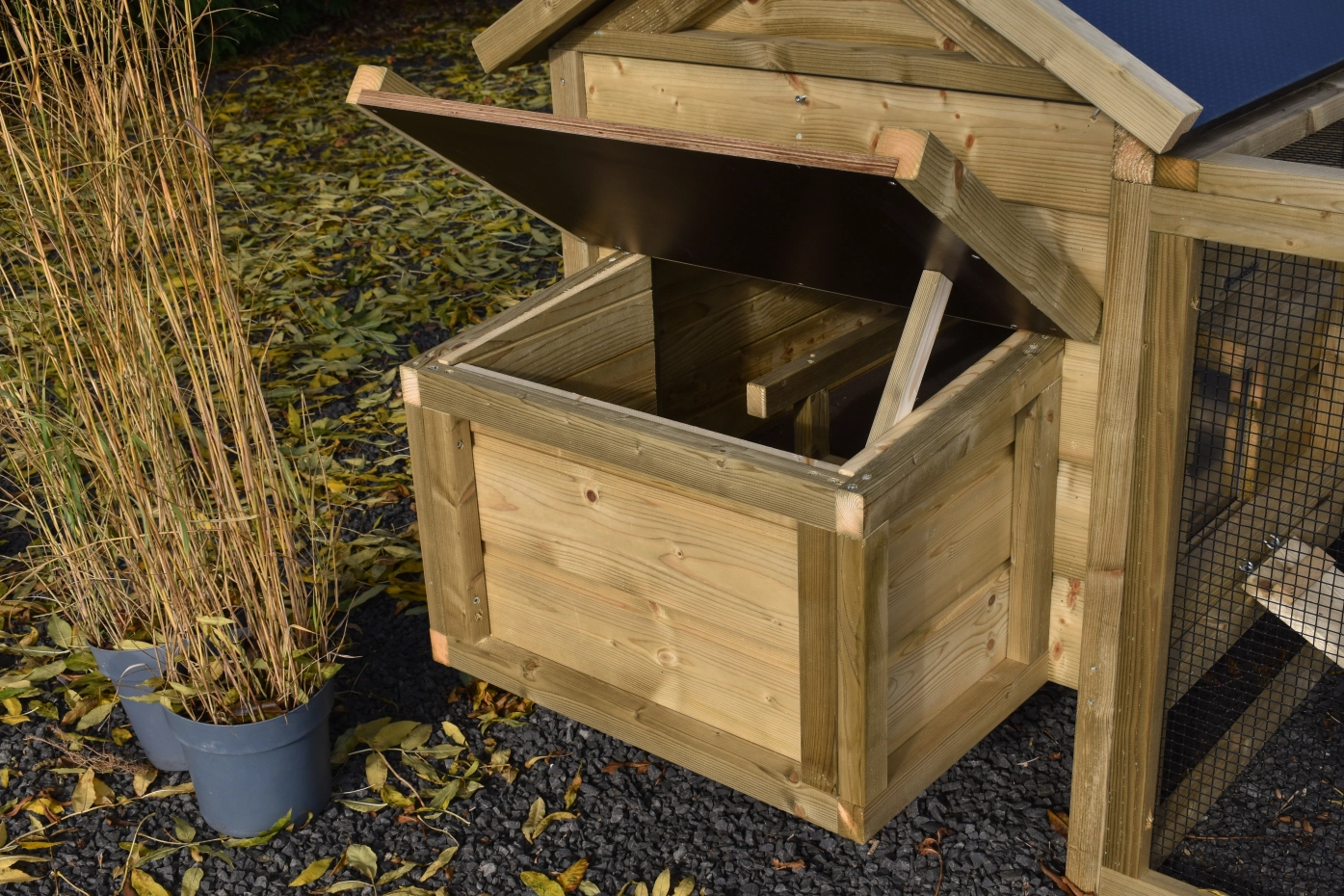- Dieser Hühnerstall ist mit einem Legenest ausgestattet.