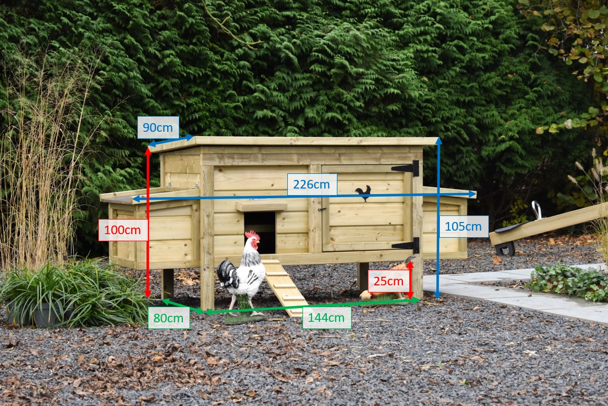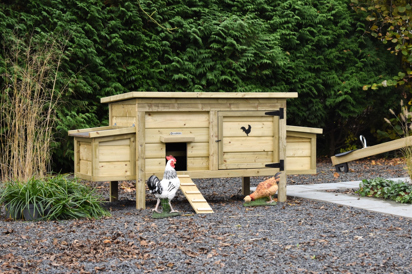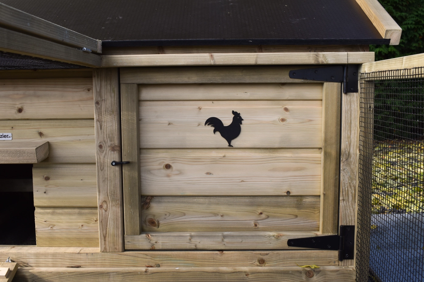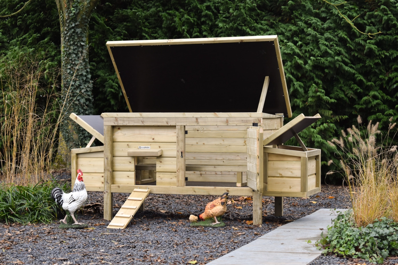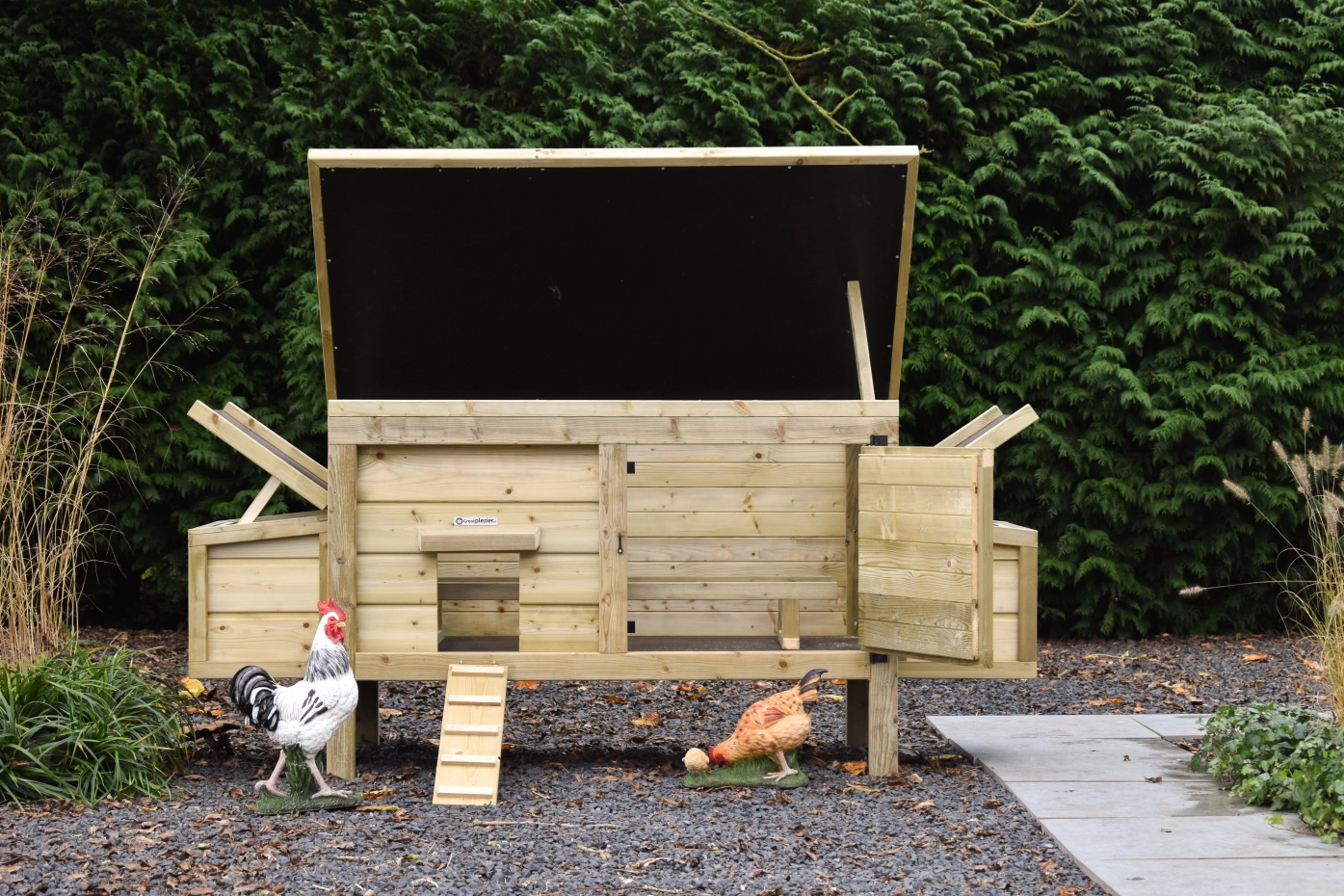 Dieses niedrige Modell mit 2 Legenestern lässt sich dank des schwenkbaren Dachs und der praktischen Tür an der Vorderseite leicht reinigen. Die Legenester verfügen ebenfalls über schwenkbare Dächer und eine leicht herausnehmbare Bodenplatte. Für ein schönes Detail an der Tür können Sie ein hübsches Holztier mitbestellen. Das verleiht dem Stall eine besonders charmante Ausstrahlung!