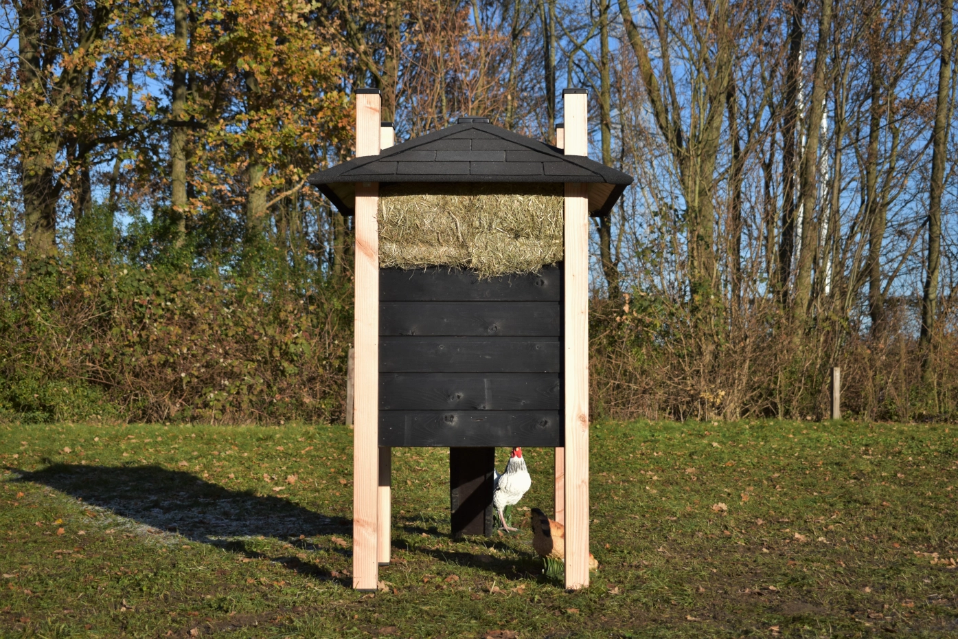Hühnerstall Heuhaufen Rosa ist ausgestattet mit Pfahlen aus Douglasienholz und hat schwarze Bretter. Dadurch ist diese Stall ein Erwerb für Ihre Garten. Diese Stall wird normalerweise mit Heu geliefert. Durch der große Türen ist der Stall leicht zu reinigen. Um die Farbe des Holzes zu erhalten, können Sie es mit Douglasöl behandeln. Ohne weitere Behandlung wird das Holz schnell vergrauen.