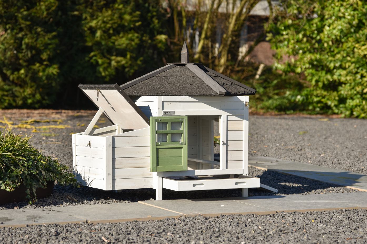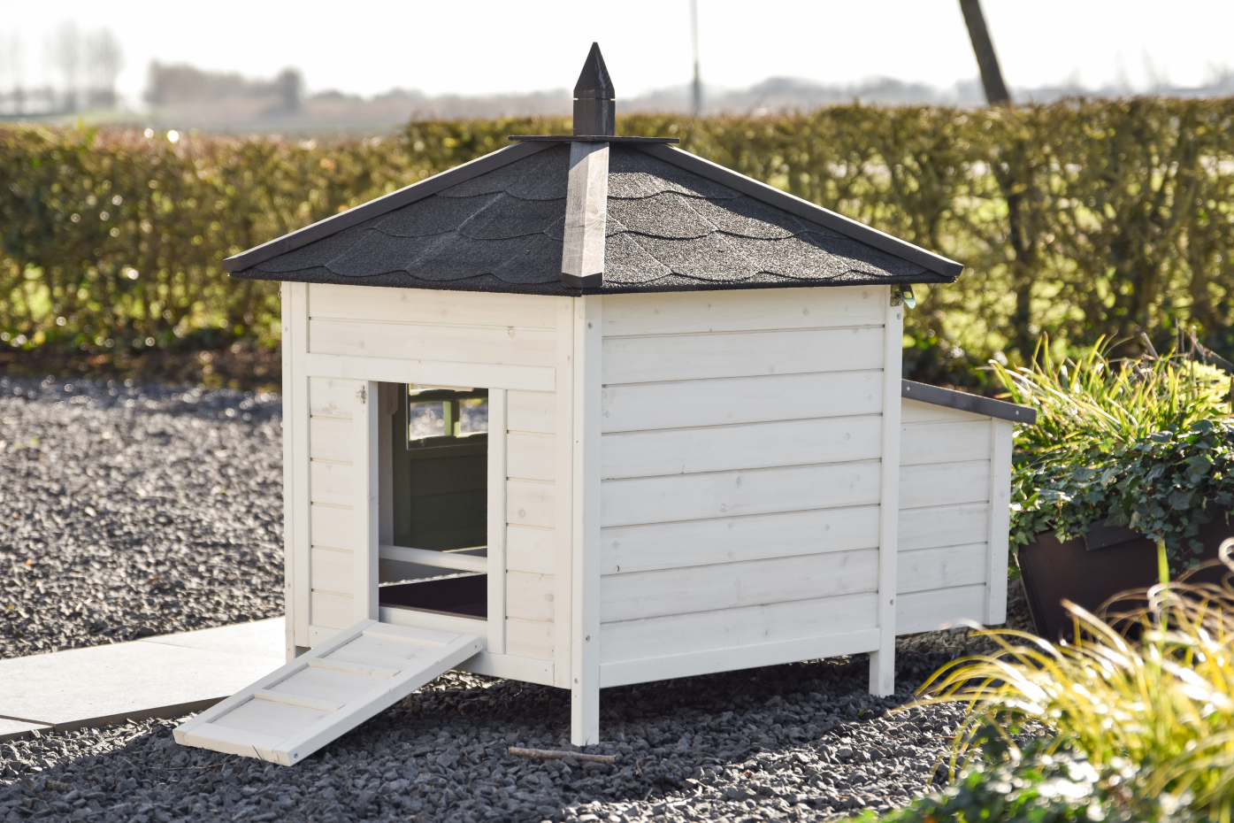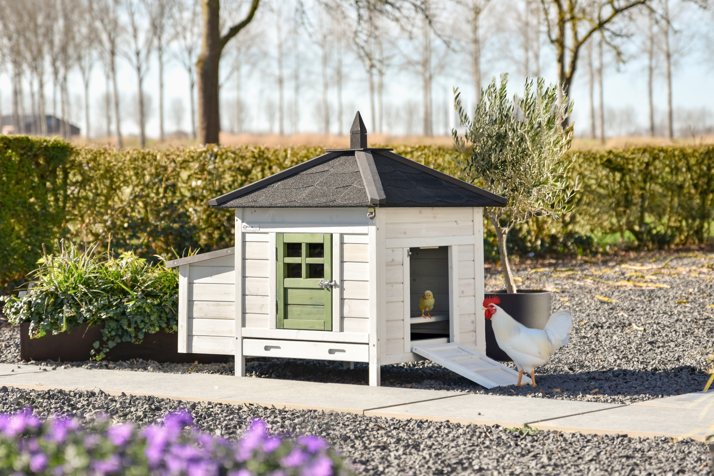 Hühnerstall Ambiance Small ist ein echter Blickfang im Garten und verbindet eine schöne Optik mit praktischem Gebrauch. Der Stall hat eine Kunststoff-Schublade, ein vollständig abnehmbares Dach zum einfachen Reinigen und eine Seitentür, die auch als Rampe dient. Der Stall passt gut in einen großen Hühnerauslauf, kann aber auch mit Anbau-Ausläufen erweitert werden, die speziell für dieses Modell gemacht sind. Hühnerstall Ambiance Small ist für maximal 4–8 Hühner geeignet und hat Außenmaße von 107x77x99 cm (BxTxH)