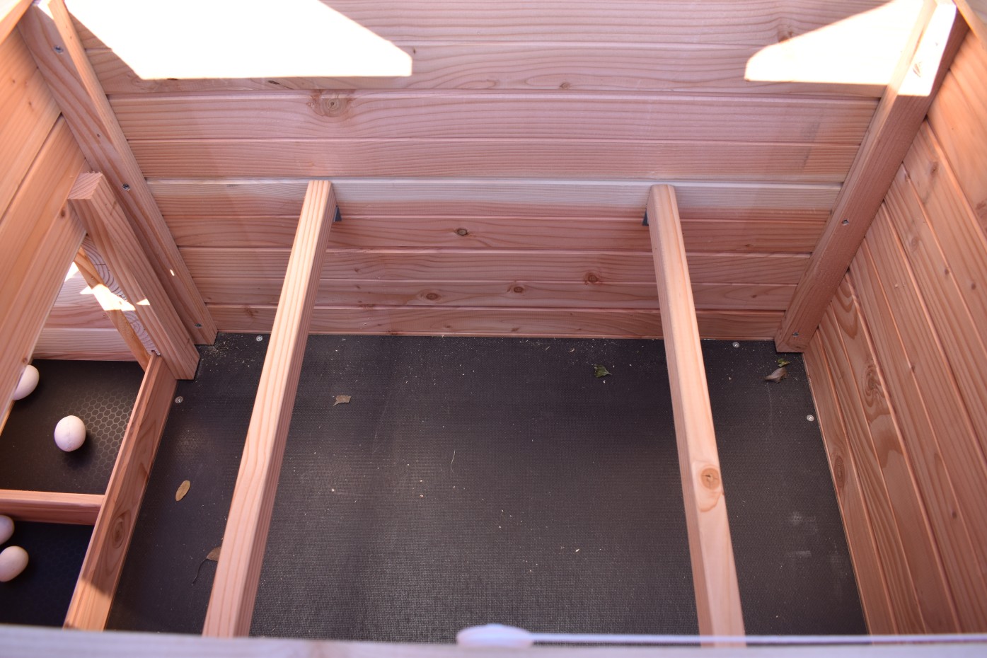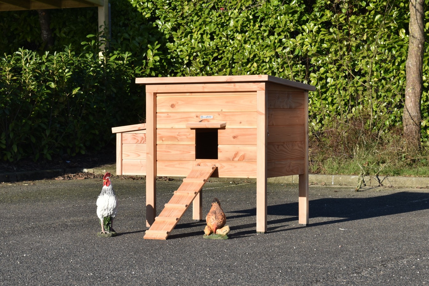 Da der Hühnerstall auf hohen Beinen steht, können die Hühner darunter Schutz finden – oder Sie können das Futter dort platzieren.