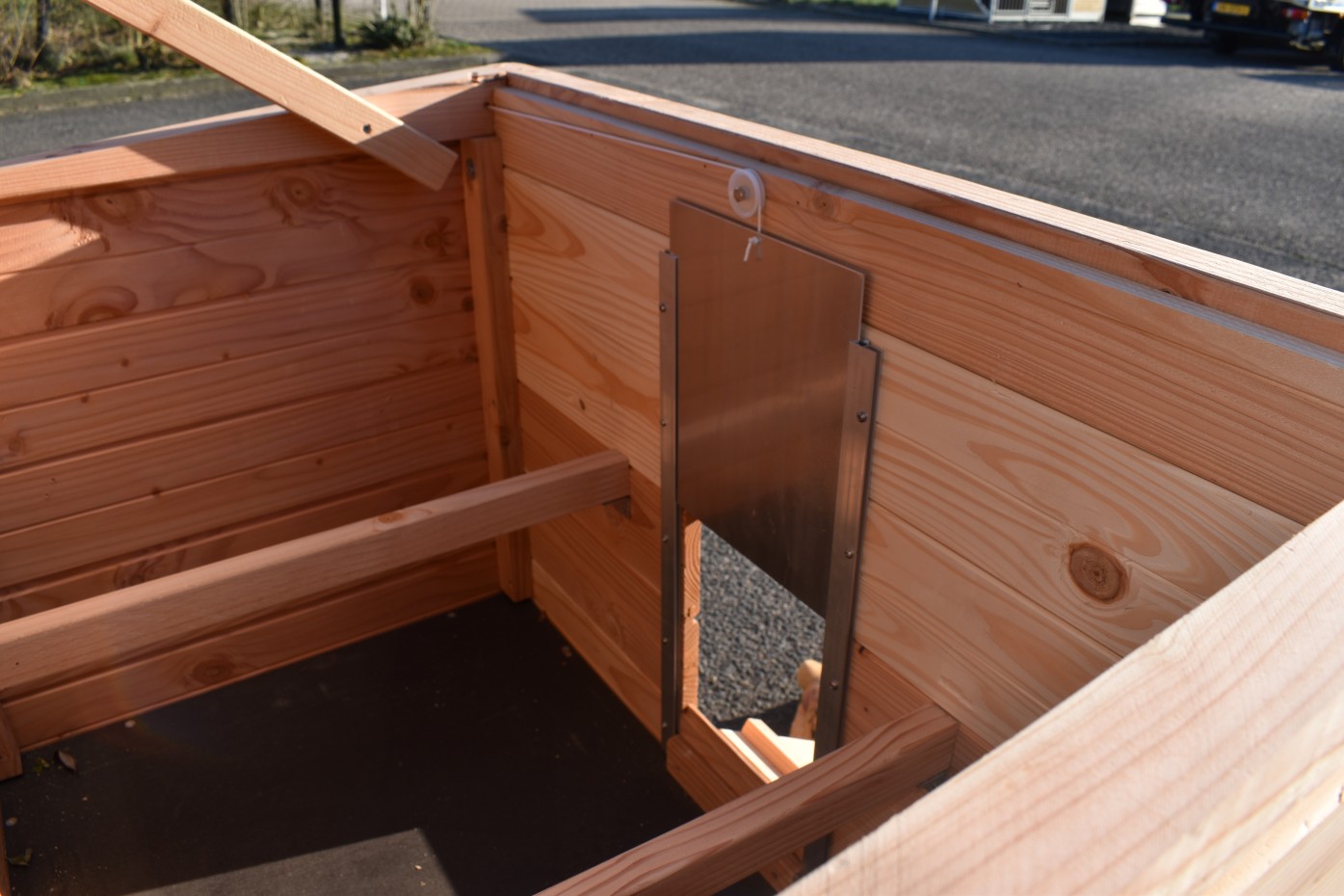 - Dieser Hühnerstall ist mit einem Legenest ausgestattet.
