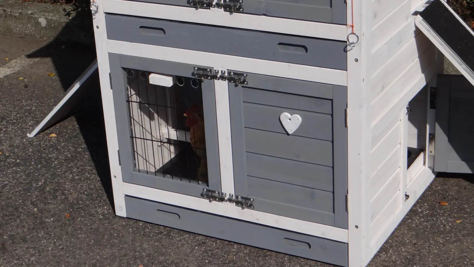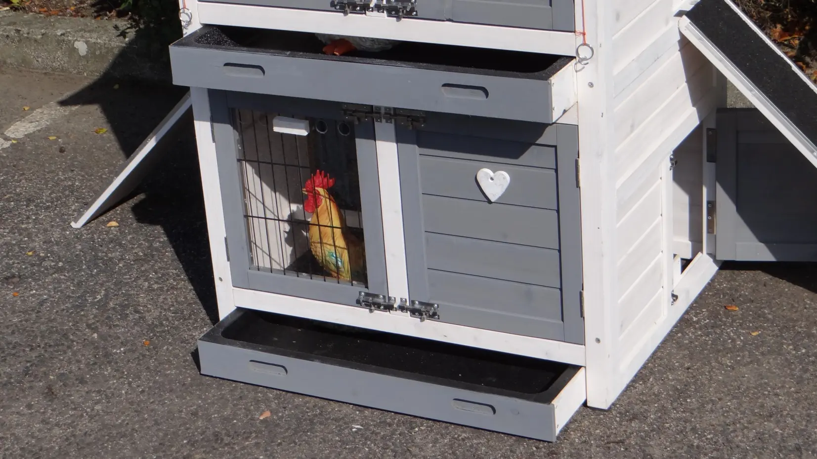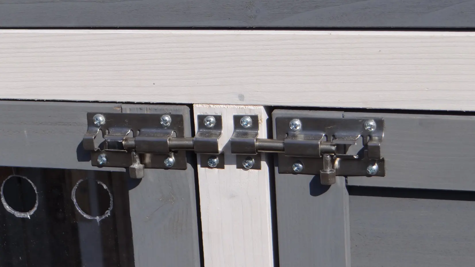 - Die Türen dieses Kaninchenstalls sind mit doppelten Schieberiegeln ausgestattet