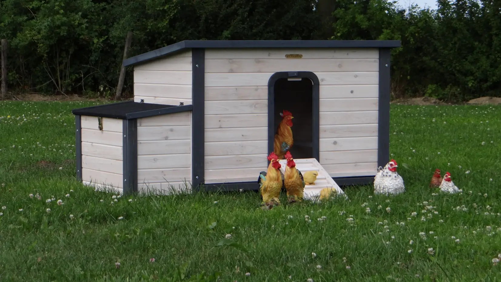 - Dieser Hühnerstall ist mit einem Legenest ausgestattet.