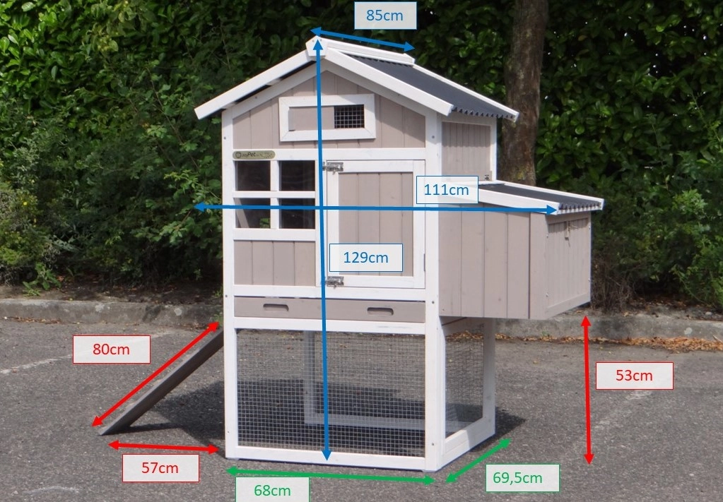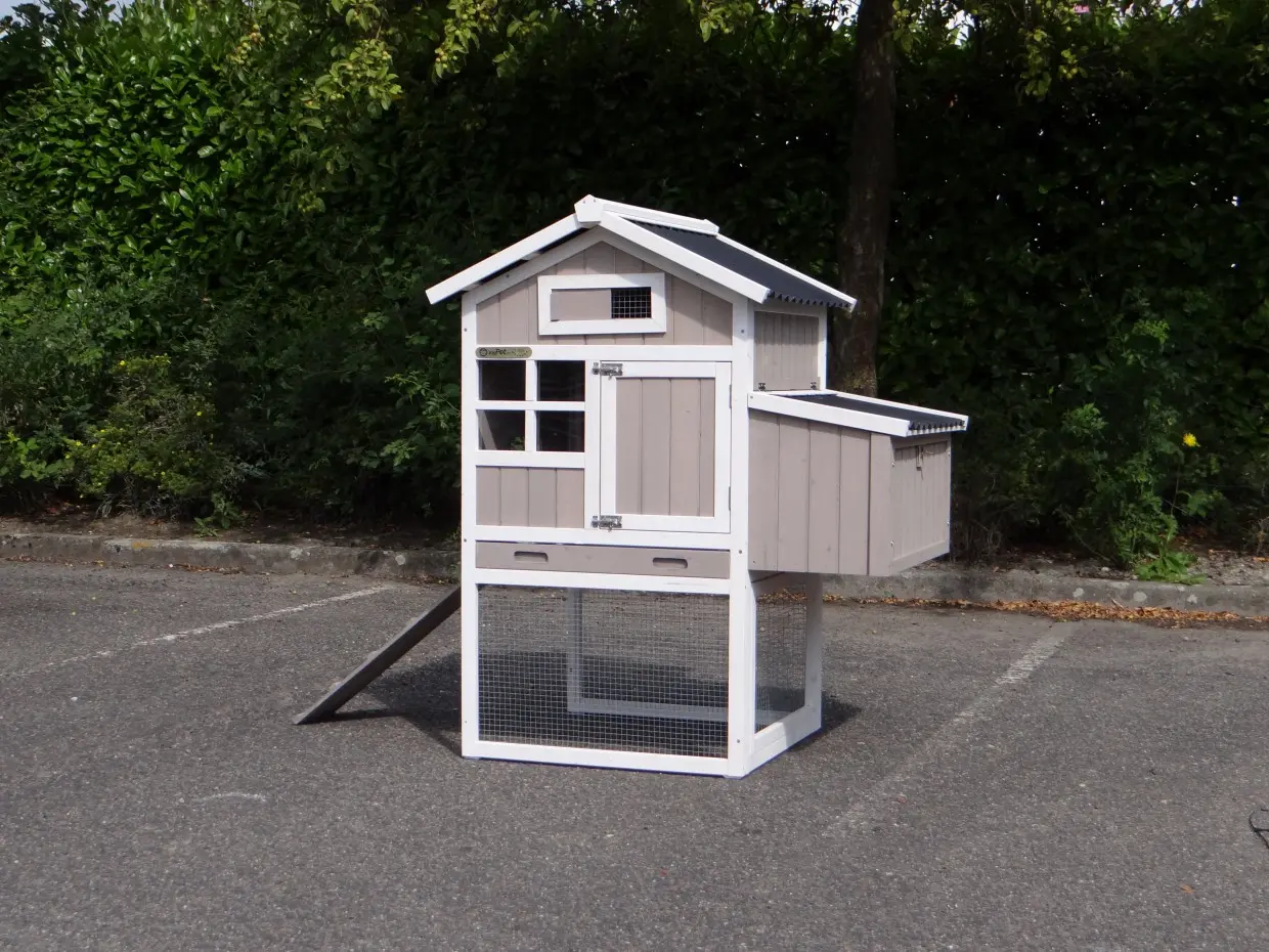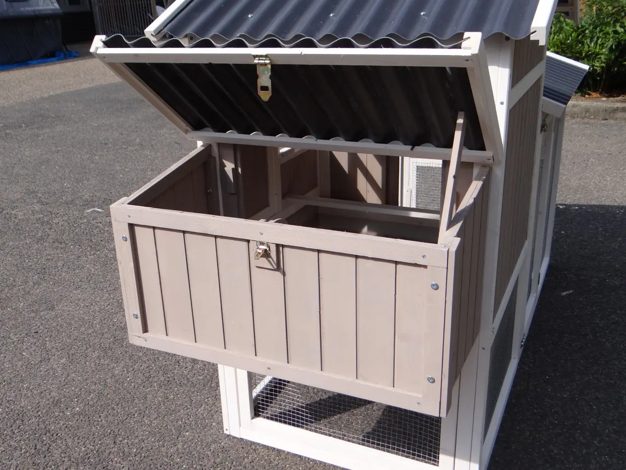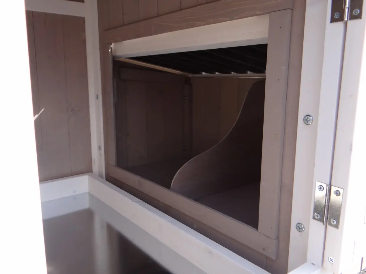 - Dieser Hühnerstall ist mit einem Legenest ausgestattet.