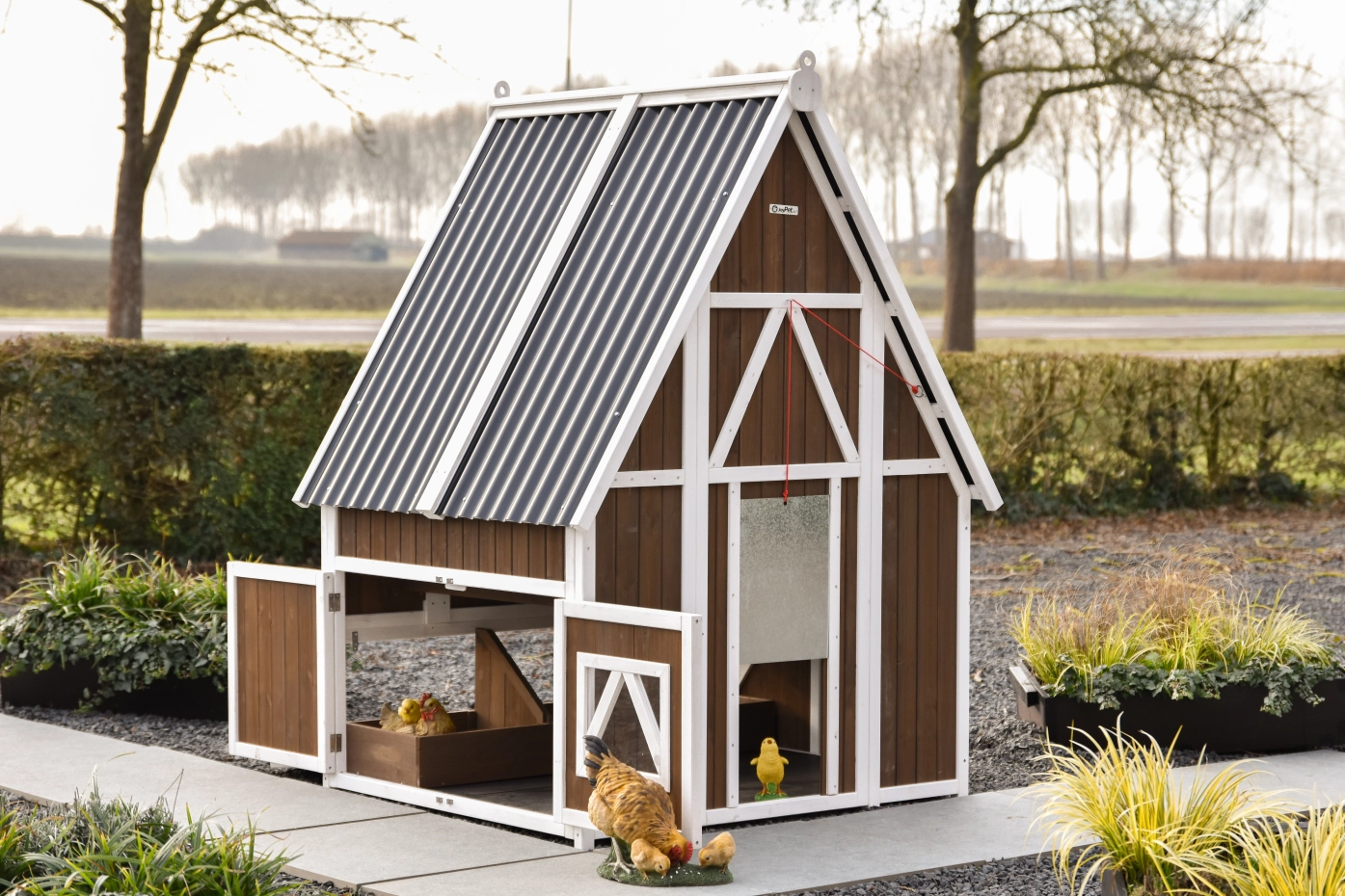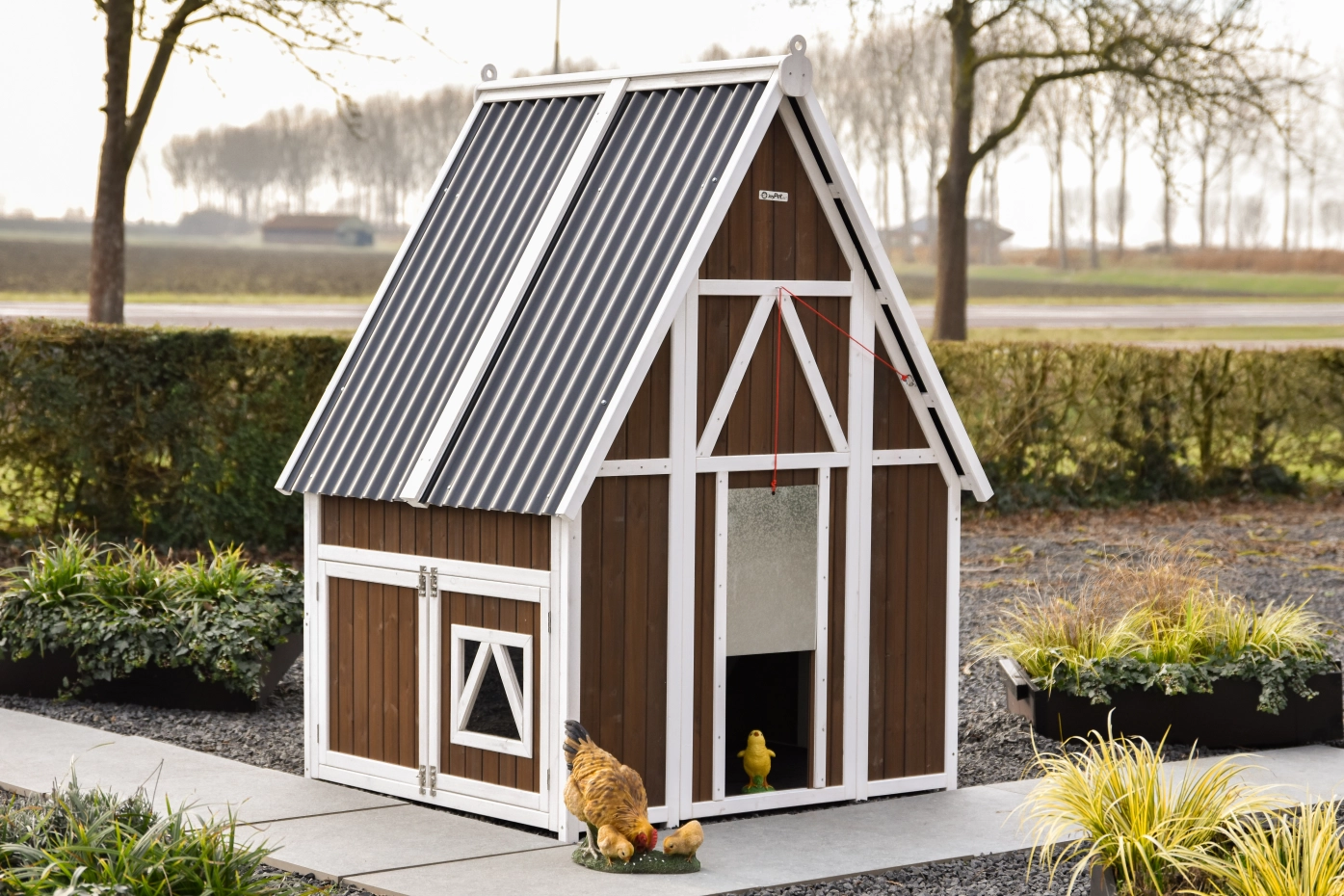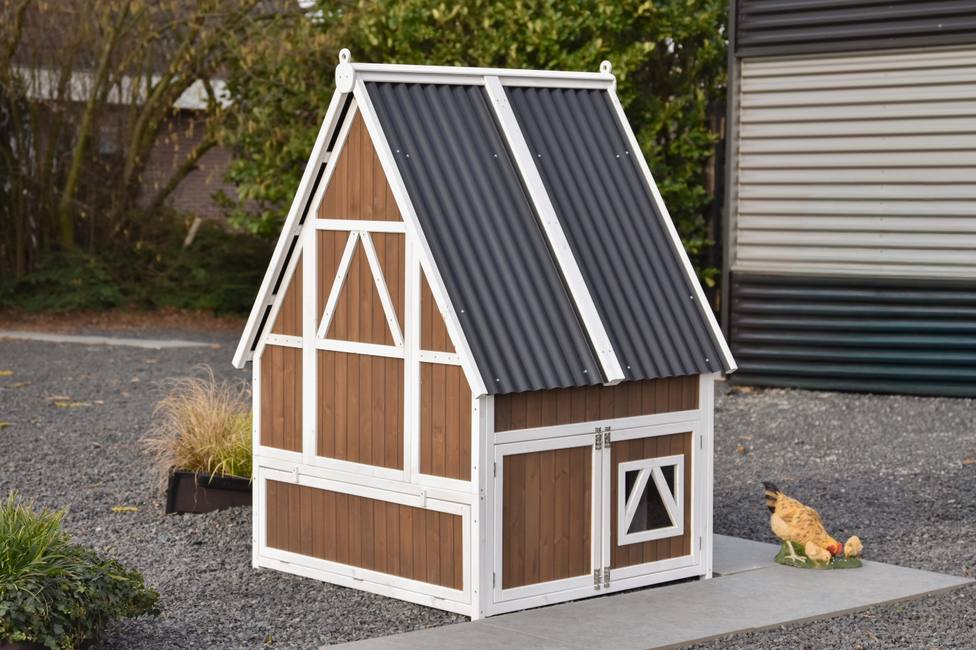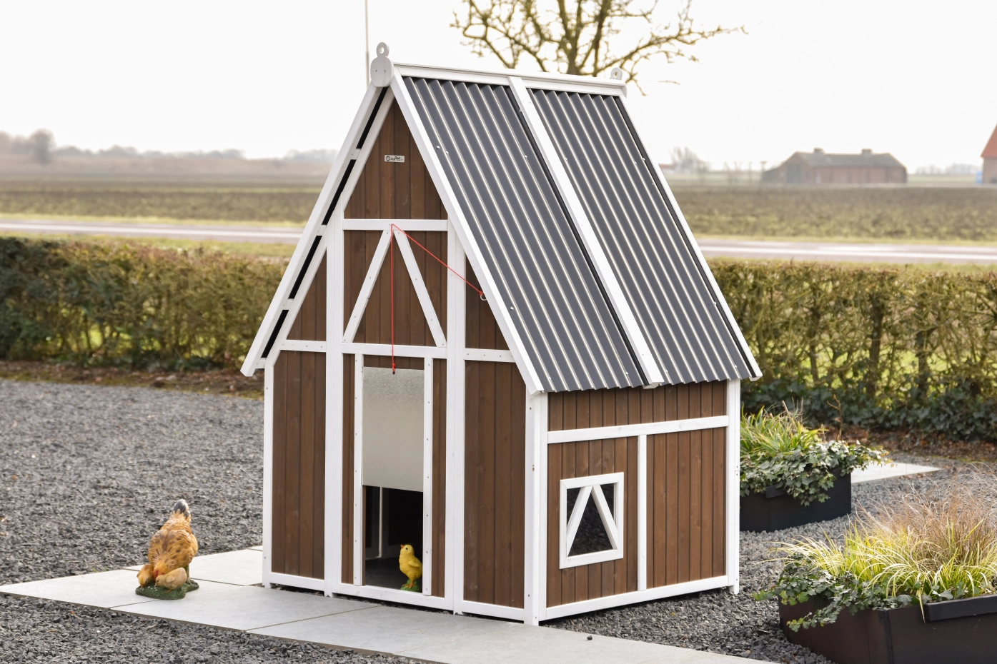 Hühnerstall Pip ist ein großer und komfortabler Hühnerstall mit klassischem Satteldach, geeignet für die Haltung von 10 bis 20 Hühnern. Da der Stall bis in den Giebel offen ist, können die Hühner wunderbar hoch auf der Stange sitzen und der Raum wird optimal genutzt.