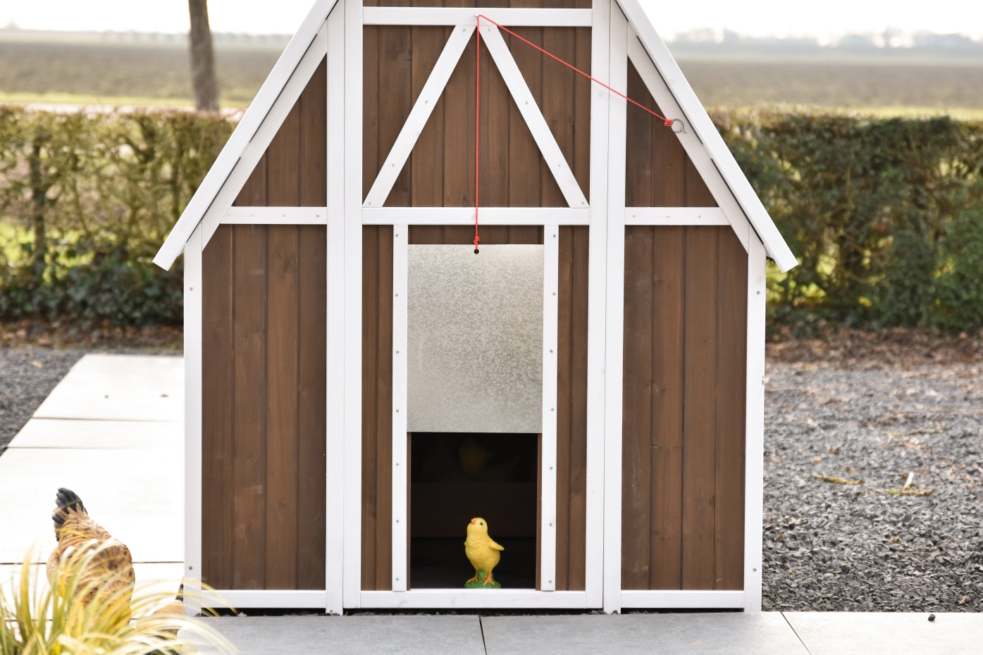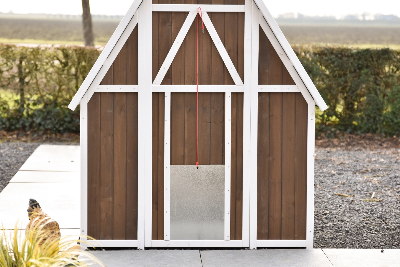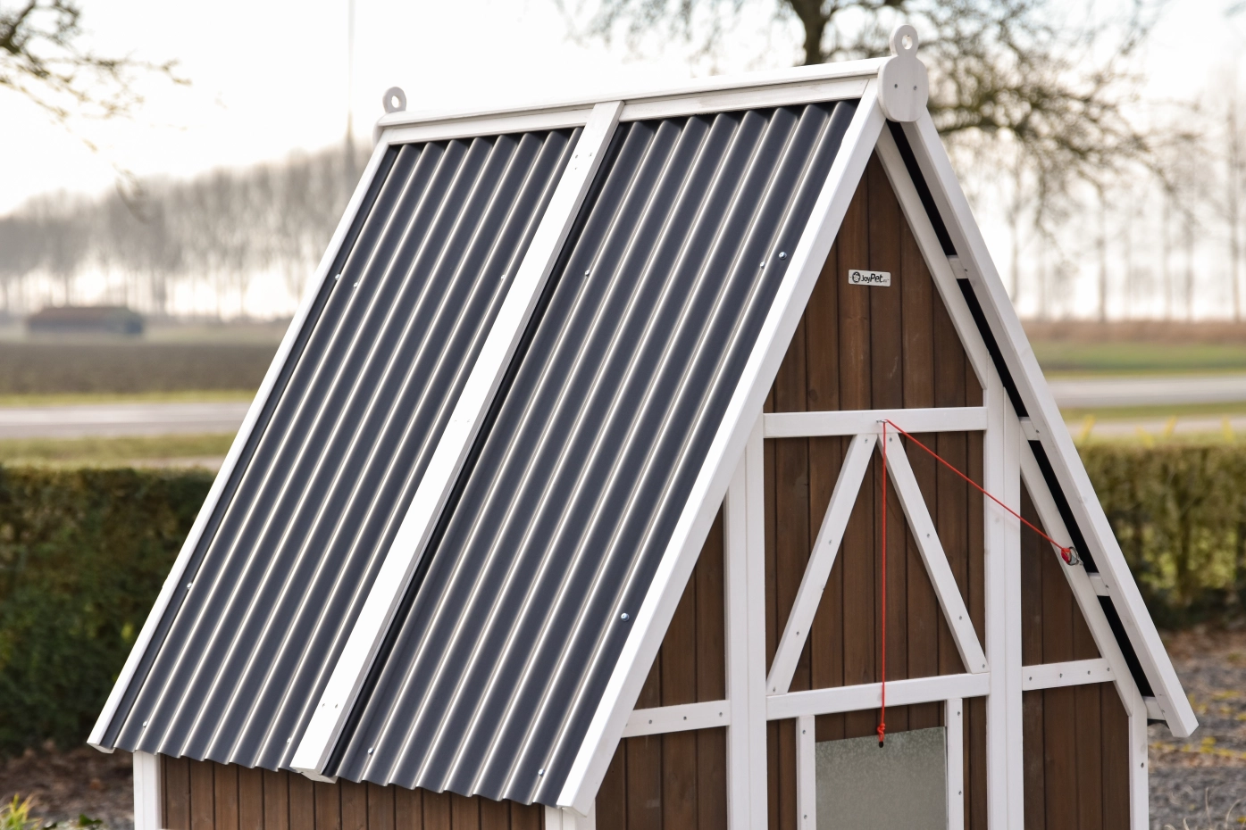 Der Stall kann mit einer Aluminium-Schiebetür sicher verschlossen werden, die sich leicht mit einem Seil bedienen lässt. Das Dach aus Kunststoff-Wellplatten schützt zuverlässig vor Regen und anderen Witterungseinflüssen.