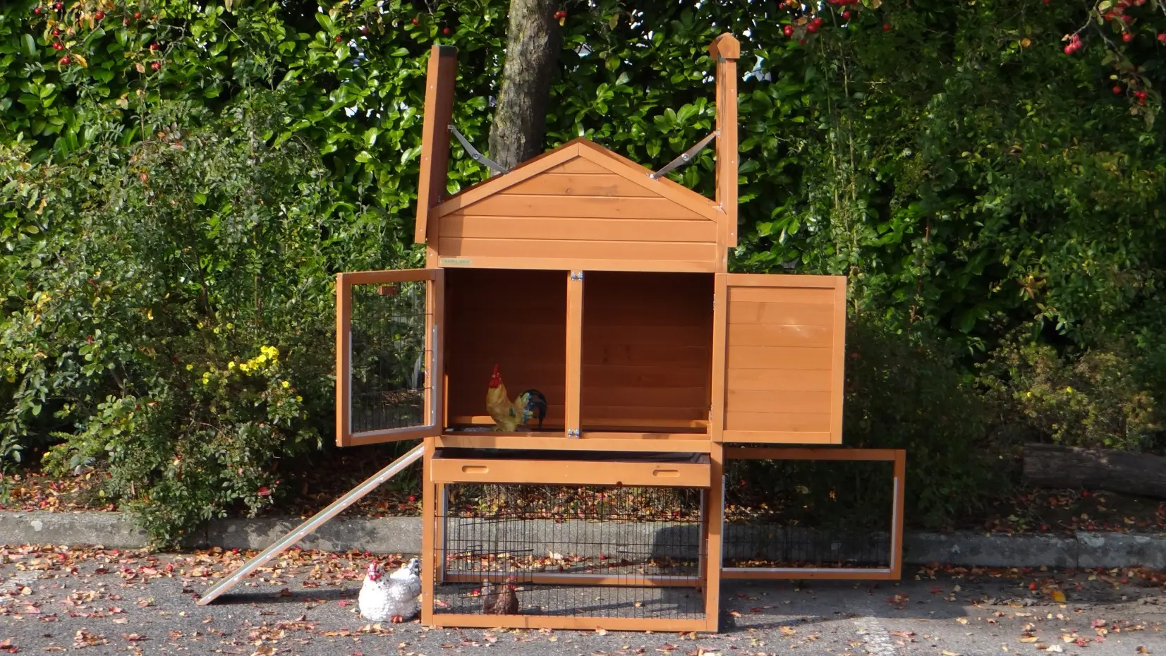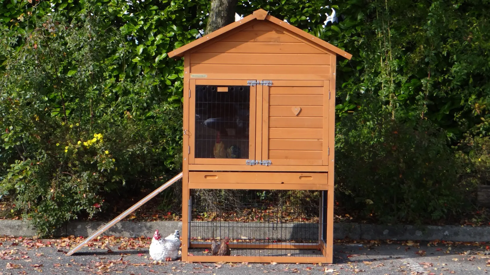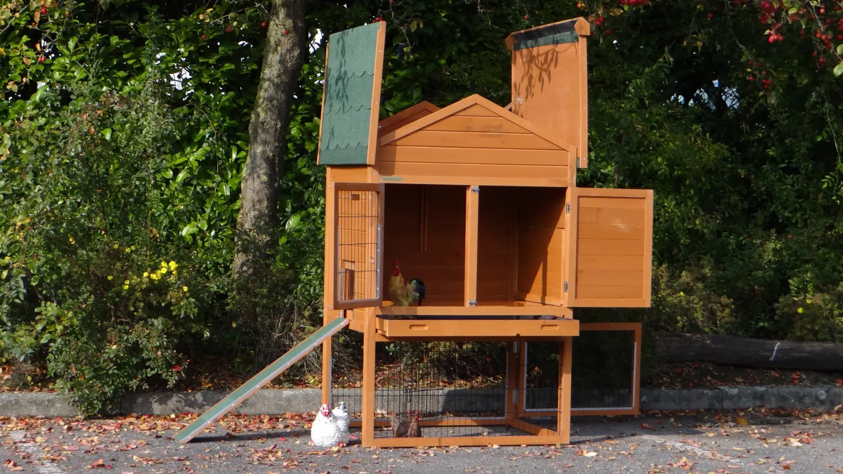 Dieser praktische Hühnerstall ist bis ins Detail perfekt verarbeitet, mit großzügigen Türen und einem geräumigen Schlafabteil, das mit zwei Sitzstangen ausgestattet ist.