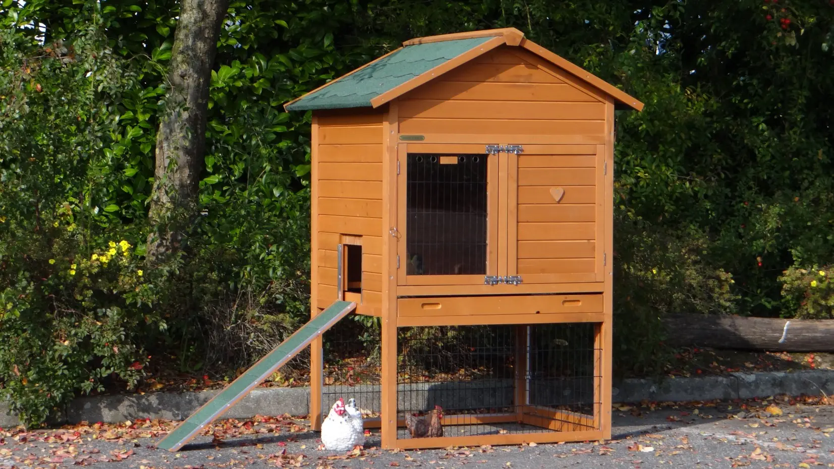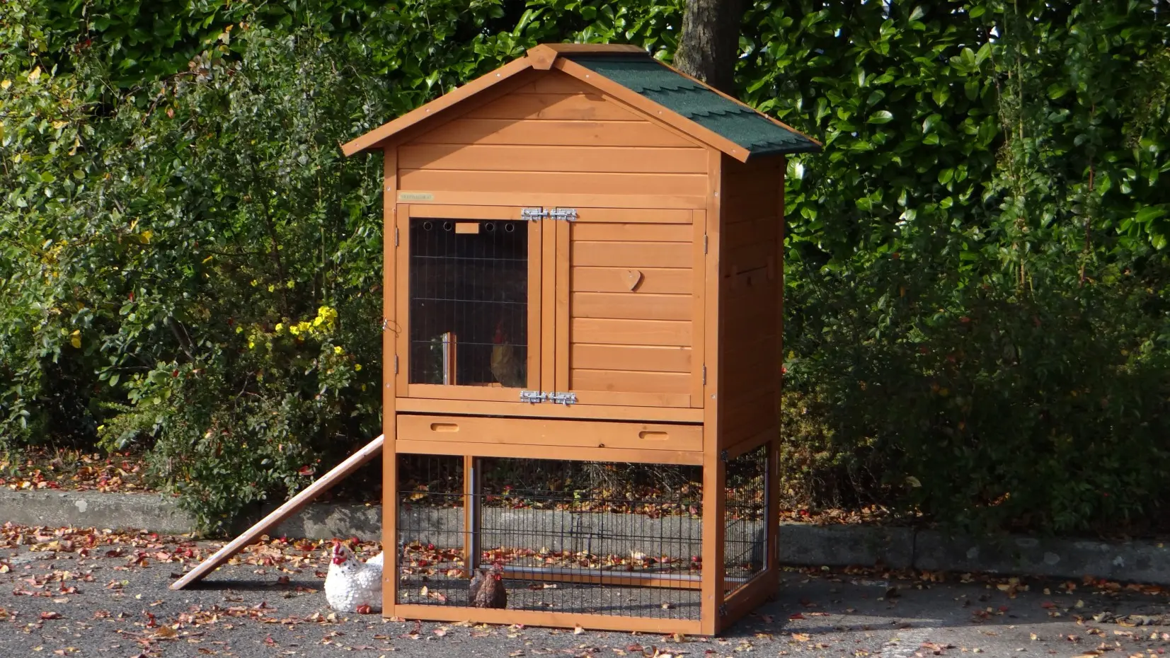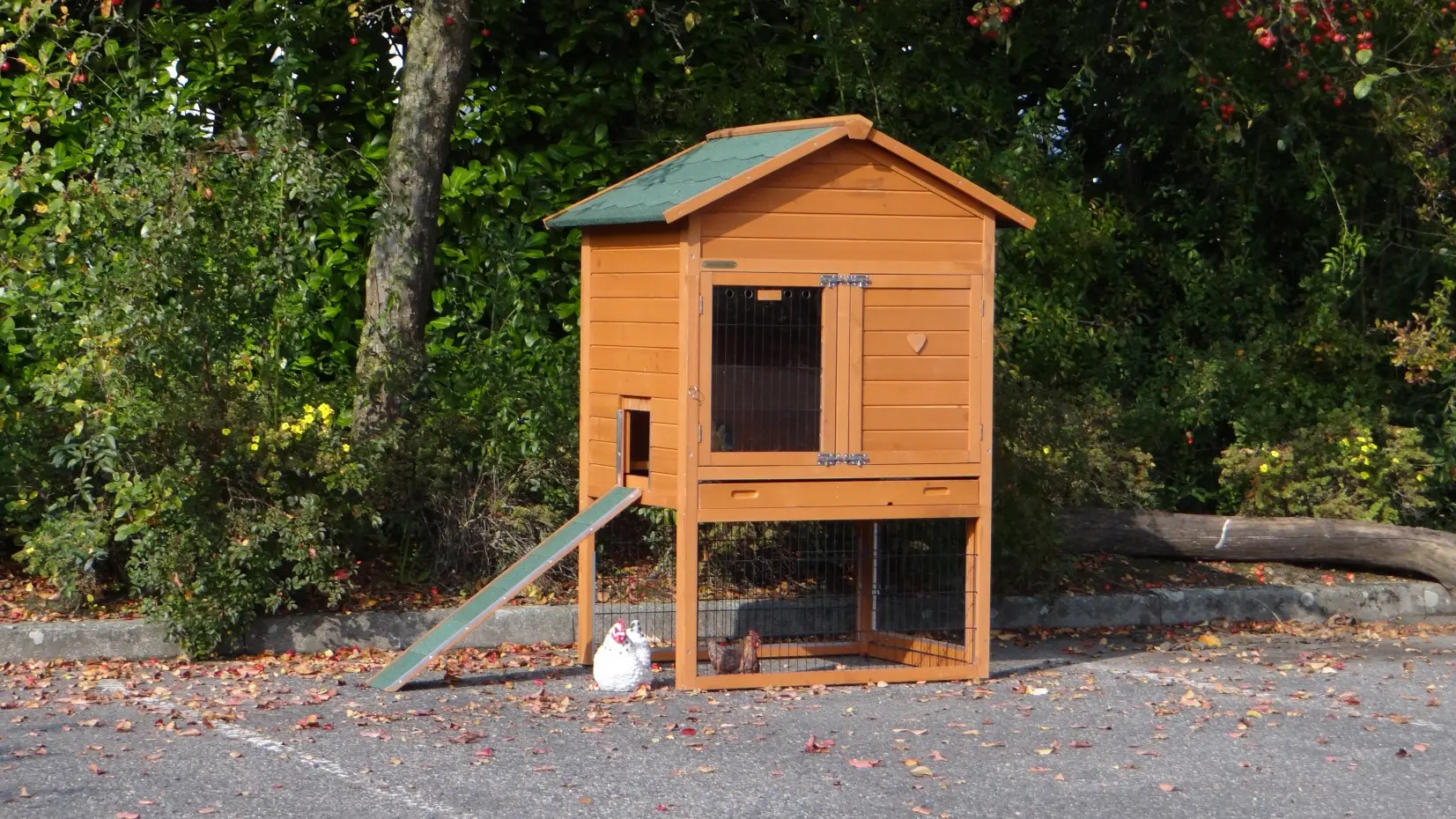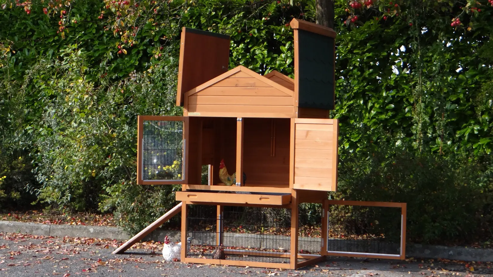 Dieser praktische Hühnerstall ist bis ins Detail perfekt verarbeitet, mit großzügigen Türen und einem geräumigen Schlafabteil, das mit zwei Sitzstangen ausgestattet ist.