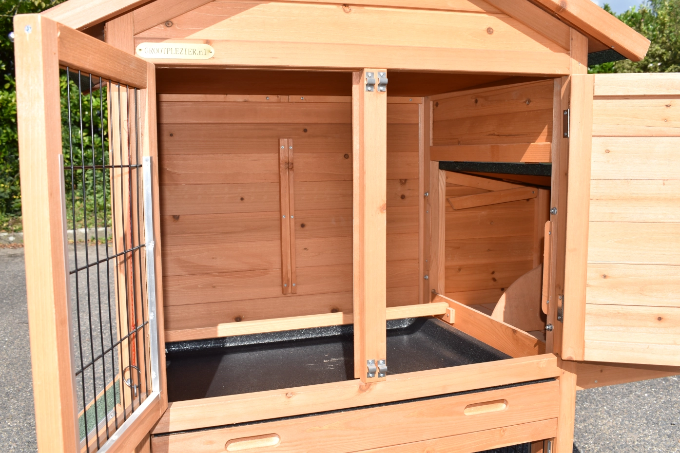 Dieser Hühnerstall ist bis ins Detail hochwertig verarbeitet, mit großen Türen, einer praktischen herausziehbaren Schublade und einem Schlafabteil mit einer Sitzstange.