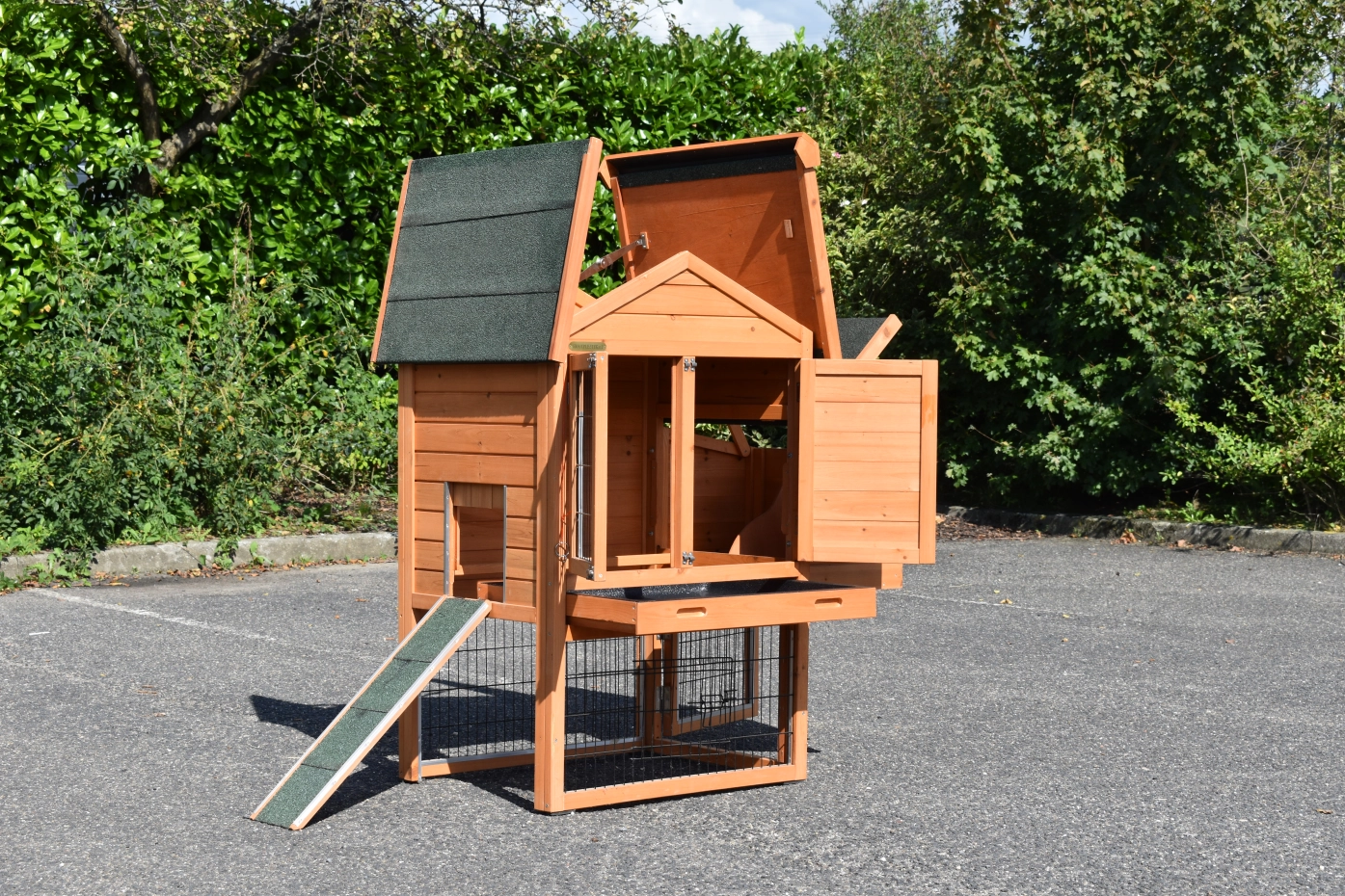 - Das Dach dieses Kaninchenstalls ist mit Dachpappe versehen.